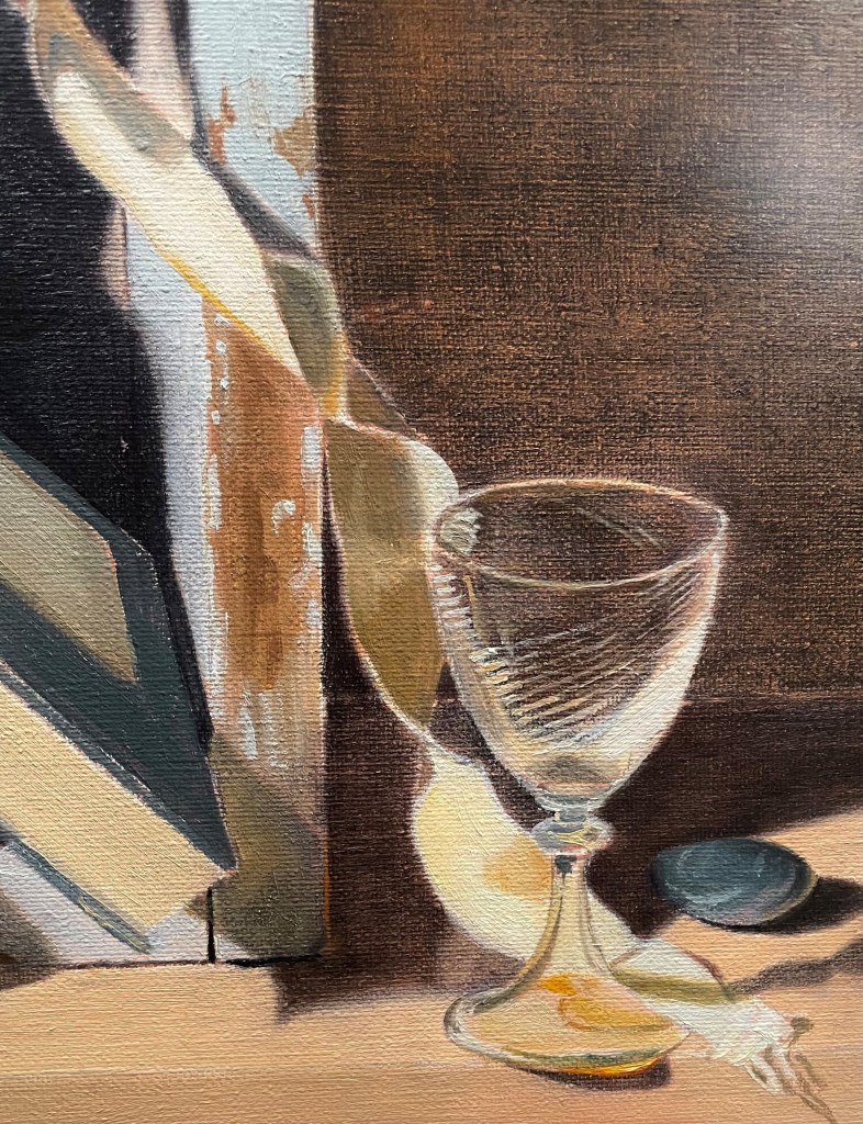 Though it was daunting, I took a first stab at the glass. You can see a shot of it below. I began to paint the swirling pattern on it’s body, and a few details on the stem. I’ll return to this many times, but it felt good to make a start. I did a bit of work on the ribbon, and added some details on the box rim. I put another layer of paint on the blue stone.