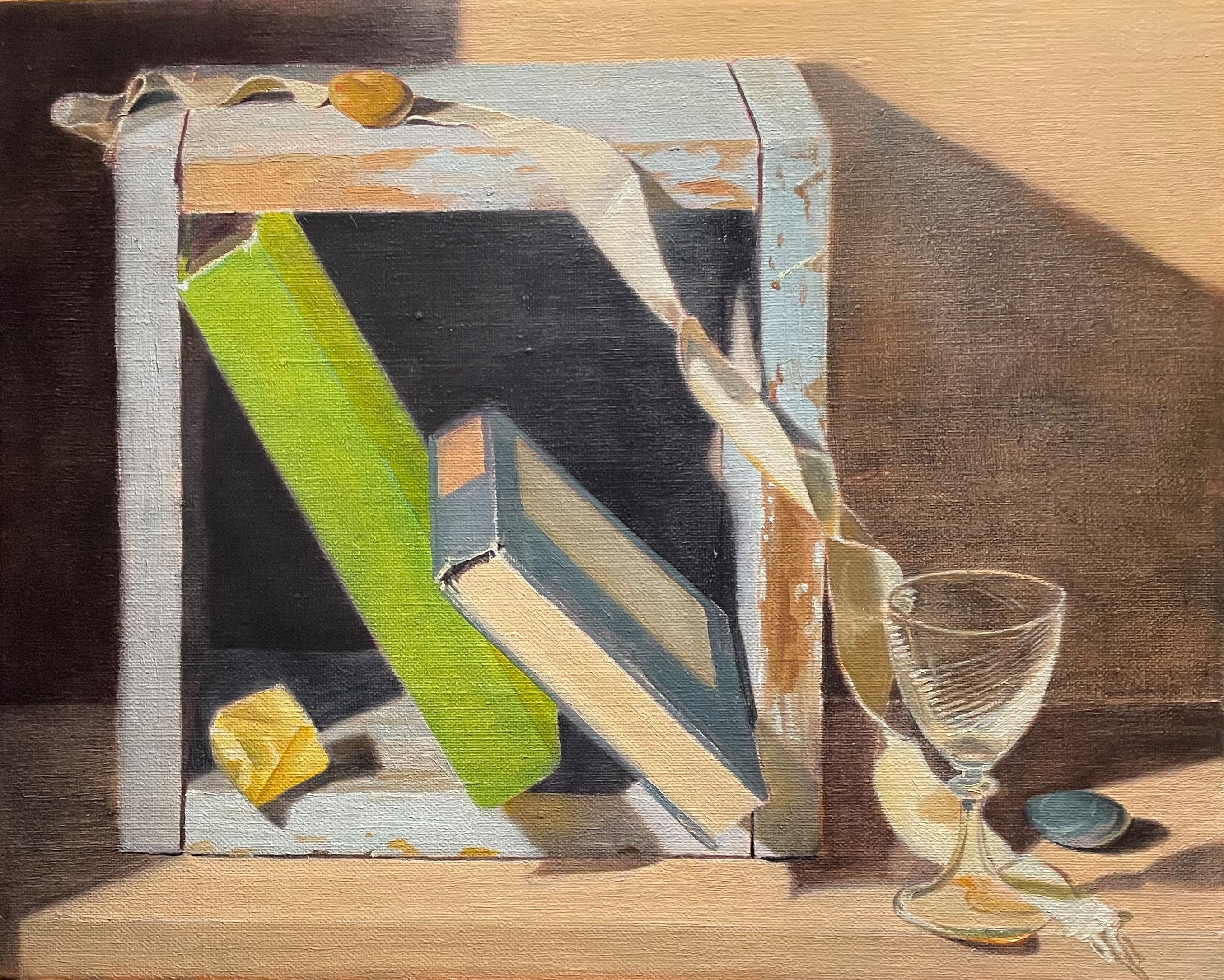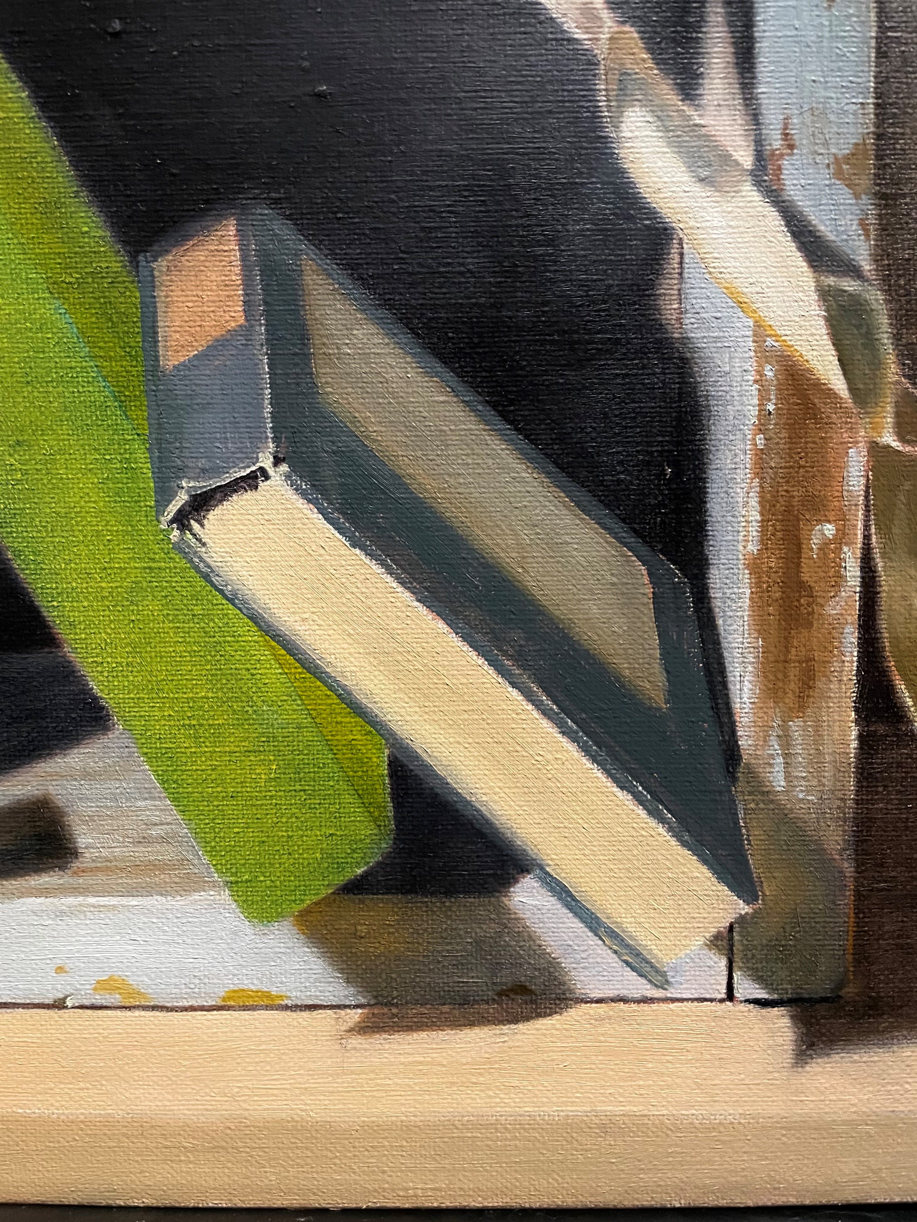 Below, I’ve added a glaze of ultramarine blue and raw umber to the shadow areas, and corrected the blue book, which had been too narrow. I had corrected this a bit at the last session, but the spine was still too narrow. I built out the left side a bit, and re-centered the label. I added a few details at the top and roughed in a shadow cast by the cover onto the pages. I lightened and warmed up the shadow cast by the green book onto the bottom front of the box, and added some warm bits and nicks to the box’s edge.