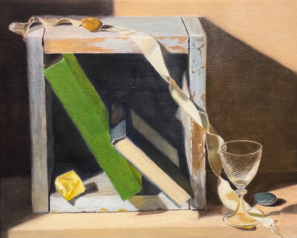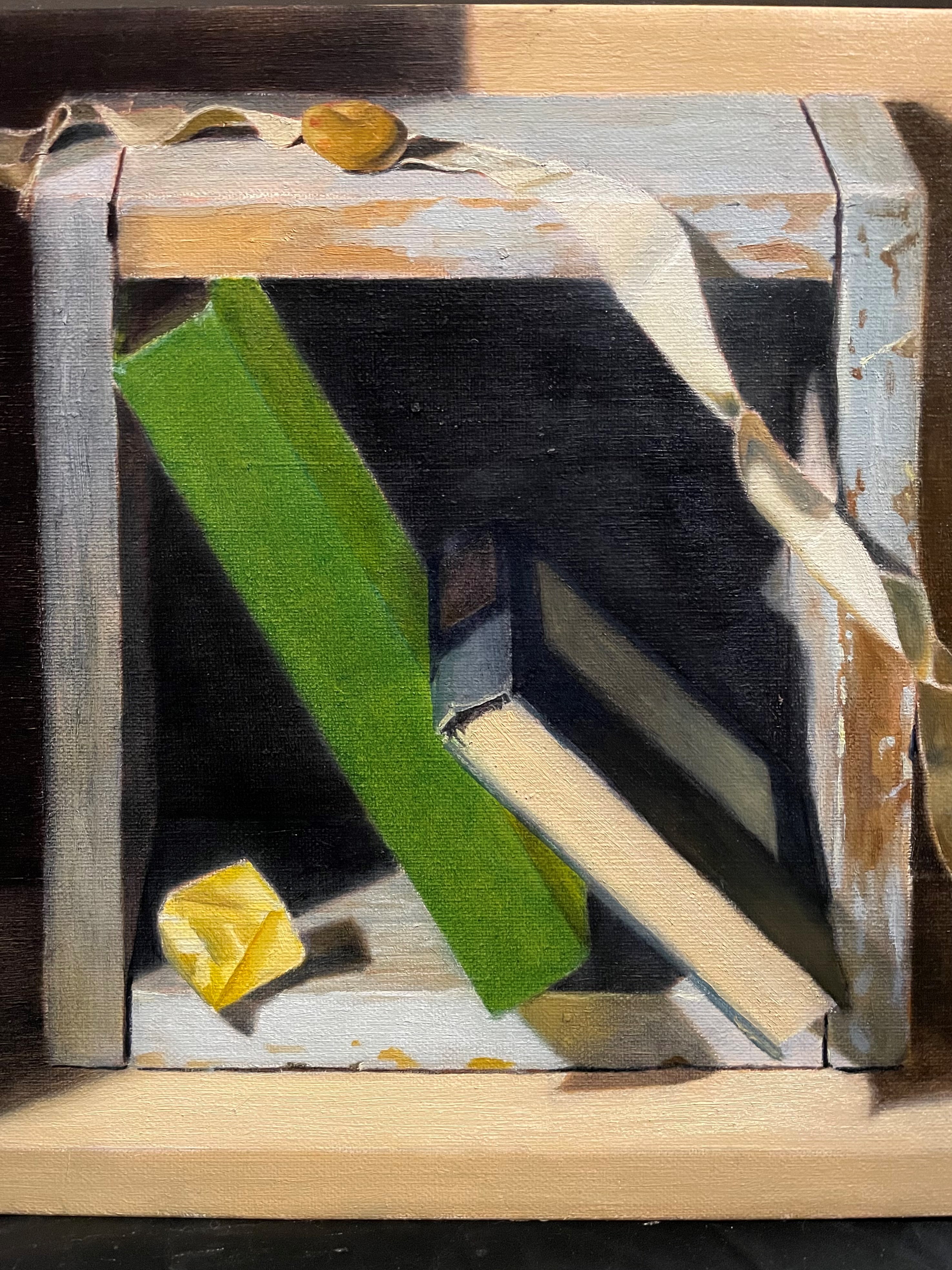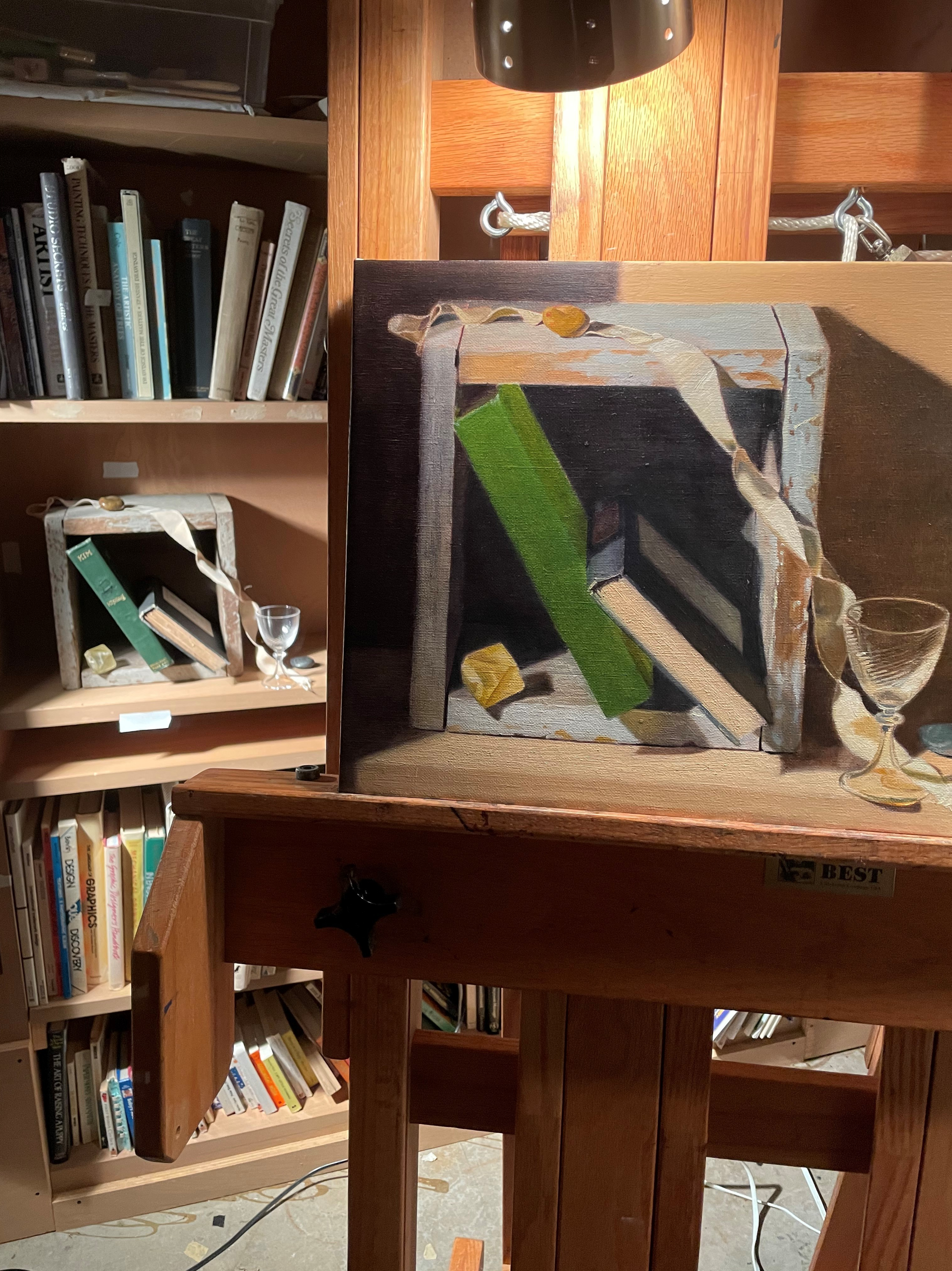 I darkened the interior of the box with a glaze of ultramarine blue and raw umber with a touch of alizarin crimson. I also darkened the wall on the right and the left of the box. I added another green glaze to the green book. I want to get the color just right, so I’m darkening this gradually. I glazed the blue book to get it closer to it’s correct color and value. I glazed the left vertical edge of the box to darken it a bit.