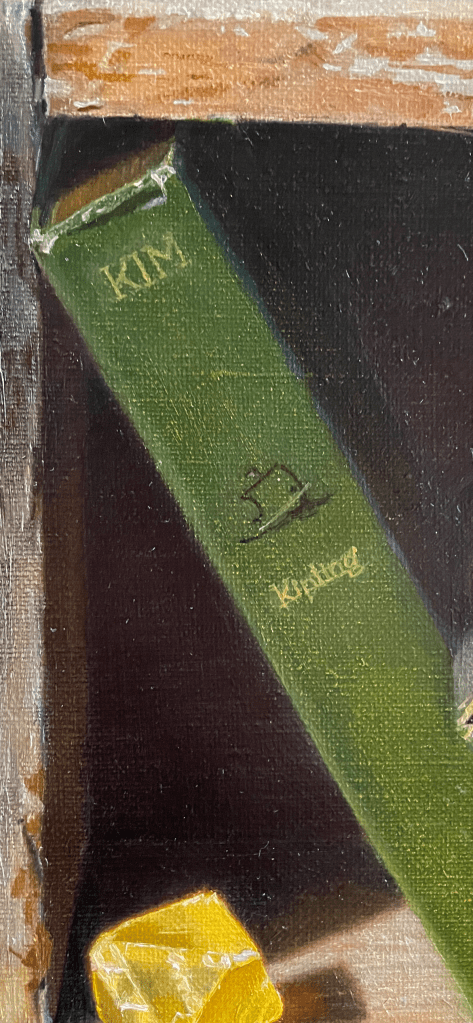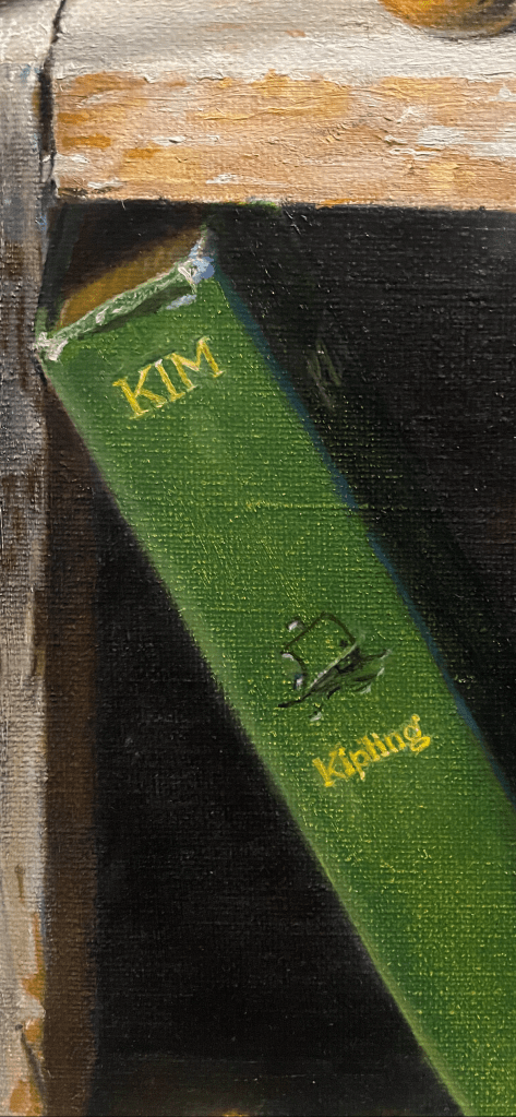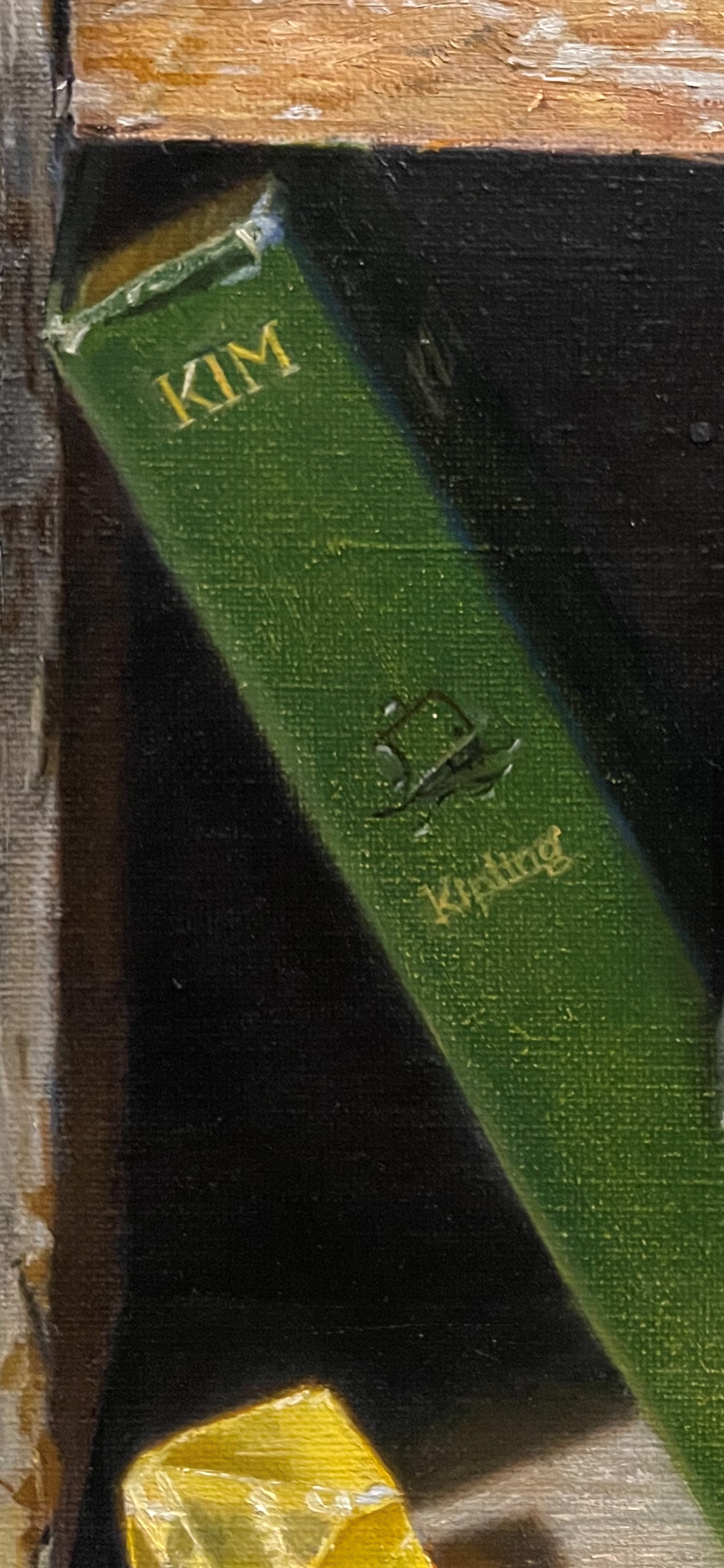 It’s tempting to just paint in a generic version of each letter, but it looks much better when you pay attention to the particular font and its look. It helps to look at the space between each letter, too, not just at the letters. The trick is to see the shapes, and not depend on your previously-formed idea of what letters look like. I mix up the color of the book, and the color of the type. I switch back-and-forth between them, using the color of the book almost like an eraser, teasing the paint to perfect each letter. I try not to get too obsessive about this. It doesn’t fit into my style of painting to be super-exact and make the painting like a photo. This is an oil painting, after all, and I like for it to look painterly. After all, from the distance I’m viewing the book, the letters aren’t super-clear. Its never a good idea to paint more detail than the eye could really see! (In this photo, you can also see an example of just suggesting lettering in a shadowy area on the front cover of the book.)