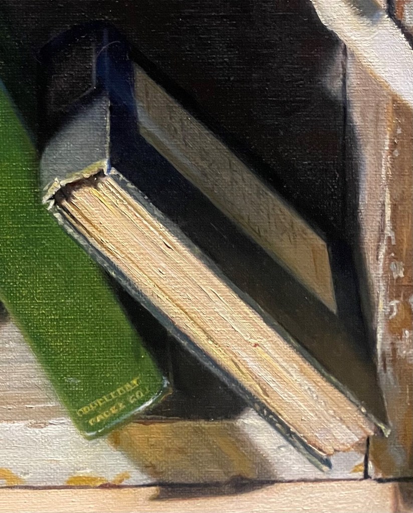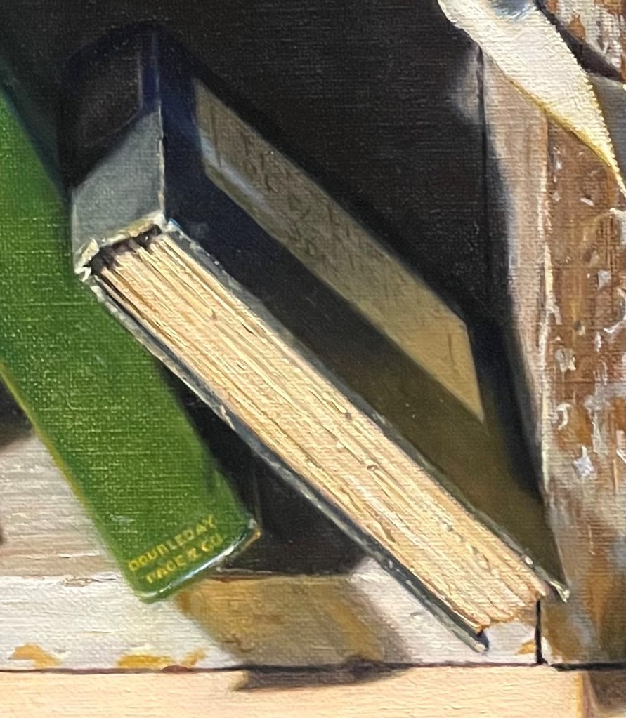 Below, I took a shot at indicating the lettering on the front of the book. These letters were hardly visible, so I’m not even going to try to actually letter them. I never like to paint a detail that I can’t actually see from where I’m observing the set-up!