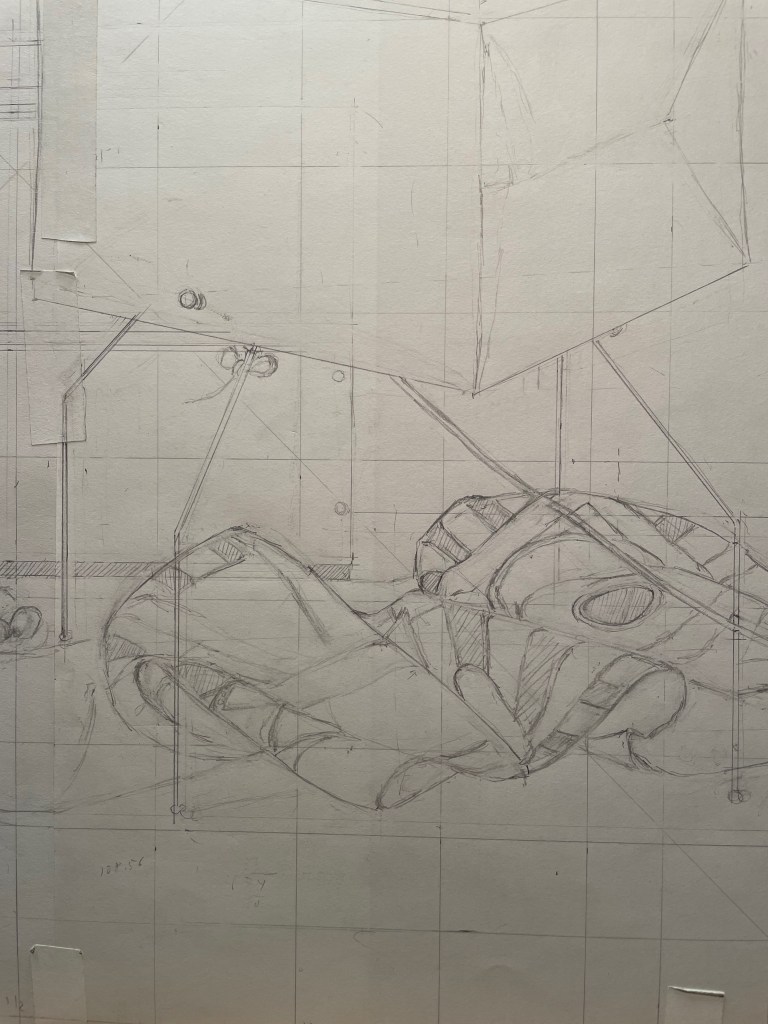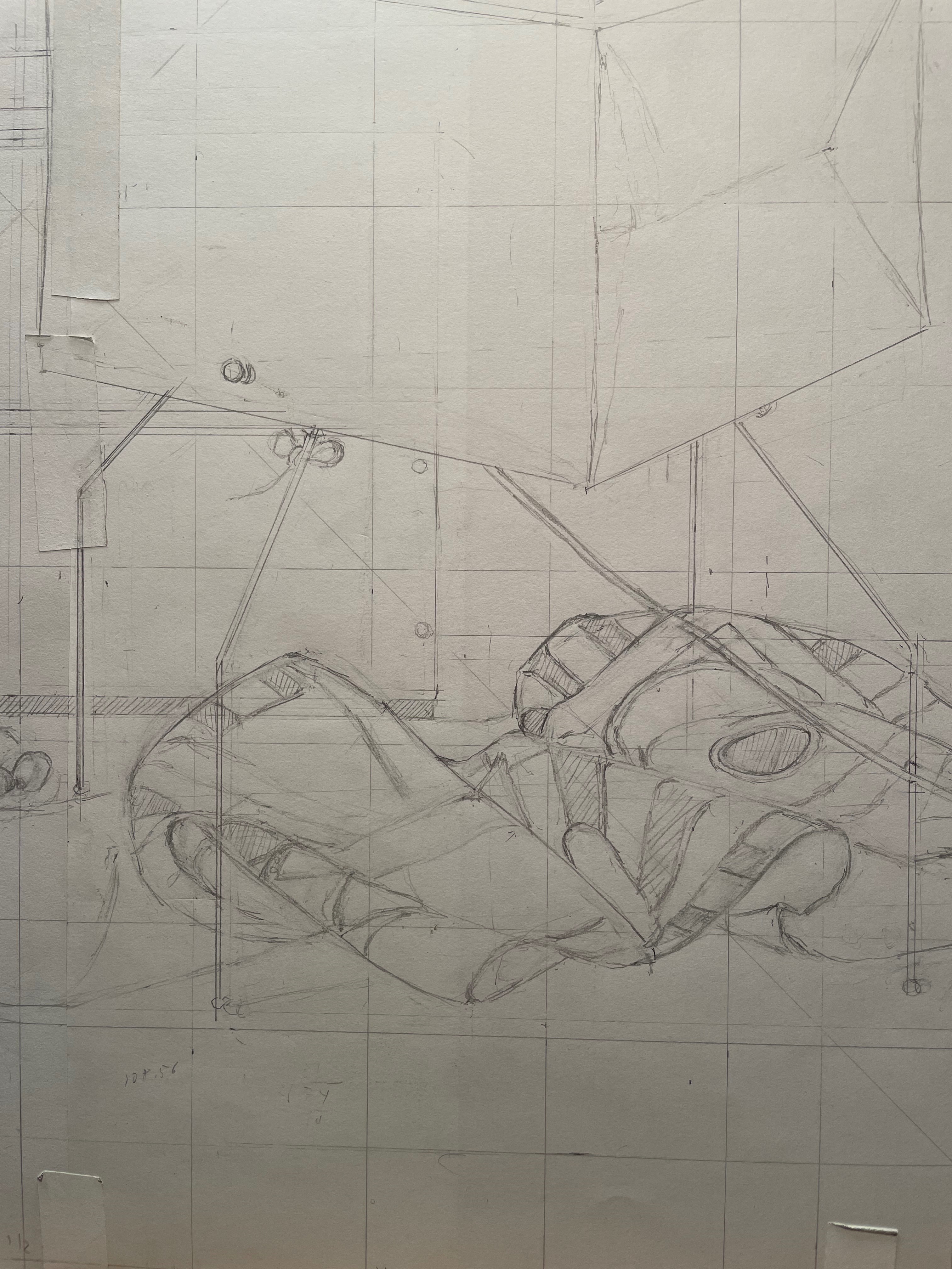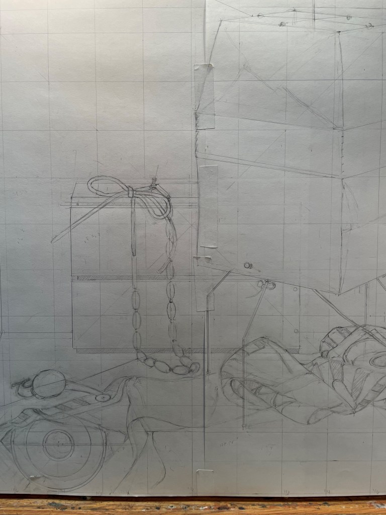 The drawing is just about at the stage where I can pause and do my value study in oil. At my next session, I’ll work on the beads a bit more and continue with the scarf patterns, but I won’t finalize anything until I’ve done the study. If I end up wanting to change the composition as a result of the study, I don’t want to have wasted a lot of time drawing things that would then need to be re-drawn.