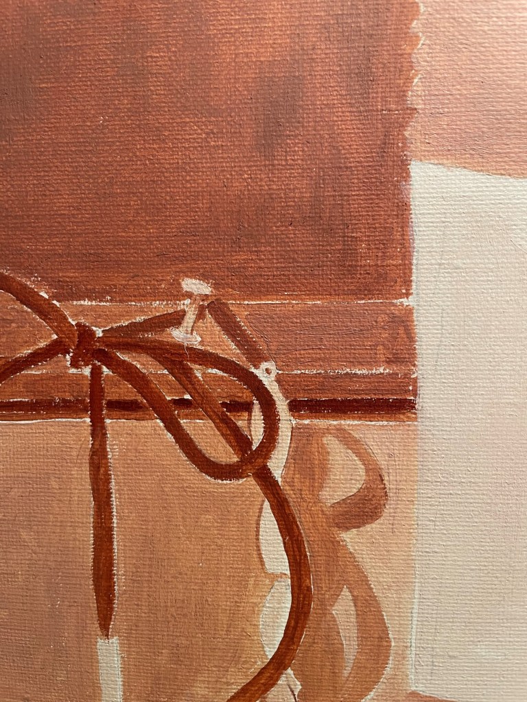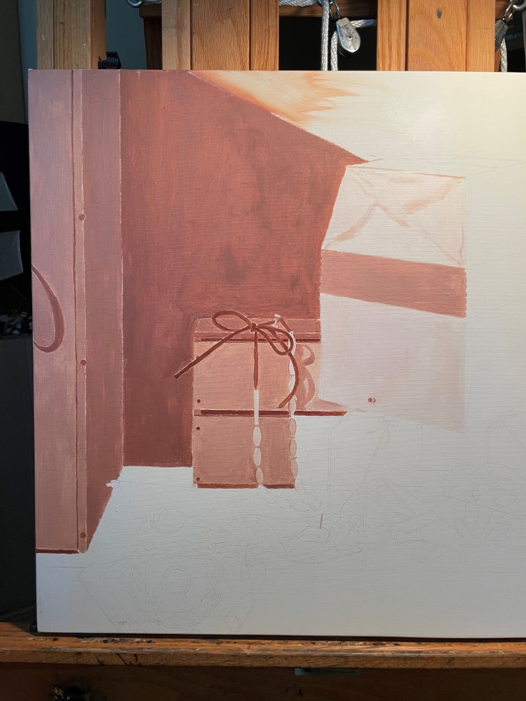 I transferred my drawing to the canvas and lightly sprayed it with fixative. I mixed up 9 values of burnt sienna and lead white, and began the underpainting. The purpose of an underpainting is manifold. Firstly, it gets me painting in an low-pressure way. There is no color variation, texture, subtle lighting effects, or even exact values to think about. All I have to do is cover the canvas with paint while retaining the drawing. It’s easy. It also takes away the stark white of the canvas, so it’ll be easier to judge color and value when the time comes. Lastly, it provide a consistent color under the top layers, harmonizing the finished painting.