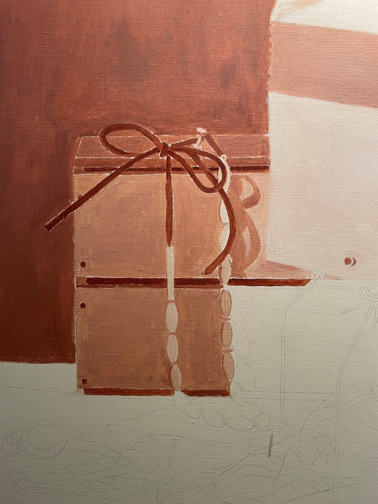 This is a big canvas. so covering it with paint takes a while. This is as far as I got after a day of work. Considering how complex the pattern on the scarf is, I probably won’t finish it at my next session either.