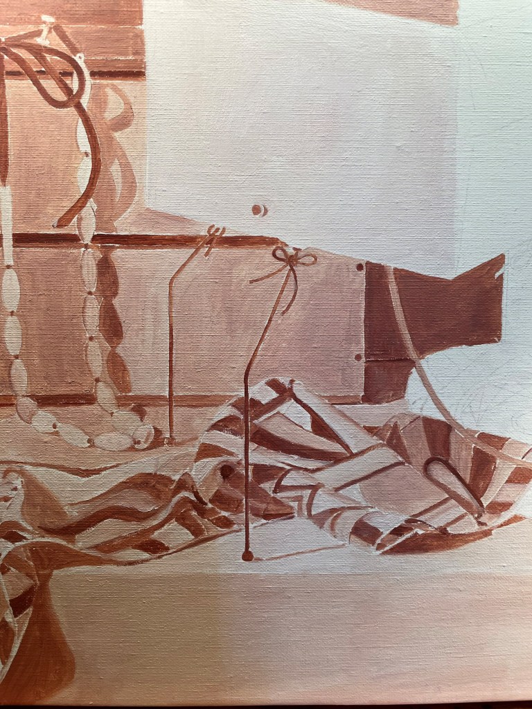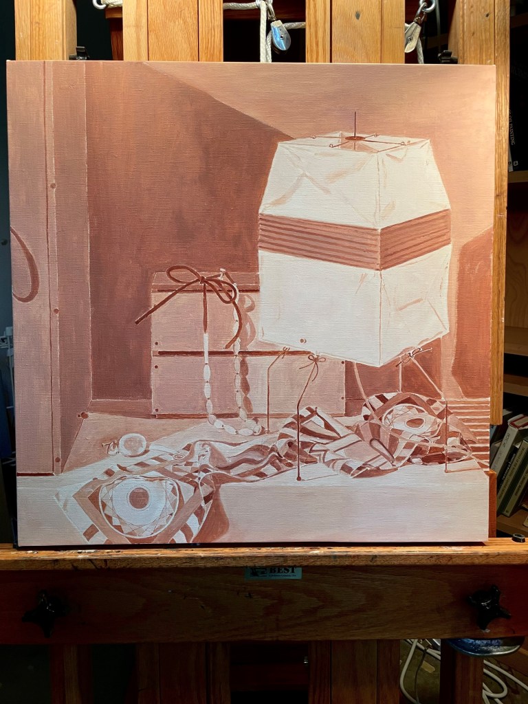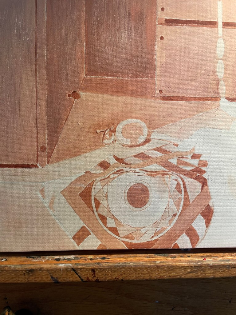 I had changed the position of the lamp cord in my study, but didn’t adjust my drawing. I’ll just paint it free-hand here, in the underpainting, without a drawing to guide me. You can see its new position, above.