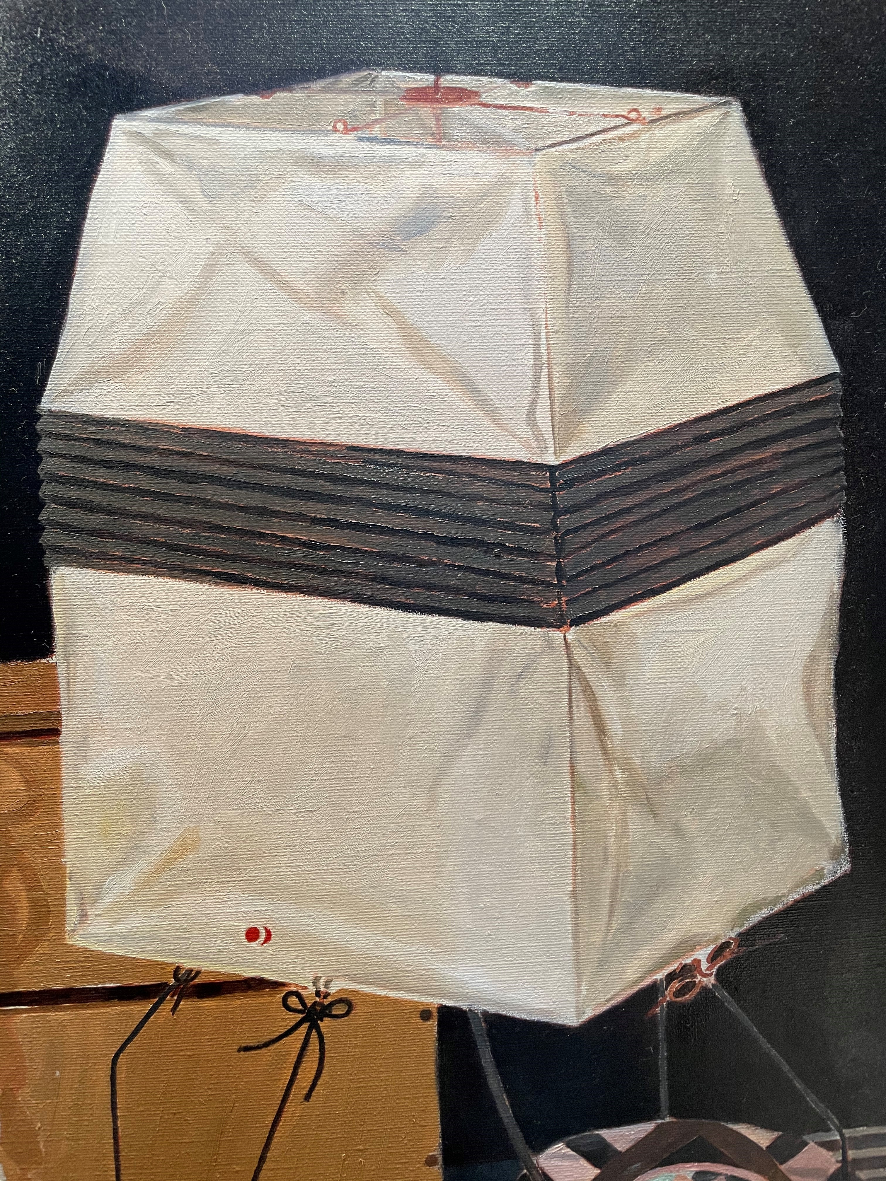 I plan on painting the dark strip in the center of the lamp darker than it will ultimately appear. I’m doing this so that I’ll be able to scumble light tones over the dark to achieve the look of light glowing through the dark paper. It turned out not quite dark enough. I’ll cover it with a dark glaze when it’s dry, and scumble over that when it’s dry. I’ve found that these kinds of multiple payers add to the richness of the final result.