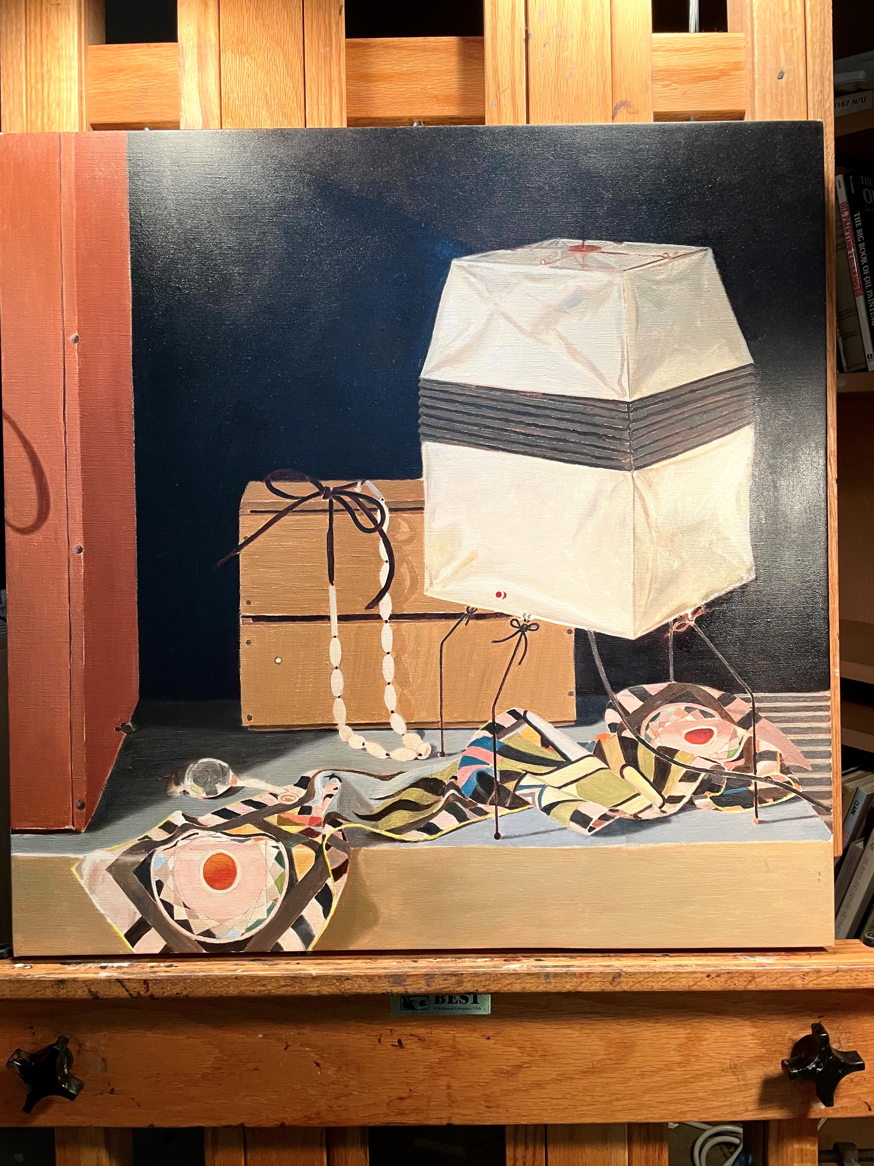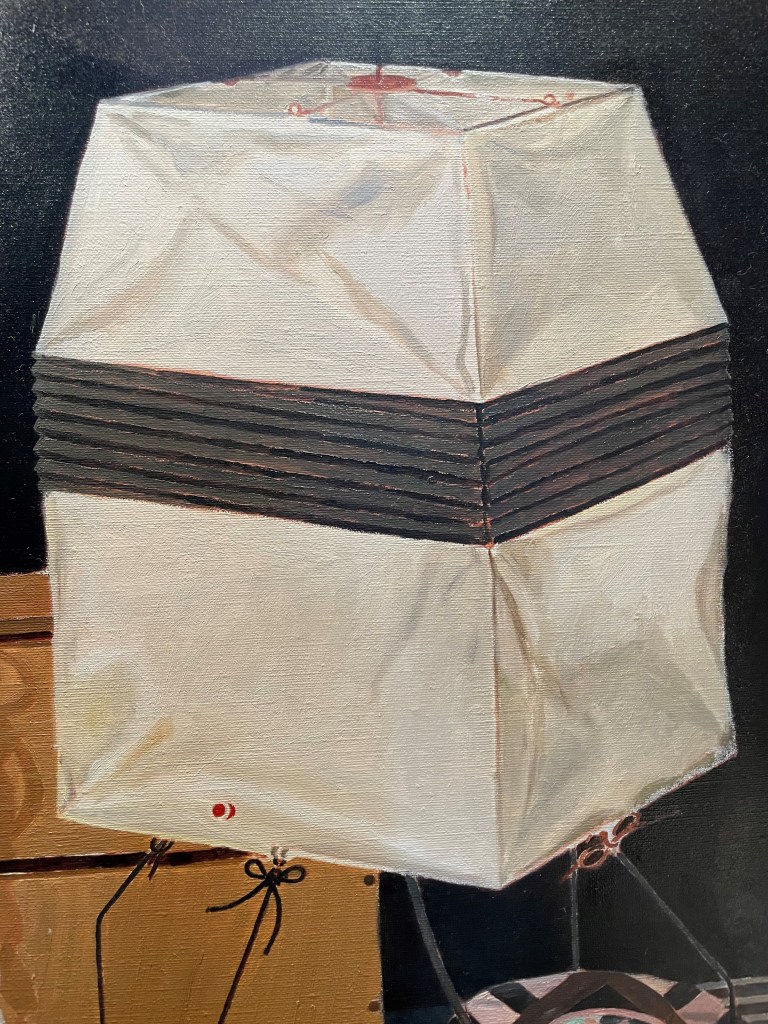 Above is my first attempt at the lamp. It was tricky to decide which colors to add to white to get the white of the lampshade. I ended up using a bit of raw umber, transparent golden ochre and cobalt blue in varying strengths. I think that as I progress, I’ll use both cool and warm tones juxtaposed. This causes a vibrating effect that can mimic the look of the lamp glowing. As you’re painting, it’s important to remember that even though some areas of the shade are darker than others, all are a very light value. When you squint your eyes and look at the painting, all of the light areas of the shade should appear quite similar. It’s normal when you’re studying an object to focus on differences and end up over-stating them. The more experience I have, the more I’m able to keep value differences slight.
