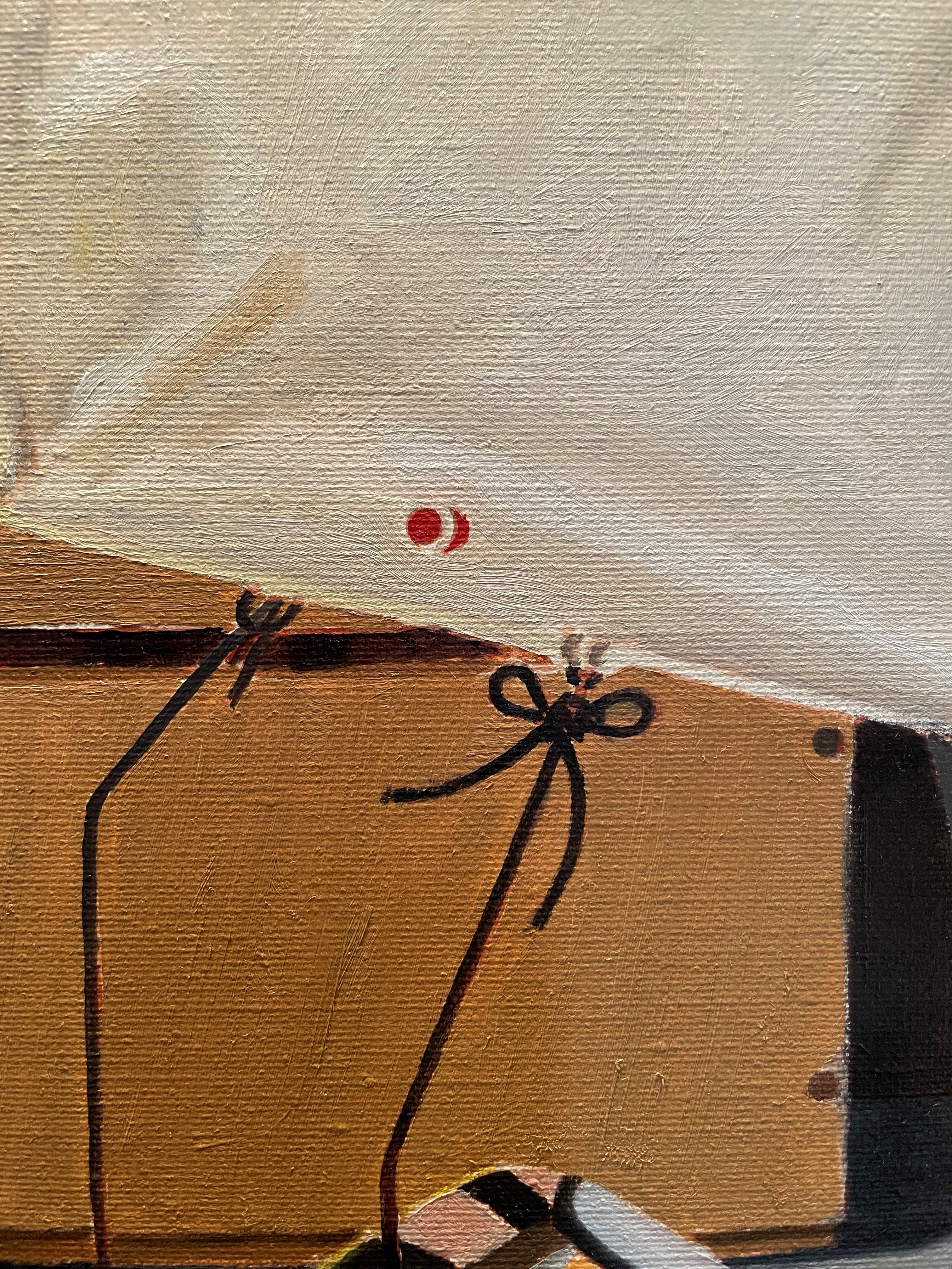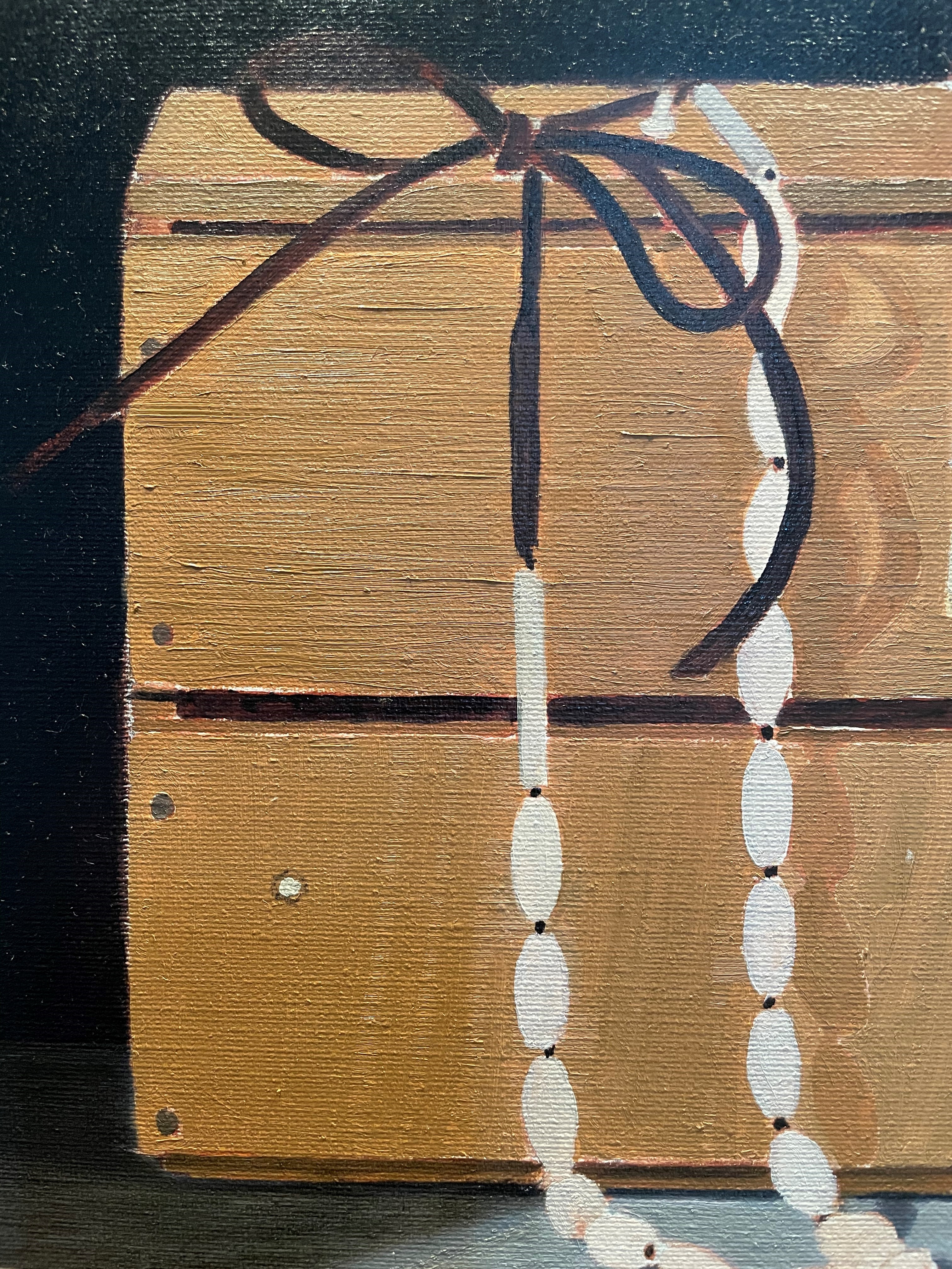 I’ve covered most of the canvas. Only the thin metal rods in the top of the lamp remain. I’ll put those in next session. If the other areas are dry, I’ll also begin to put in some dark shadow glazes.