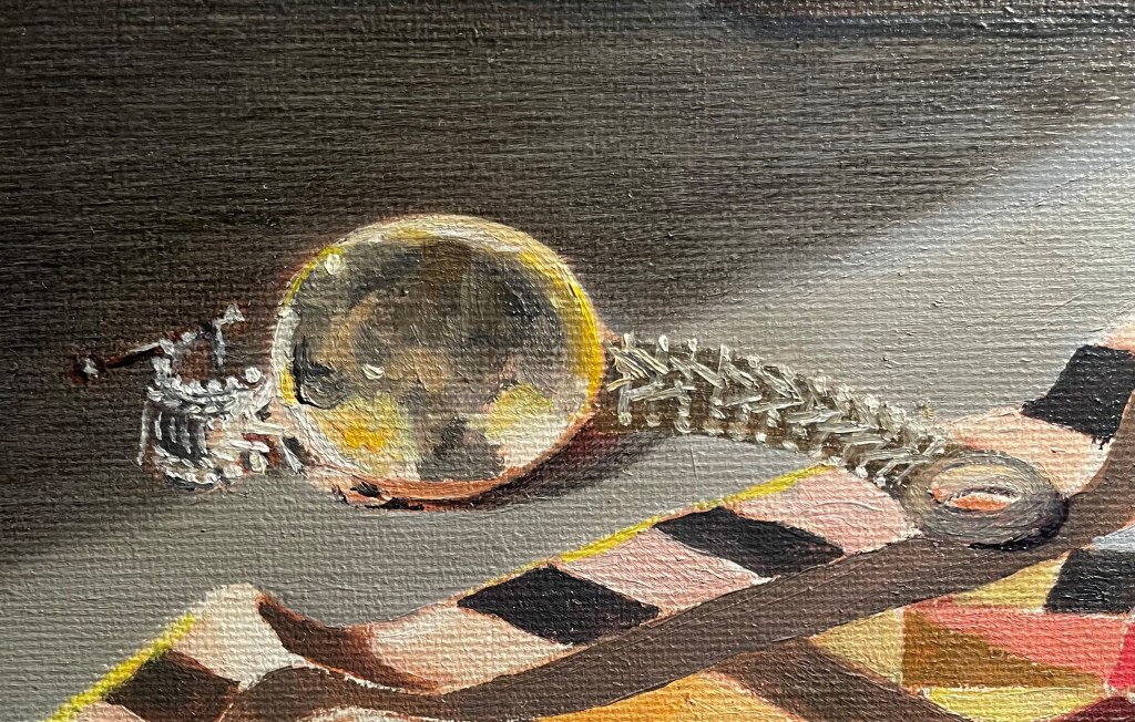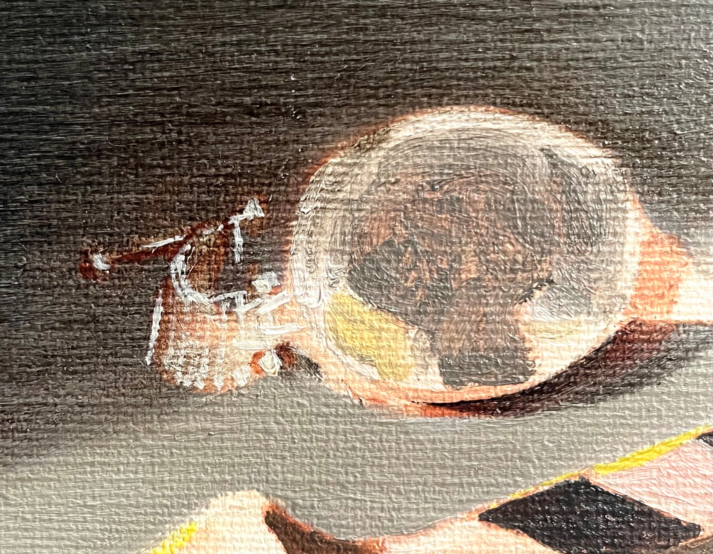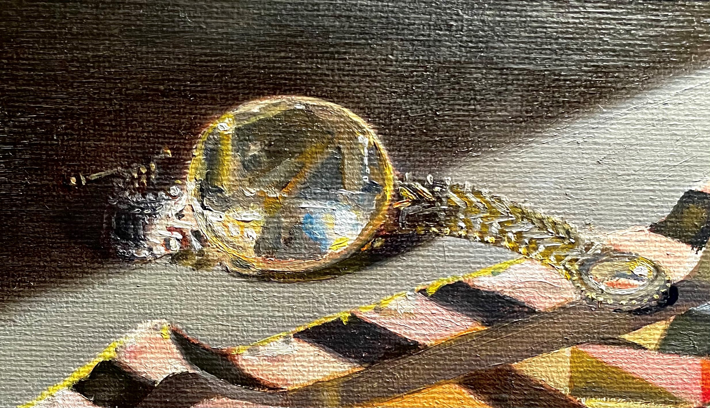 I next tackled the band. I saw that the areas between the bars and cross-pieces on the right was really very yellow and light in value. After fixing that with some cadmium yellow mixed with transparent golden ochre, I saw that the cross-pieces closest to the crystal were reflecting a bright orange-yellow. There was also some bits of this color reflected onto the tabletop in the shadow. I put a dark glaze over the part of the band on the left that was in shadow, and picked out a few highlighted areas. When I tried to paint the ring at the end of the band, I was confronted with a very bright highlight shining in my eyes, which obscured the details. I temporarily moved the spotlight to get rid of the highlight. It was still very hard to see, but I managed to get the small dots going around it’s perimeter, and the basic pattern of lights and darks.