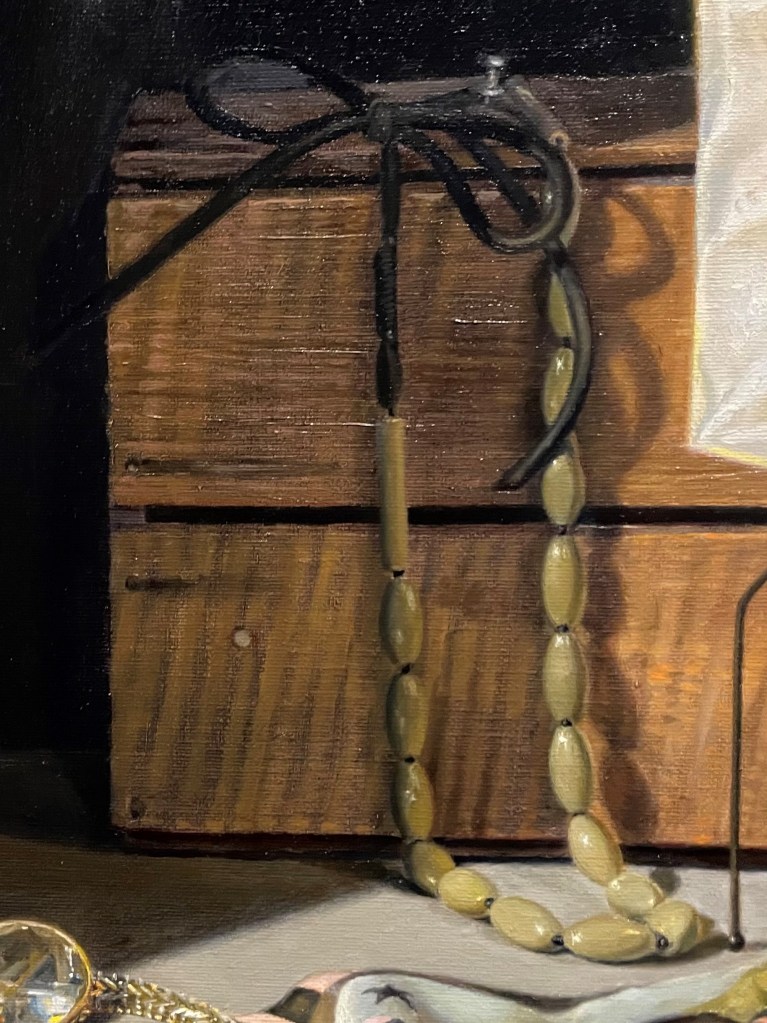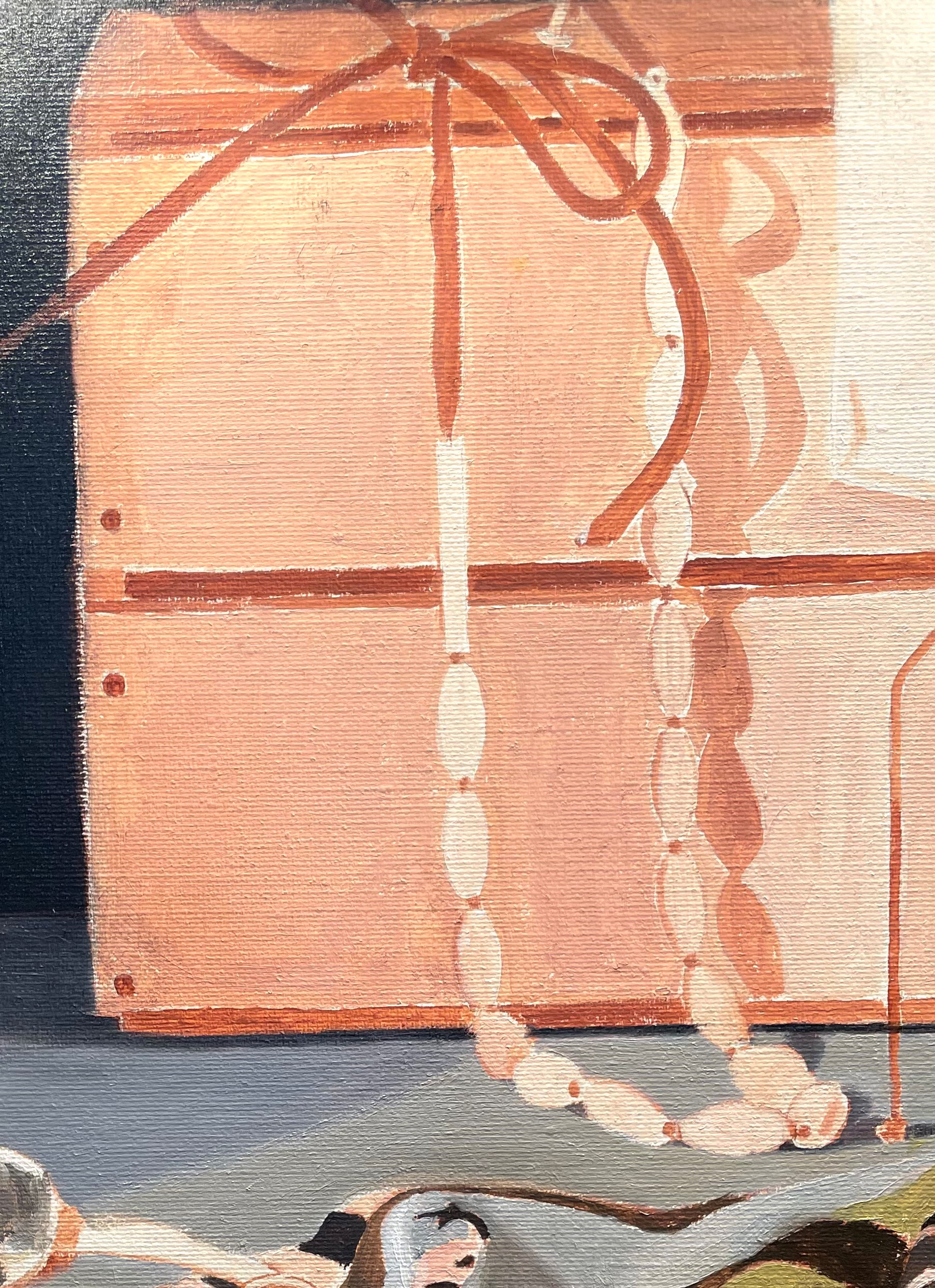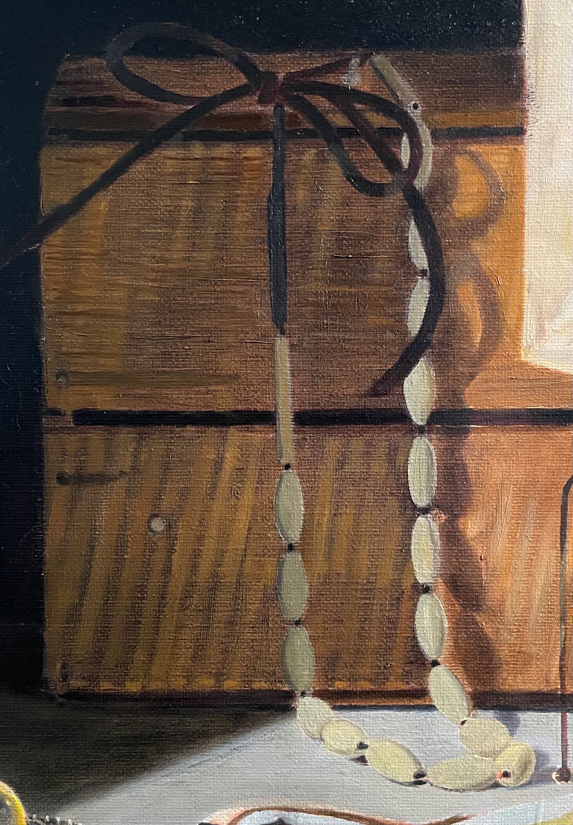 Below, I’ve spent a lot of time observing the beads. I warmed up their color, softened their edges, and added some highlights. I painted some texture onto the ribbon and refined its highlights, being careful to keep everything within a very narrow, dark value range. I continued to add details to the textures on the crate. I lightened its top surface, making the bow more visible. I softened all of the shadows that the beads cast onto the crate. I brightened the crate on the right side.