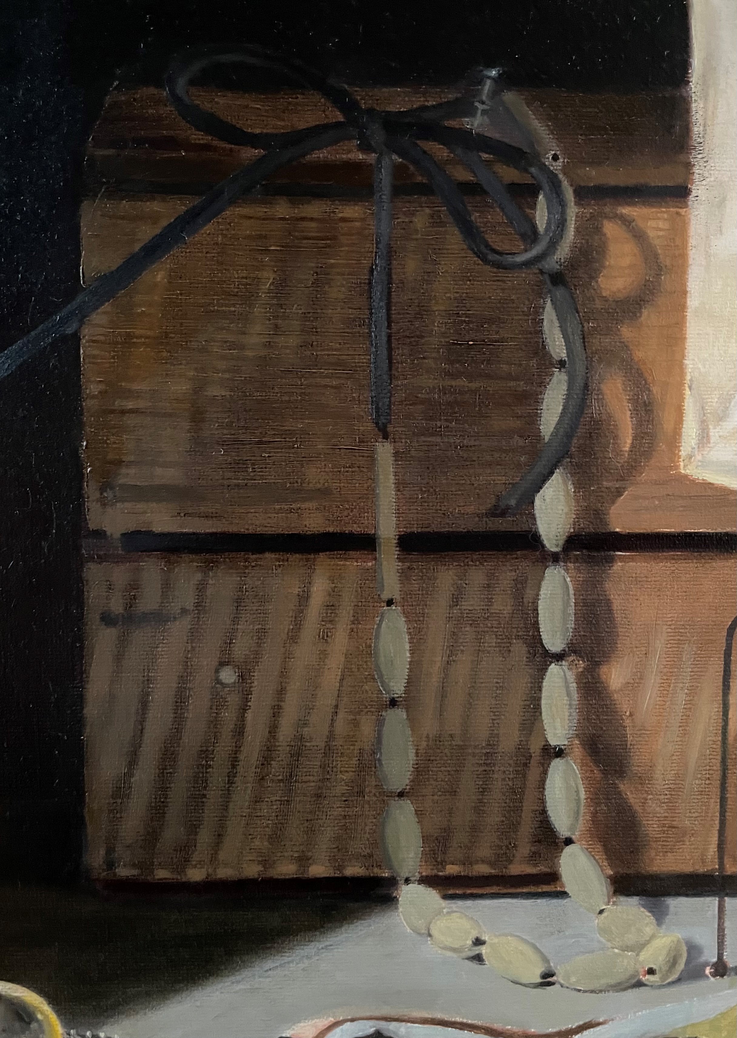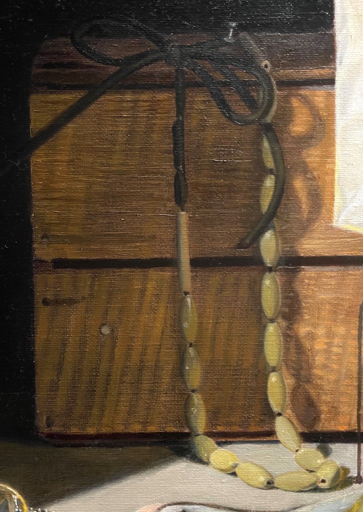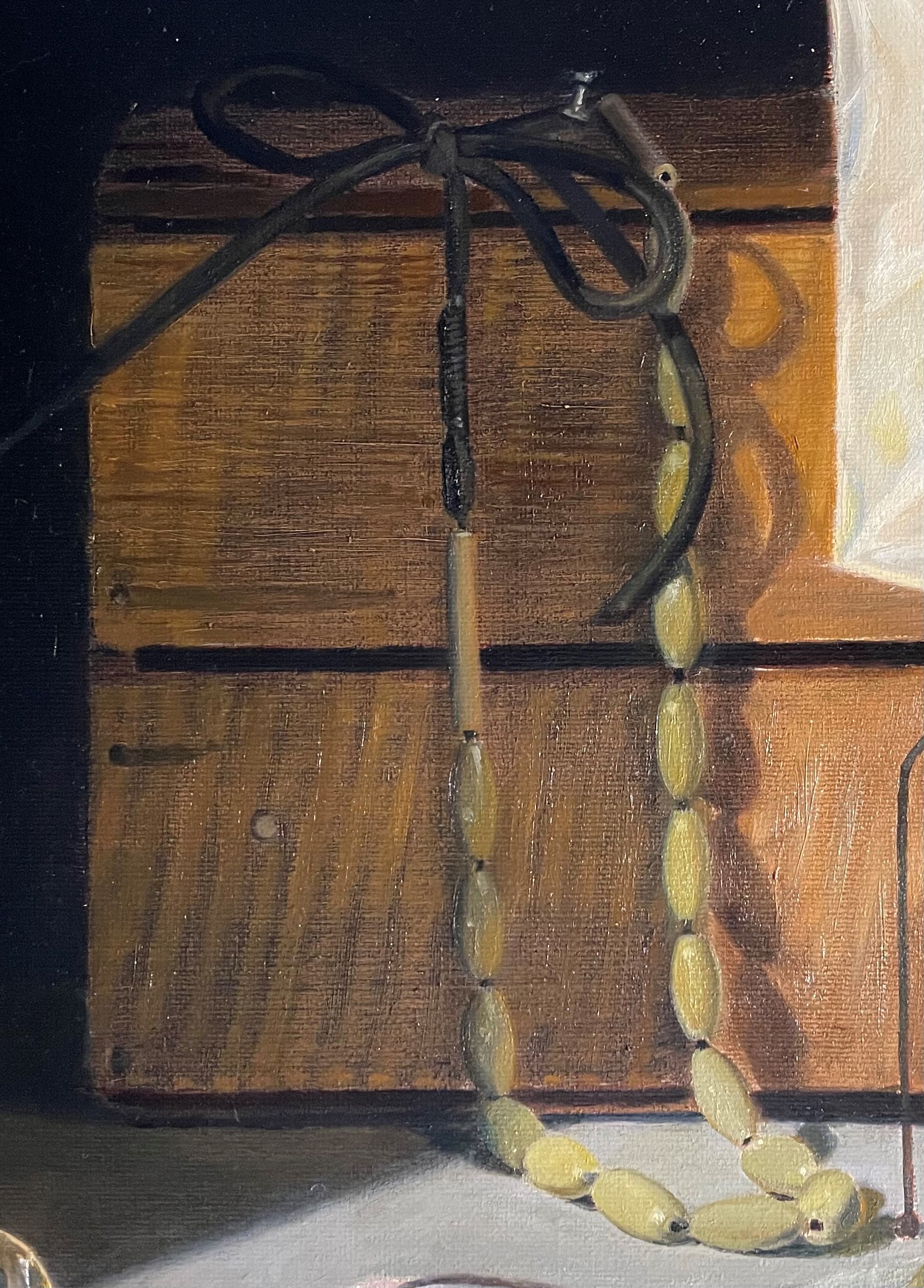 Below, I’ve spent a lot of time observing the beads. I warmed up their color, softened their edges, and added some highlights. I painted some texture onto the ribbon and refined its highlights, being careful to keep everything within a very narrow, dark value range. I continued to add details to the textures on the crate. I lightened its top surface, making the bow more visible. I softened all of the shadows that the beads cast onto the crate. I brightened the crate on the right side.