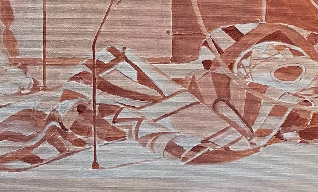 My first layer of paint, below, is applied very simply. I’m not aiming to capture subtle shadows or reflections. I’m just putting down the local color of the various patterns. It took a surprisingly long time to accomplish this. Below you can see what I finished in one day.