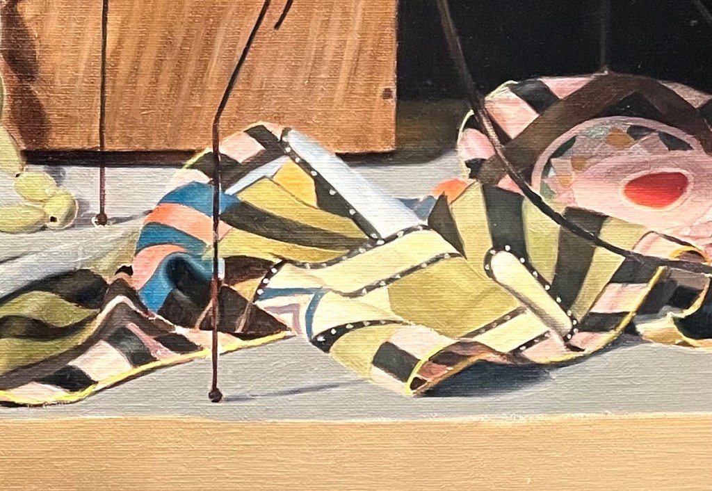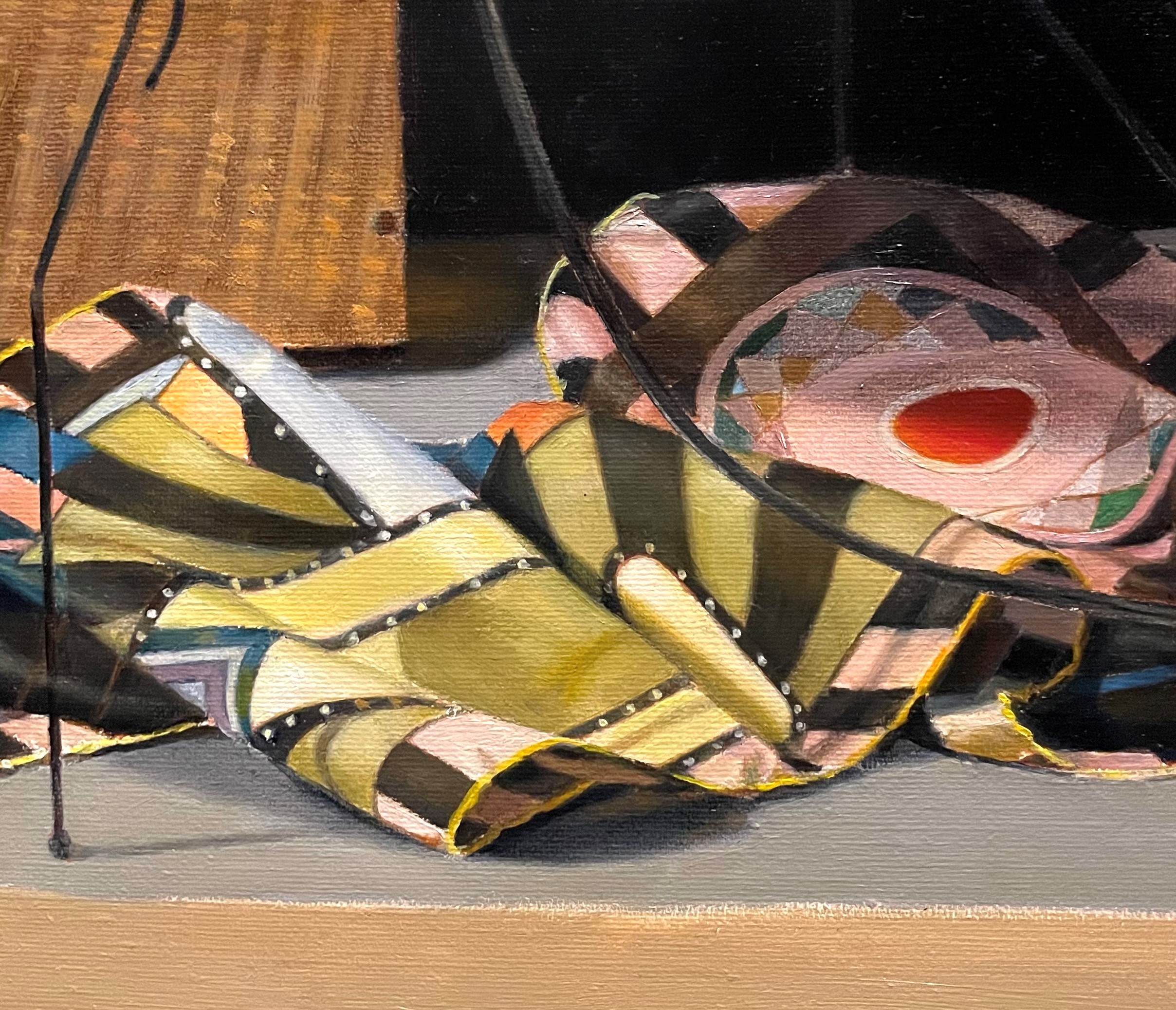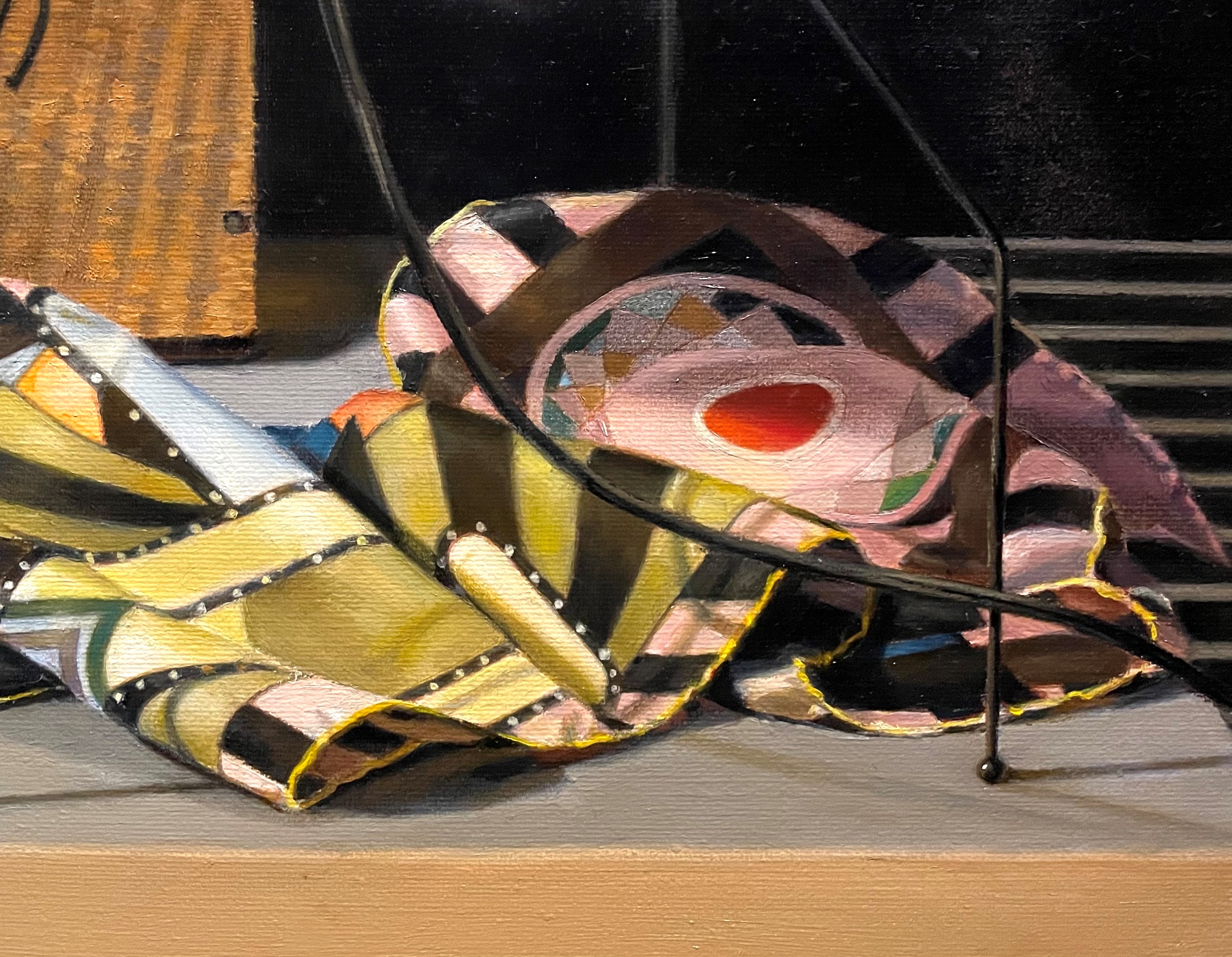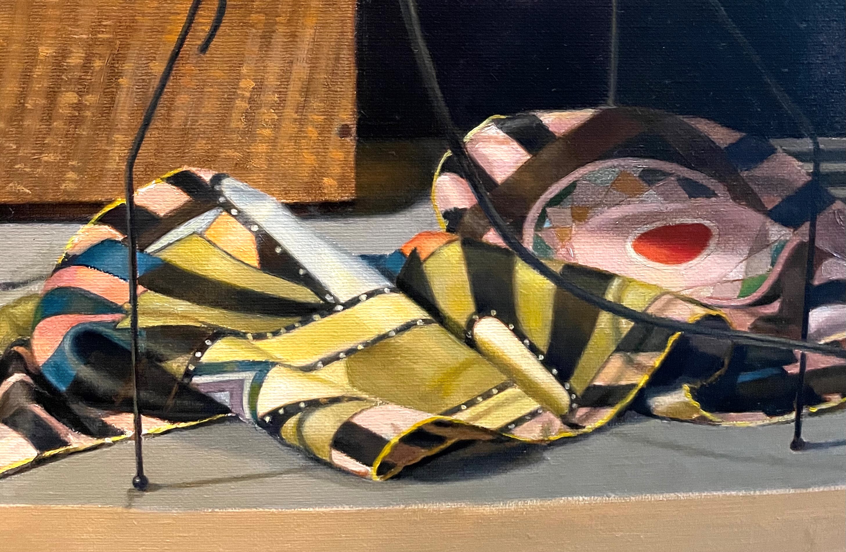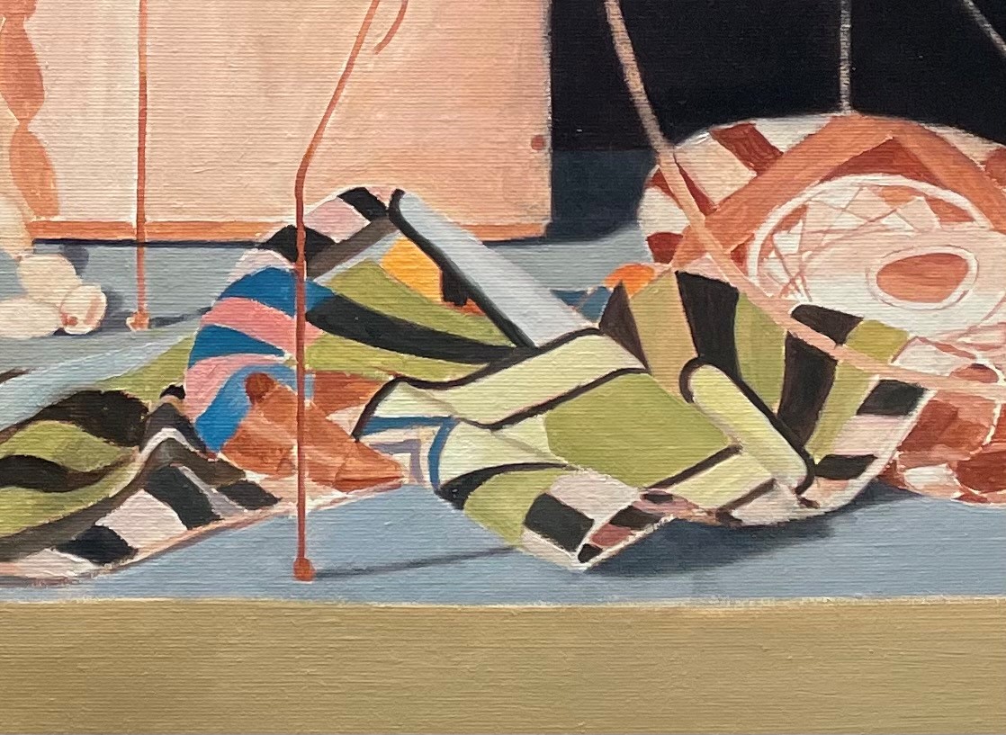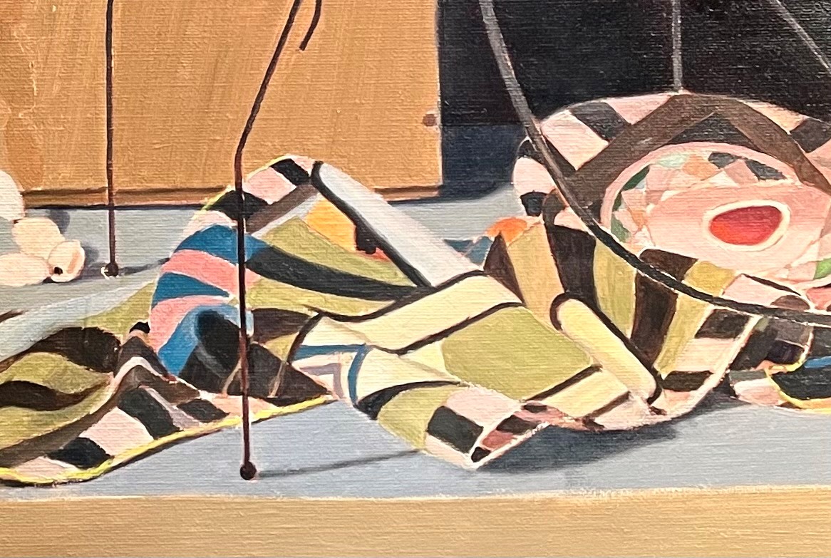 Below, I’ve applied another layer of paint, always carefully observing the edges. Often, an edge seems sharp at first, but when you look closely, the light reflecting around blurs it. I’ve also begun to think about the yellow edge of the scarf, which is hand-stitched, giving it a distinctive puckery look. I’ll refine these areas later. As I work, I always try to observe carefully and correct my drawing. Even at this stage, I often find mistakes. Some aren’t worth fixing, as they don’t effect the design of the painting, but others are. I don’t want accuracy just for the sake of accuracy. Every decision has to be made with the goal of achieving a beautiful result. No one will ever know if the abstract pattern of the scarf in the painting is slightly different than that in the real scarf.
