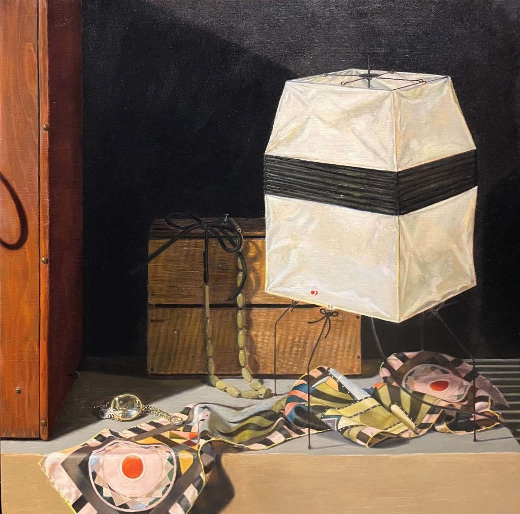 Finally, I wanted the hanging necklace to connect the lamp and the scarf, bringing the eye up from the scarf to the lamp. I decided to lighten the value of the beads on the right side, in the light. You can see this in the second photo. Now, the two area of the painting are connected, creating a path for the eye to follow.