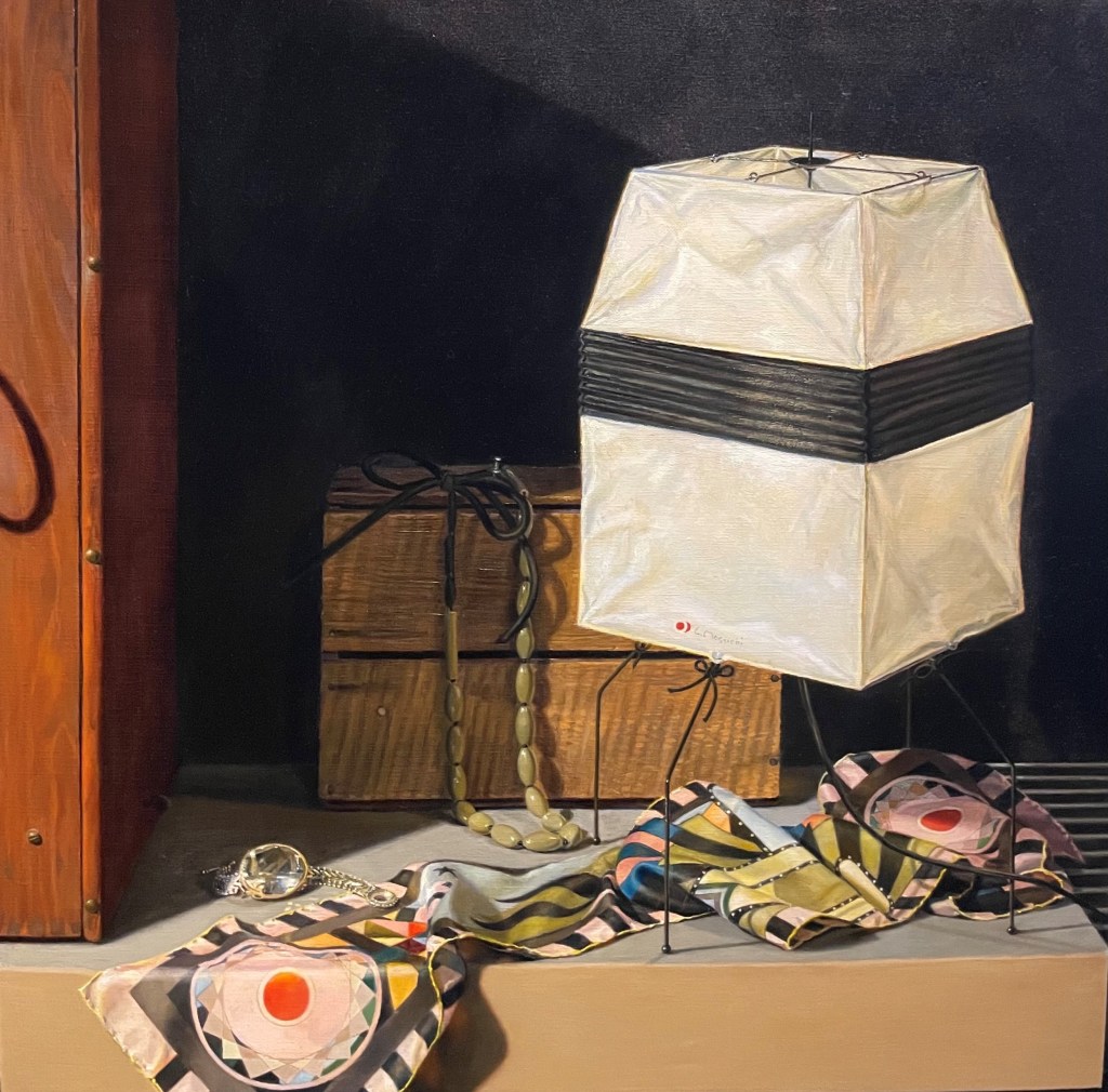 First, let’s compare the Japanese lamp in both versions. My goal was to make the lamp glow. To do this, I needed it to be brightest where the lightbulb inside the lamp shone through. This is the area just below the black band on the left side of the lamp. I painted this area with my lightest valued color–pure lead white with a touch of cadmium yellow. To make this area appear brightest, most every other part of the lamp had to be darker in comparison. The range of values that an artist can represent with paint is extremely limited in comparison to what exists in reality. This means that the artist has to alter what he sees in order to emphasize what he decides is important. So, in order for the brightest spot on the lamp to look bright, the other area had to be painted darker (even if they might not have seemed so in the set-up.) In the second photo, I darkened the other planes of the lamp, leaving the bright spot as light as could get it. I had to be very careful not to get too dark, or the illusion of light would be destroyed. I also added touches of this brightest white along some of the edges of the lamp, making it seem as though light were spilling out. I scumbled some lighter tones over the black band in front of the lightbulb, so show that it was glowing through there, too. This value had to be much darker though, since it was shining through dark paper.
