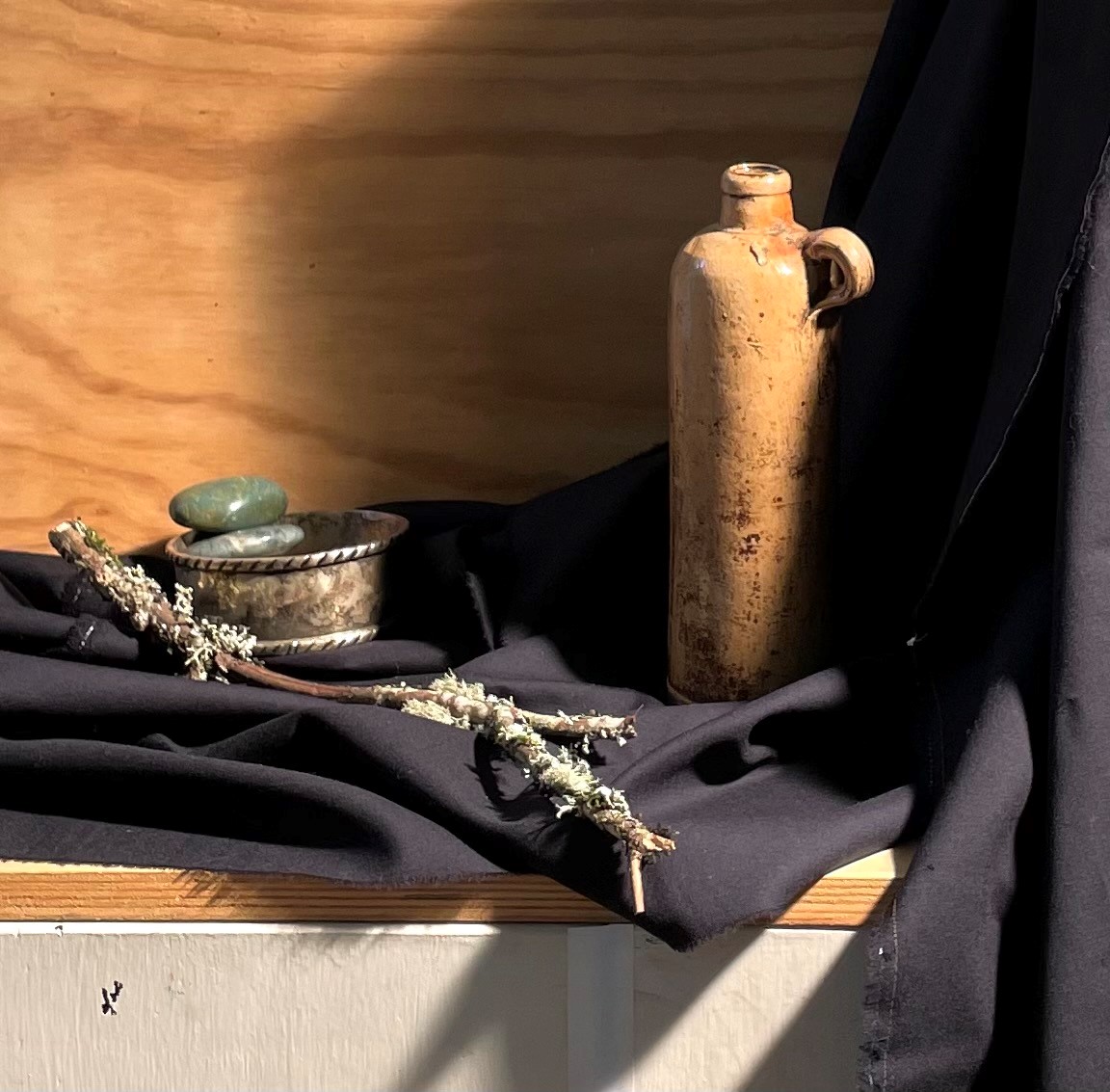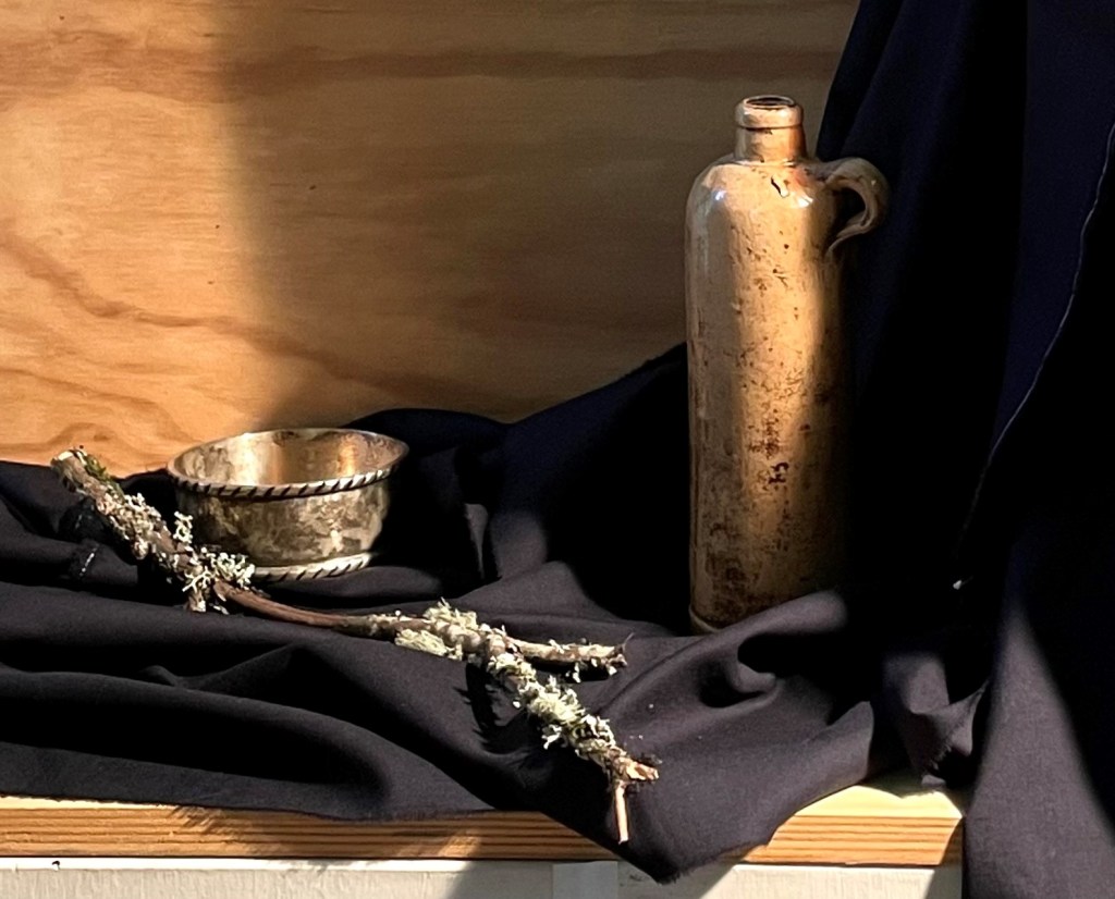 I began with simply setting the jug on my table. My first thought was to add some contrasting textures and value contrast. The black cloth served both purposes. I tossed it onto the table, set the jug on it, and turned on the spotlight. It was a good start. I then added the silver bowl. I thought that it complimented the jug without competing with it. After looking at the set-up, I had the idea that I’d like to add something natural from my garden. I found a bunch of branches and twigs that my husband had collected for the fireplace. I found this twig covered in lichen. I loved its curving form and rough texture. I tried several placements, but liked this one, as the curve led the eye from the bowl up to the jug.
