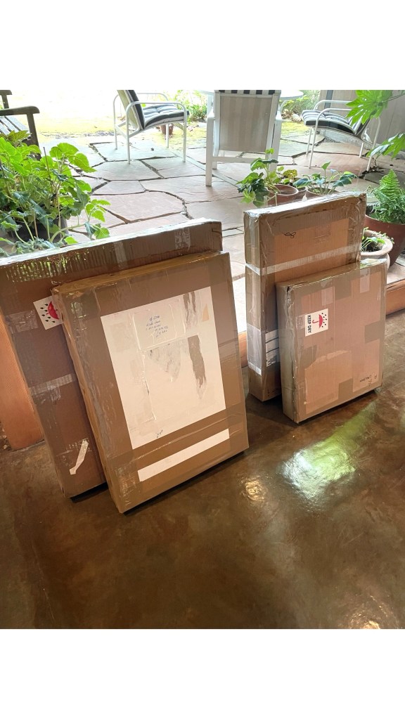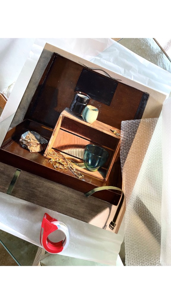 Then I put the painting into it’s pre-cut nest, put on the lid and used packing tape to close. For extra strength and cushioning, I’m having the shippers put all four boxes into a larger box which will be padded with paper coils.