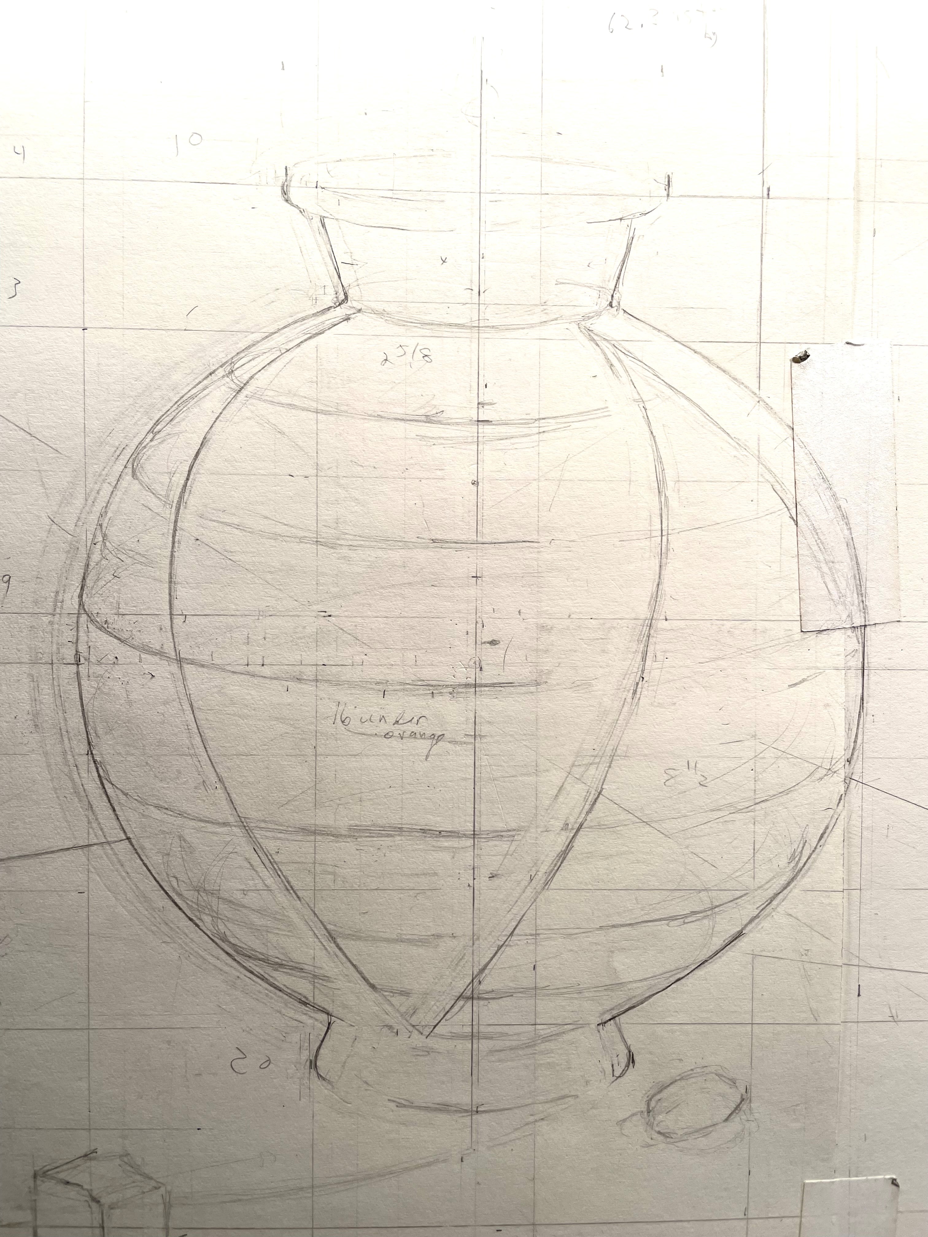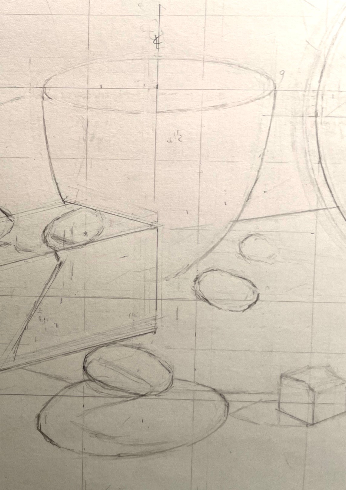 I’ve been taking my time with the drawing for my latest painting because I’m waiting for the canvas to arrive from the stretchers. This one seems particularly difficult. I think that part of the problem is that I thought that the large vase should be life-sized. I had calculated the size of the canvas to ensure this. I measured the actual vase to get the width of the base, top, and widest part of the middle in the drawing. I used these measurements to figure out other measurements. For example, the width of the vase at its widest should be equal to the length of the box on the left (I could tell this by holding up a ruler in front of my eyes and comparing distances). Unfortunately, the box kept seeming wrong to me, no matter how much I checked its proportions. I left it for the day. There is a phenomenon that I call ‘fresh eyes.’ That happens after you work very hard on a drawing and are unable to judge it objectively, and then leave it for a day. The following day, in the first few moments of observation, mistakes jump out clearly. It seems unbelievable that such errors could have passed you by unnoticed. When I looked at the drawing the next day, it was clear that I had drawn the vase too large. It actually should have been a bit smaller than life-sized. Subsequently, the box had to be reduced as well. The box looking wrong now made sense. You can see in the picture below where I erased and reduced the size of the large vase.