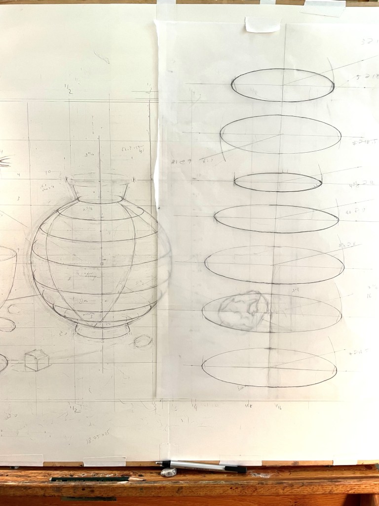 My drawing of the vase is far along enough now that I can calculate the exact ellipses of the designs as well as the shape of the vase. See How to Draw an Ellipse for complete instructions on the ‘pin-and-string-method’ of ellipse construction. Below you can see tracings taped to my drawing of several of the ellipses that I constructed. These were transferred to the drawing by flipping the paper over and tracing over the lines to transfer.