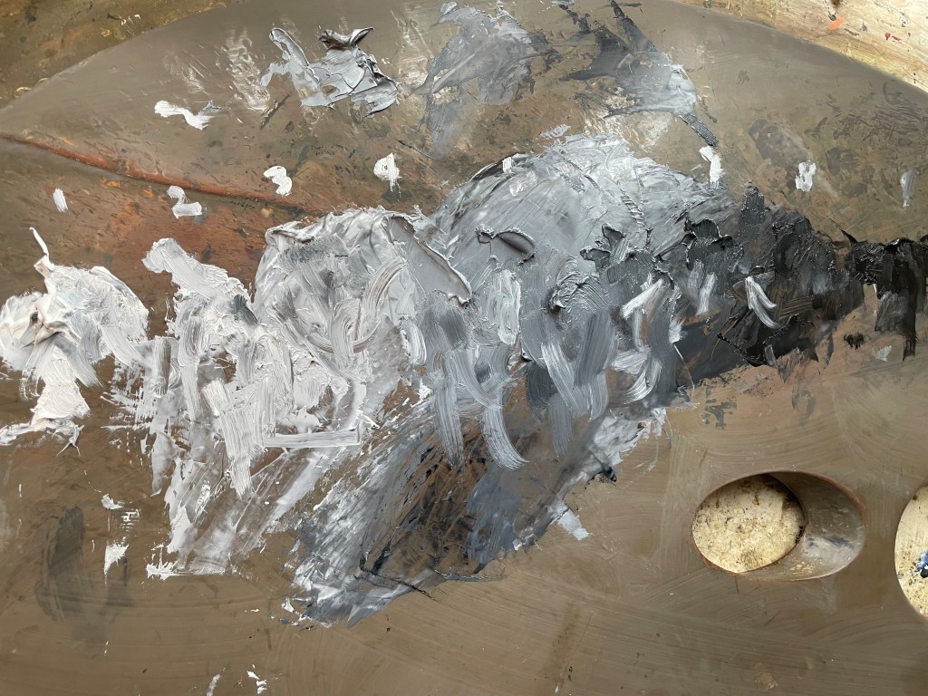 I’ll use the time waiting for my canvas to arrive to paint my value study. I paint this on tracing paper taped over my drawing, so that I can follow the outlines. I use 9 values ranging from white to black. There will be more values in my finished painting, but this is enough for now. I number them right on the palette for easy reference. This study will be very rough. I don’t need a lot of details to give me an idea of what the finished composition will look like in black-and-white.