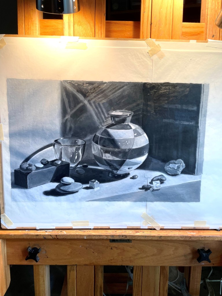Above is my initial attempt. It’s hard to get it right the first time, as one must compare areas to judge the right values, and until all areas are painted, you can’t judge correctly. I can see already that the lights need to be lighter. Below is the whole picture. I’ll let this dry for a few days so that I can paint in corrections.