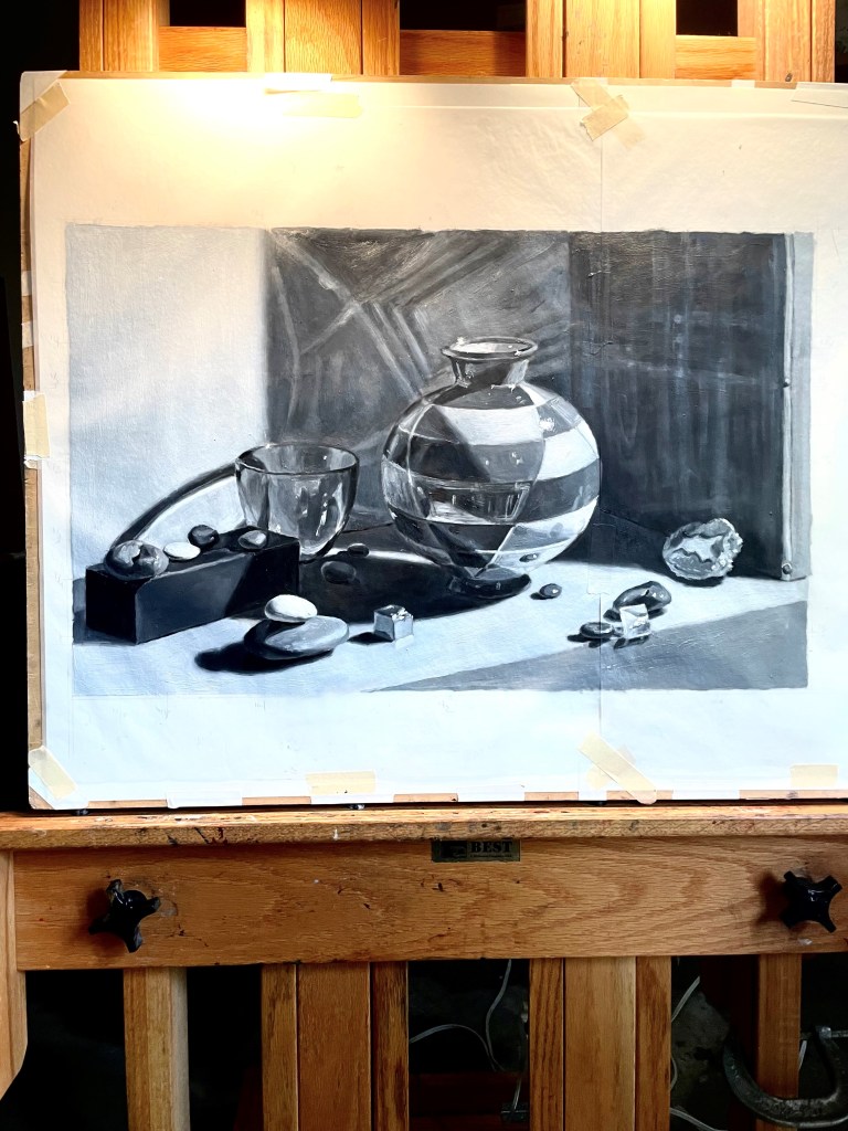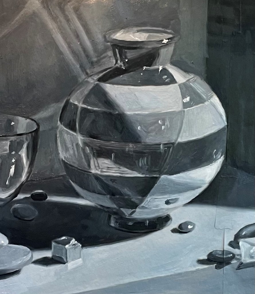 A week later, I put in my corrections. You can see this below. Most of the lights have been lightened, especially the tabletop, the wall on the left, and the white stones. I’ve also darkened the box, the shadow cast on the table by the big vase, and the area around the geode on the right. I’ve added reflections on the big vase, especially on its shadow side.