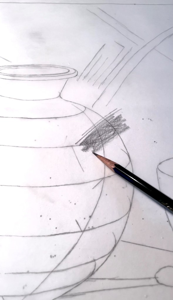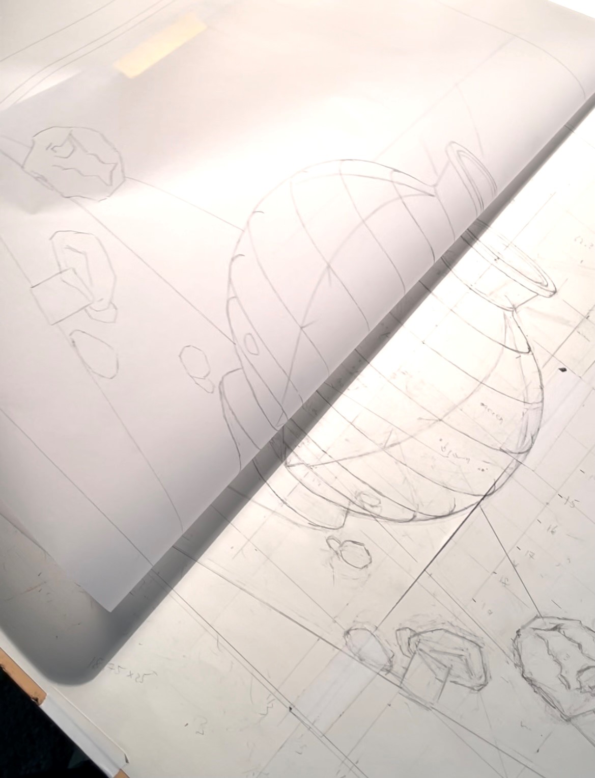 I have found that no matter how careful I am, the drawing always gets a bit distorted when I trace it. This is because I’m not drawing by directly observing the set-up, but am just mindlessly tracing lines without reference to reality. For a drawing to be correct, it must always be the result of observation! For this reason, I always go back and correct the transferred drawing on the canvas while observing the set-up.