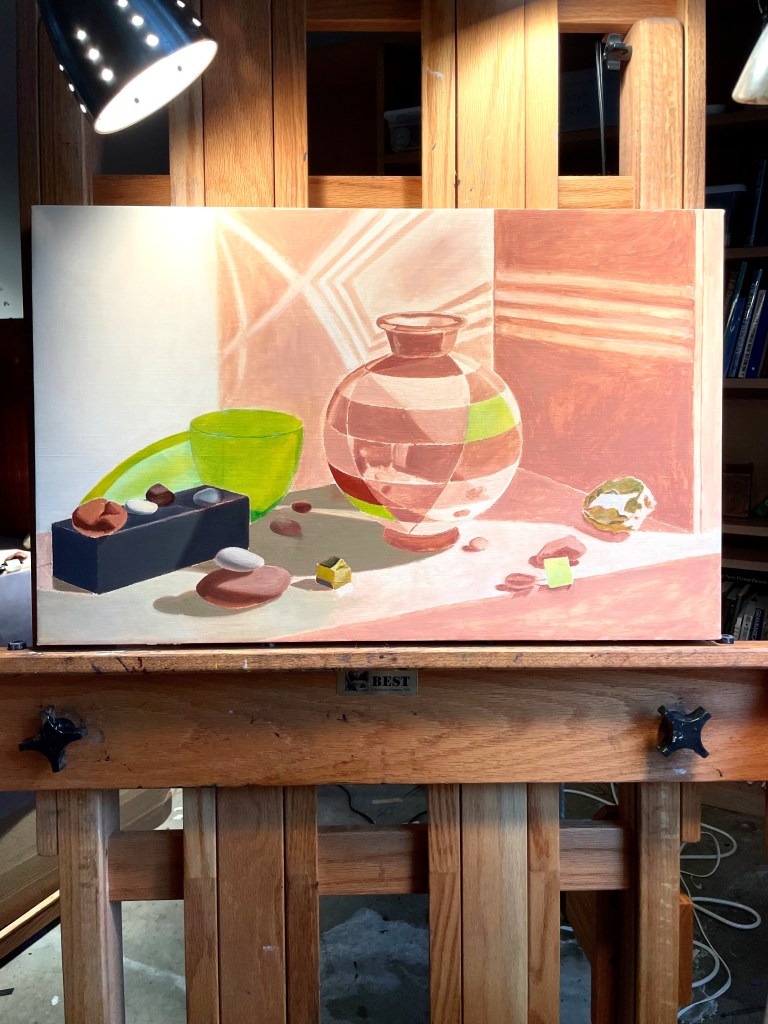The parts of my underpainting that I worked on first were dry, so I started to put down the first layers of local color. First, I put a green glaze over the yellow portions. This will serve as the lightest parts of the glass bowl and reflections on the wall. I’ll continue to add darker glazes for the darker parts when this layer is dry. Next, I tackled the blue box. It’s hard to judge values correctly at the beginning, since I have no basis for comparison. This is where my value study comes in handy. I can dab a bit of paint on it. It’s easy to see if the dab is too dark or too light. When it’s just right, it blends right in. To judge the color (and value, too), I make a tiny window with my fingers and thumb, with each hand. One, I use as a window to frame the area I’m studying in the set-up, the other, as a frame to view the equivalent area I painted on my canvas. Framed this way, and viewed simultaneously, it’s easy to compare for value and hue. Some areas I paint lighter than they’ll be, to allow for future glazes (such as the shadow sides of the stones and box, and the cast shadows on the box and tabletop.