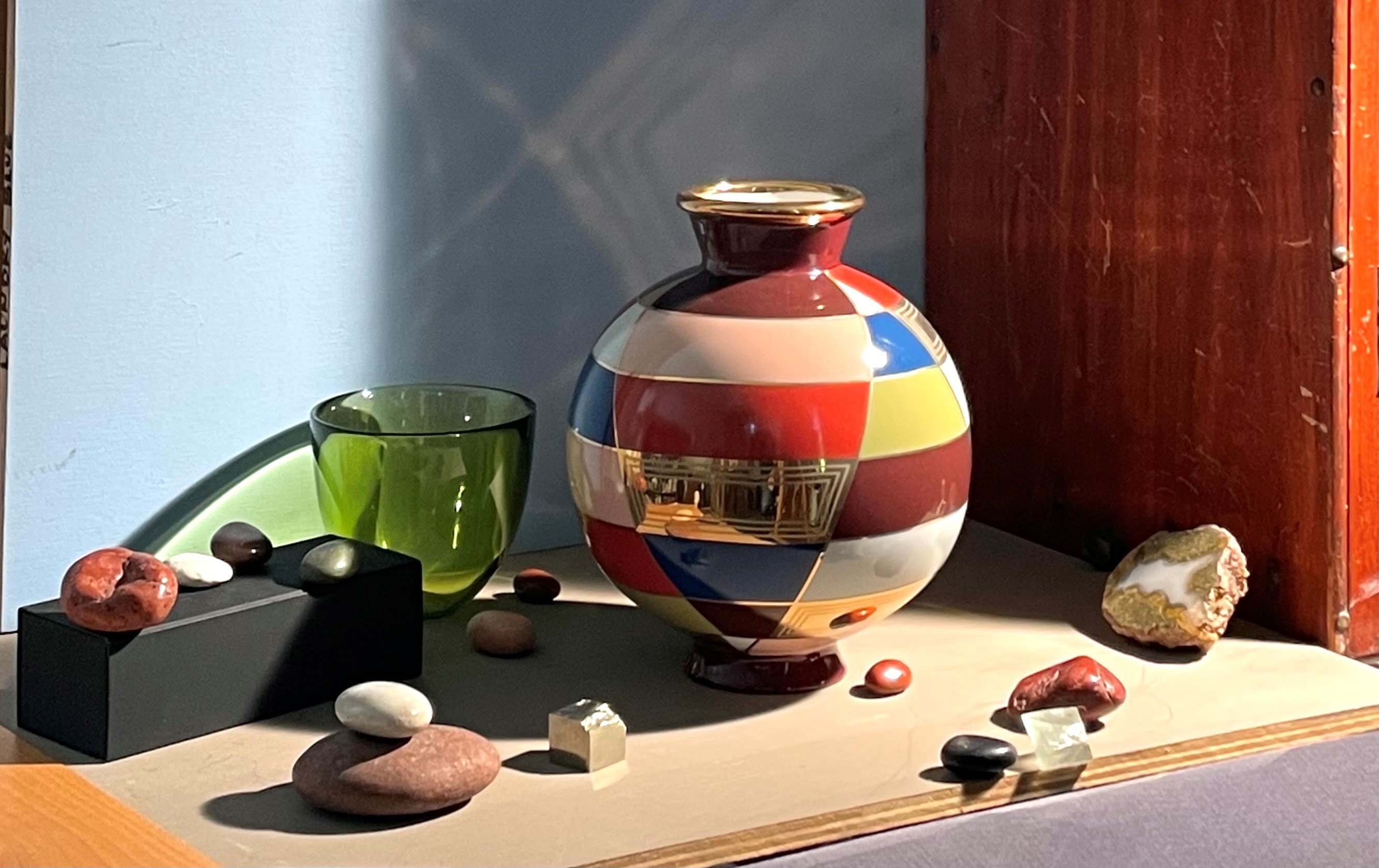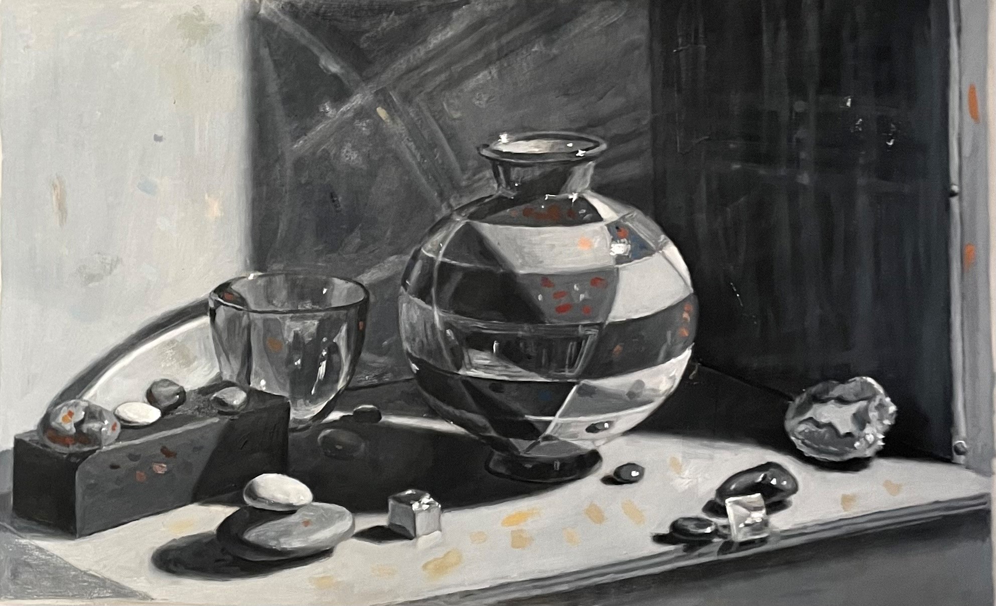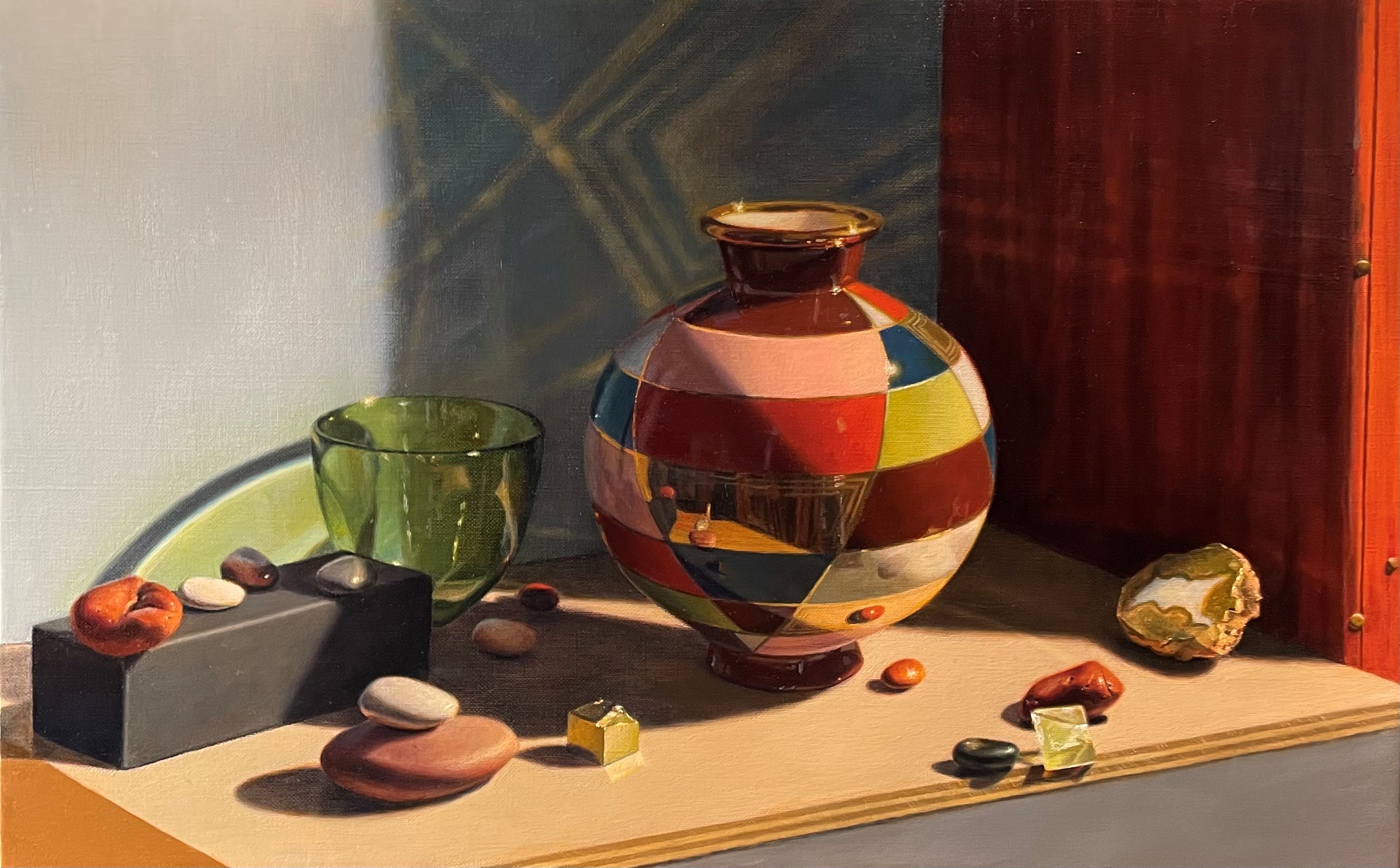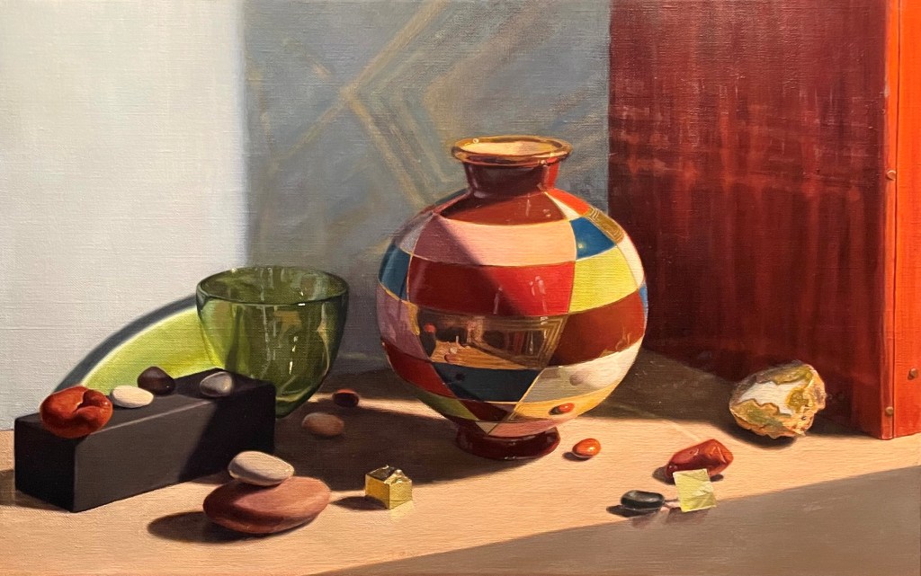 The first thing that struck me was that in the set-up, on the far-left side, a triangular bit of orange board was visible. This was never intended to be part of the painting. The plywood board I had set my objects on was too short, so I placed this other board there to lengthen it, thinking that I wouldn’t show it in the finished painting. Also, the striped edge of the plywood was visible on the right, and I had propped up a piece of gray board under it to serve as a vertical surface, and to cover the contents of the shelf below. Again, I hadn’t thought of these elements as part of the finished piece. Looking at this photo next to my painting, I realized that they were important to the composition. Without the orange triangle on the left, the eye falls off of the left side of the composition. Its presence guides the eye back to the center of the painting. The striped edge of the plywood on the right adds interest and echoes the stripes in the gold mirror section of the vase, as well as its reflections on the wall.