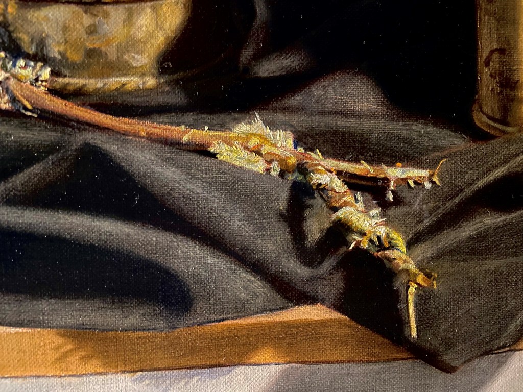 I think it’s important not to criticize yourself for not being able to see and paint details all at once. Until some work has been done, and the eye can identify areas on the canvas that correspond to areas in the set-up, it can’t do the quick back-and-forth studying necessary to accurately observe and capture a color, shape, or relationship. As the painting progresses, and more areas are worked on, it becomes easier and easier to compare and see how the painting needs to be adjusted. Every layer of paint further clarifies the image. It’s amazing to me how after a few sessions, what seemed like chaos in the set-up, is now understandable and paintable.