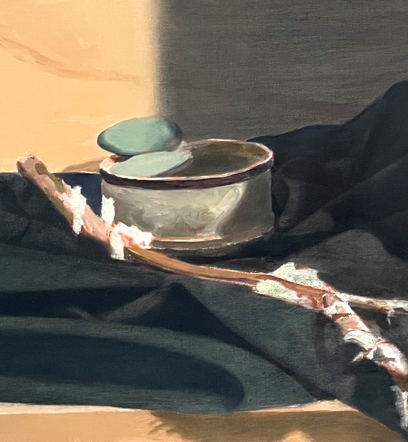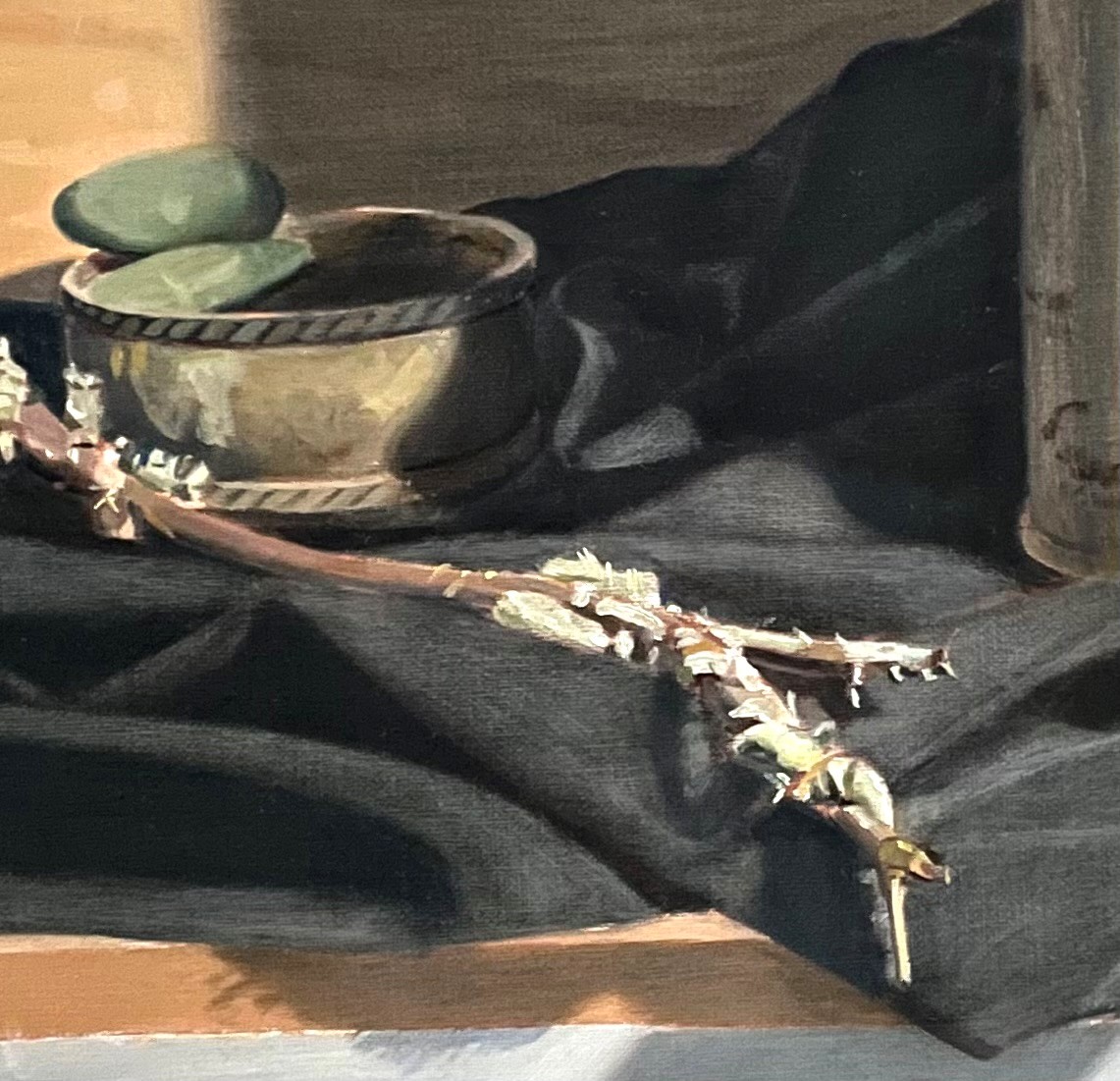 I think it’s important not to criticize yourself for not being able to see and paint details all at once. Until some work has been done, and the eye can identify areas on the canvas that correspond to areas in the set-up, it can’t do the quick back-and-forth studying necessary to accurately observe and capture a color, shape, or relationship. As the painting progresses, and more areas are worked on, it becomes easier and easier to compare and see how the painting needs to be adjusted. Every layer of paint further clarifies the image. It’s amazing to me how after a few sessions, what seemed like chaos in the set-up, is now understandable and paintable.
