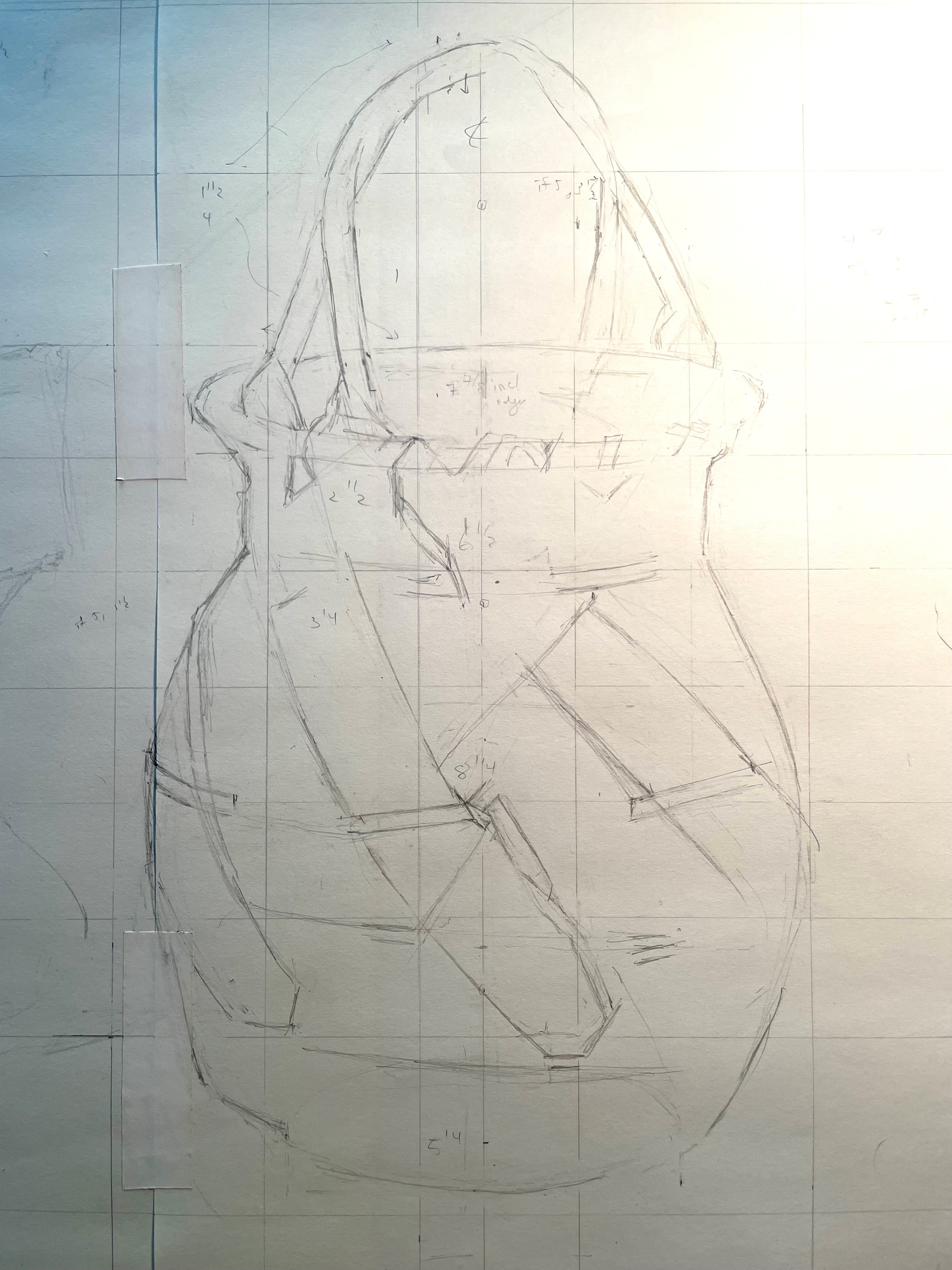 My latest painting features this Japanese basket. I couldn’t paint it without a detailed drawing to guide me. I drew it once before when I included it in a commissioned painting, and it wasn’t easy! Looking at that painting now, I can see that the drawing wasn’t entirely accurate (not that it really mattered in the context of the painting!) This time, I want to make sure that the large form is correct before attempting all of the details of the weaving. Here it is! It’s rather daunting.