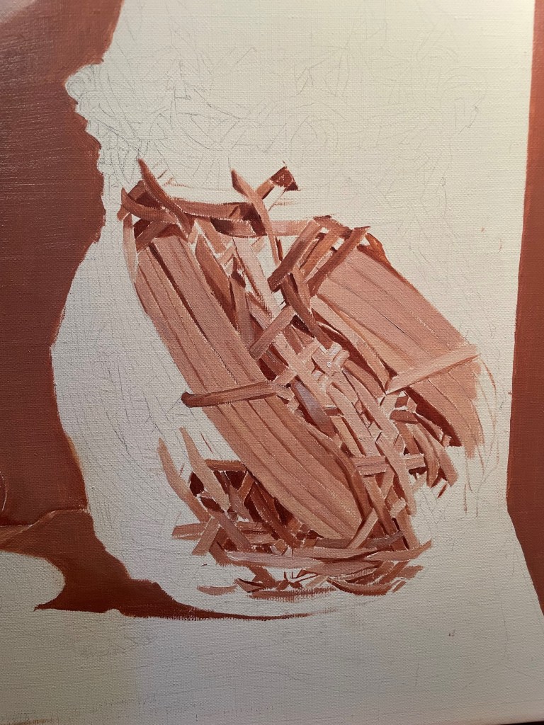 I moved to other parts of the painting after I couldn’t take painting any more small details on the basket. Below is how I left it. I still have several days left before it’s complete. When it is, I’ll let it dry for a week or so, and then onward to color.