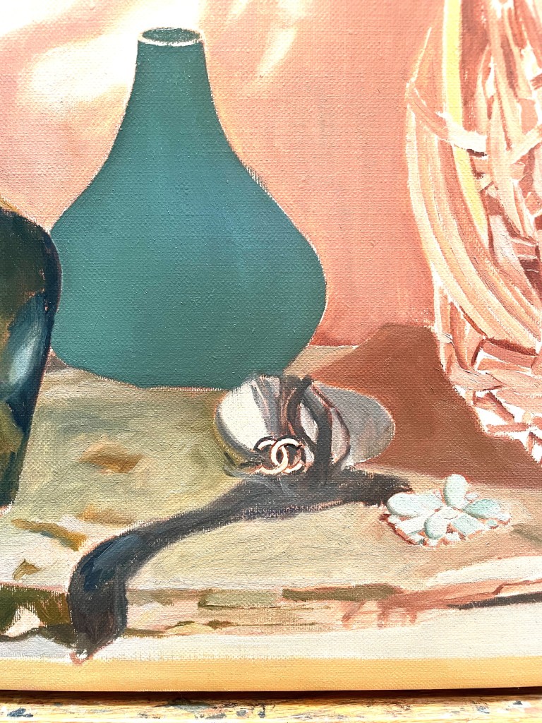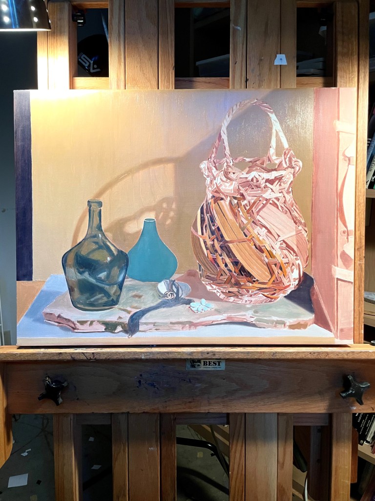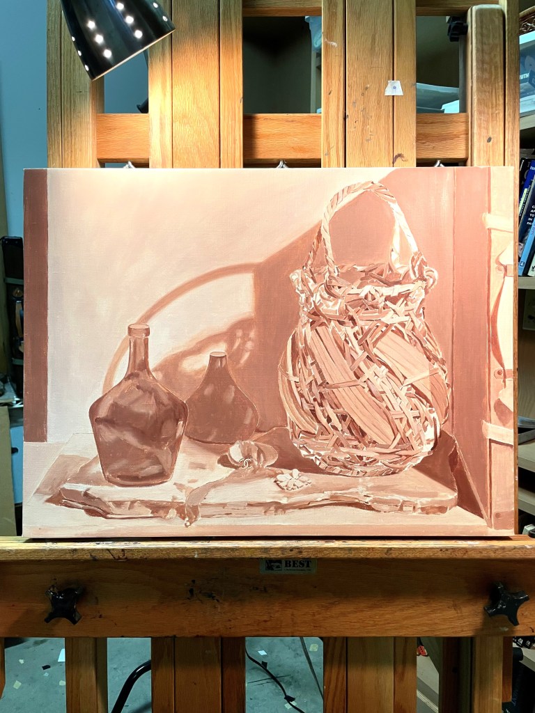 Above, I’ve started on the basket. It was extremely frustrating to get the right color for the bamboo strips. No matter what color I mixed, it seemed wrong. Until I cover more of the canvas with paint, I won’t be able to judge colors correctly. I’ll go back many times to adjust the colors. Also, even though I tried so hard to preserve the drawing through this process of drawing, transferring, and underpainting, I still have unclear areas that I had to re-see and re-draw with paint. It’s a complicated basket!