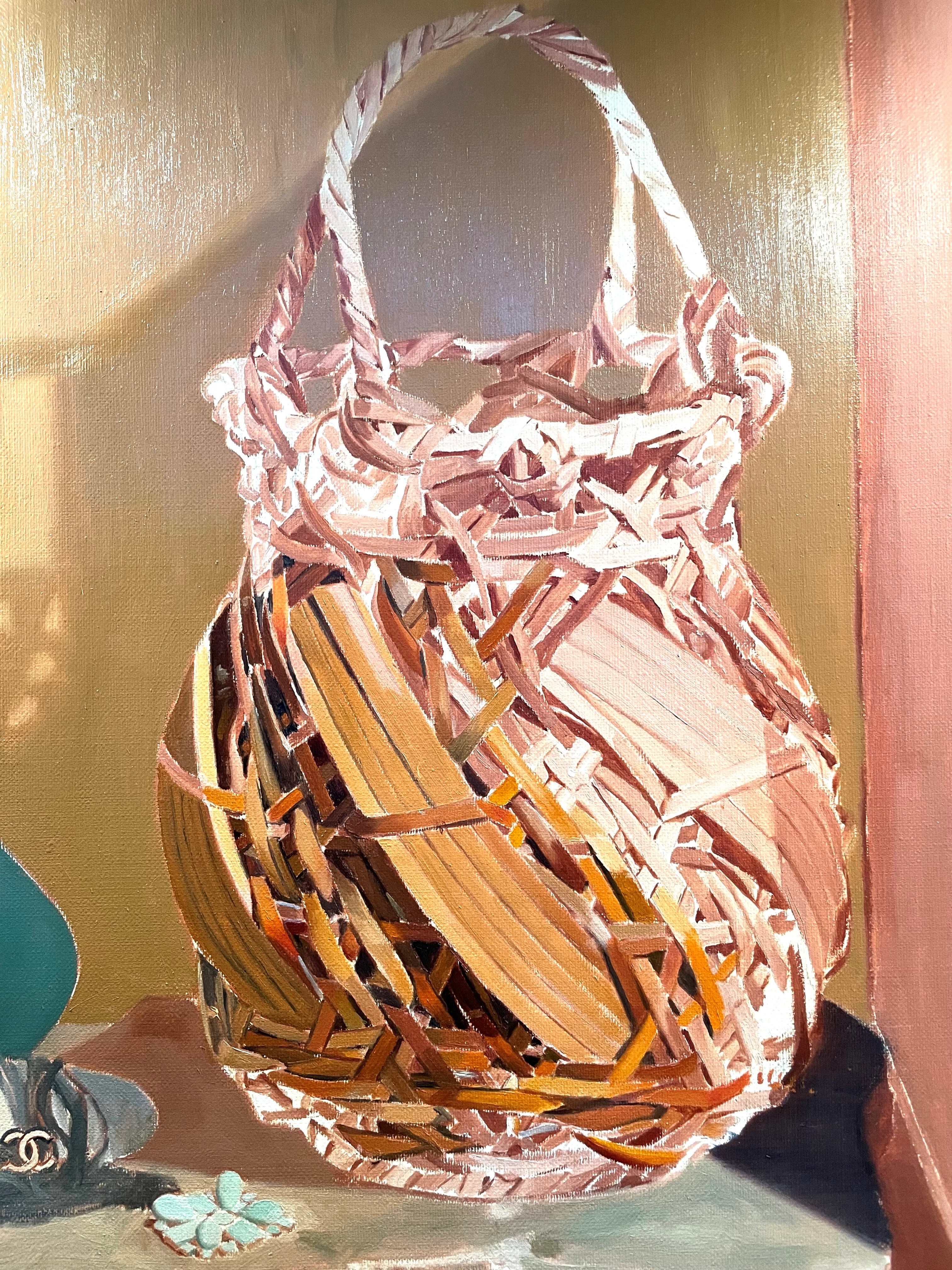 Above, I’ve started on the basket. It was extremely frustrating to get the right color for the bamboo strips. No matter what color I mixed, it seemed wrong. Until I cover more of the canvas with paint, I won’t be able to judge colors correctly. I’ll go back many times to adjust the colors. Also, even though I tried so hard to preserve the drawing through this process of drawing, transferring, and underpainting, I still have unclear areas that I had to re-see and re-draw with paint. It’s a complicated basket!