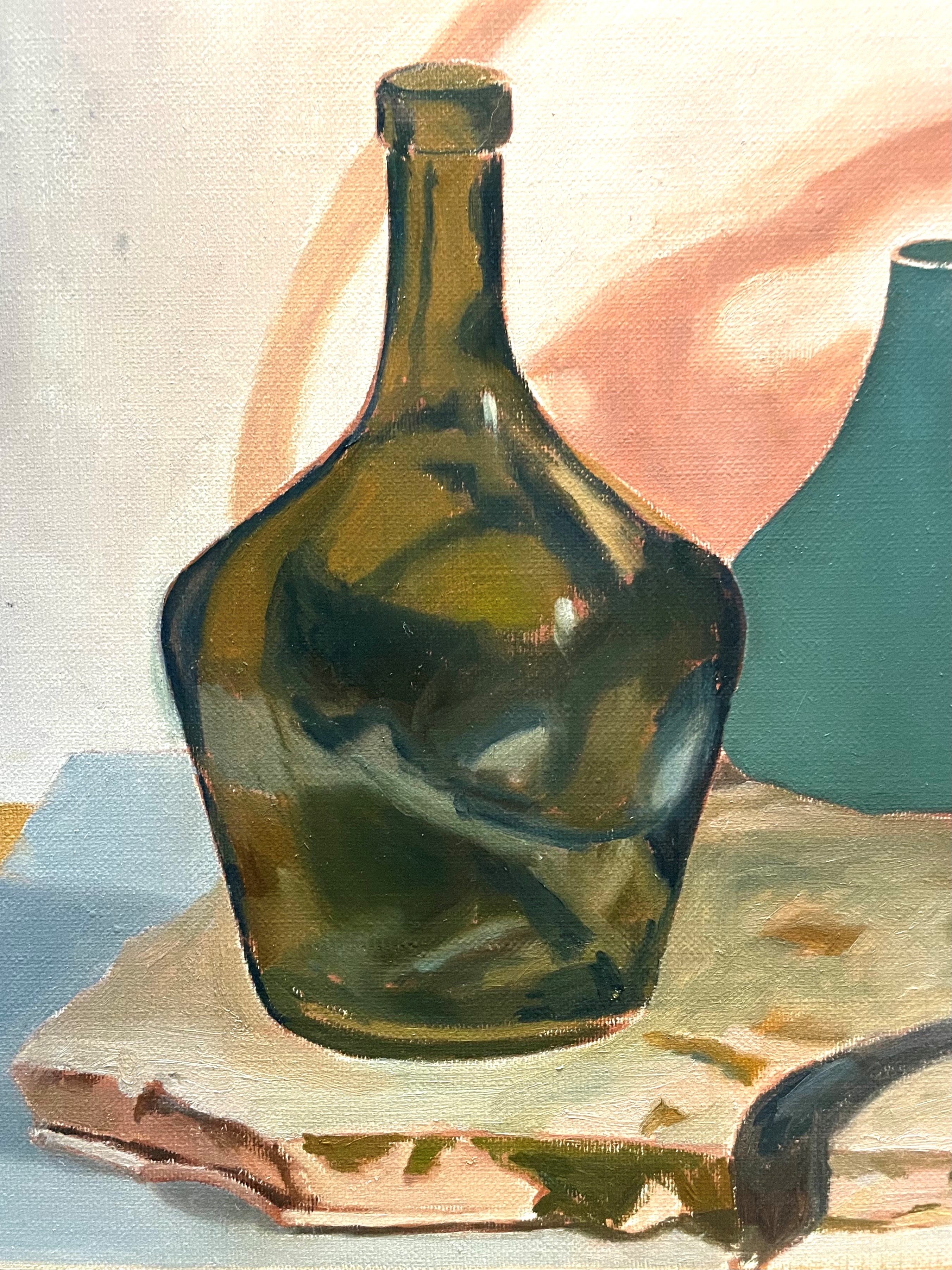 I decided to tackle the bottle first. It’s always hard to begin. I reassured myself by remembering that it’s just the beginning, and that many more layers of paint will follow. The more paint that is down, the easier it will be to judge colors and shapes and to adjust. The important thing is to begin. Accuracy and beauty will come later. Below you can see that I started by painting only the basic shapes. On something complicated, like glass, it’s always hard at first, to see all of the complex shapes of the shadows and reflections. Having this rough version down will make it easier the next time I paint it. I’ll have landmarks to judge from, will be able to compare what I see in the set-up to the painting and make adjustments and corrections. Also, I will know the object better.