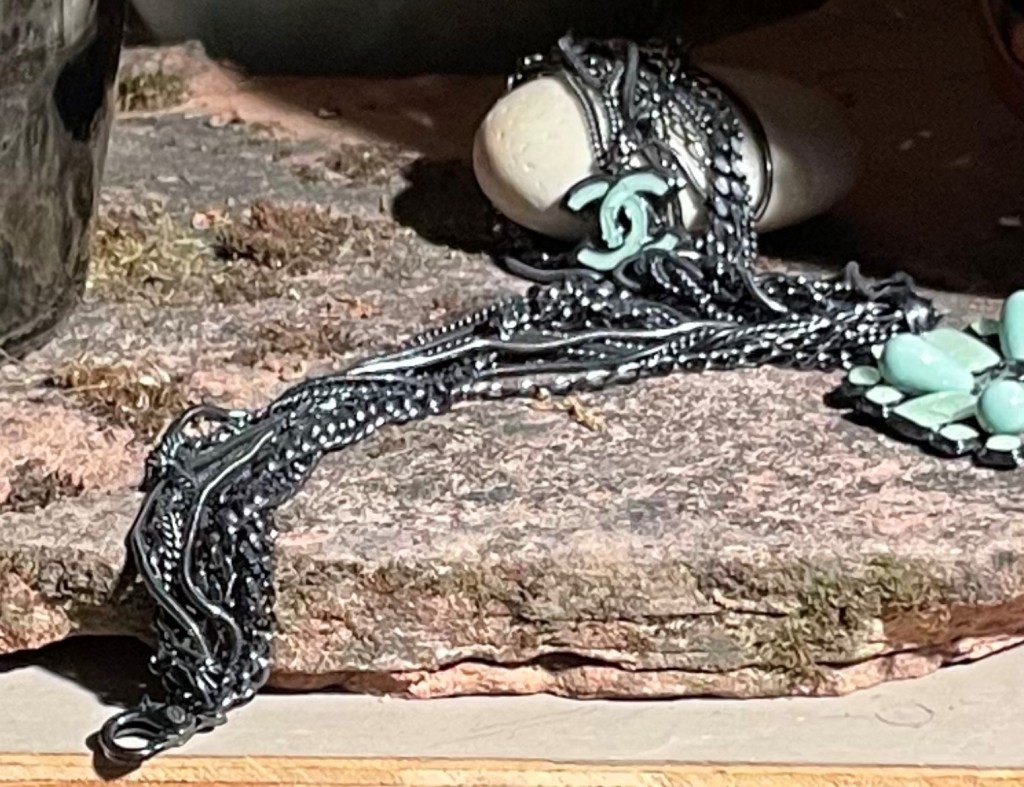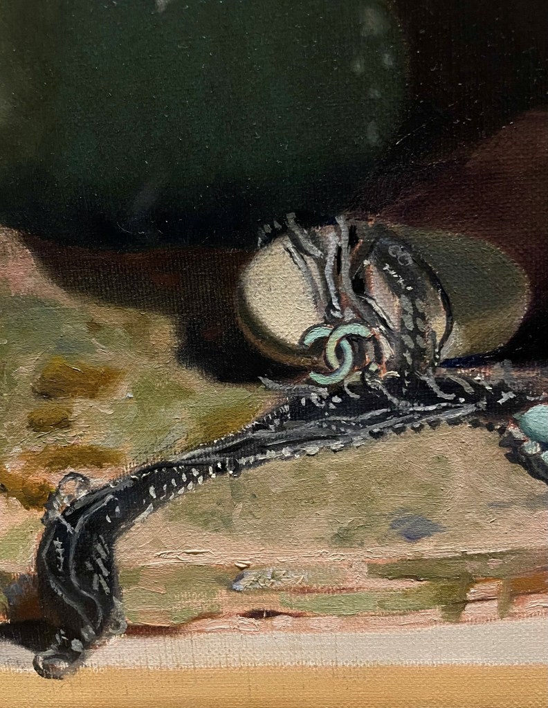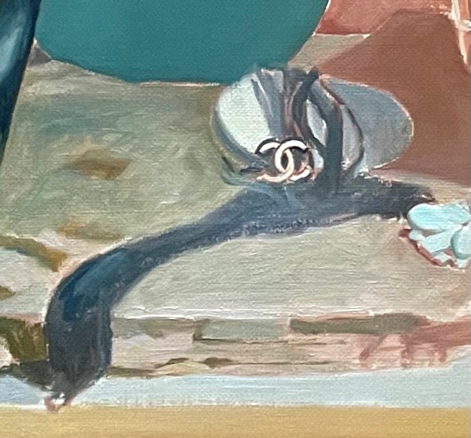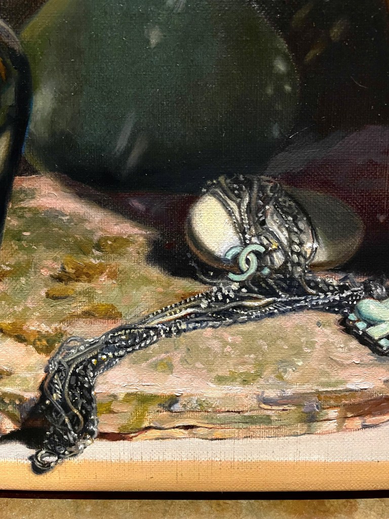 There are more refinements above. As I always find, the more that I’ve seen and painted, the easier it is to see more and paint more. I still need to work on the middle of the chain, under and to the left of the Chanel pendant. Also, I’ll be muting some details to suggest the idea of sparkling light.