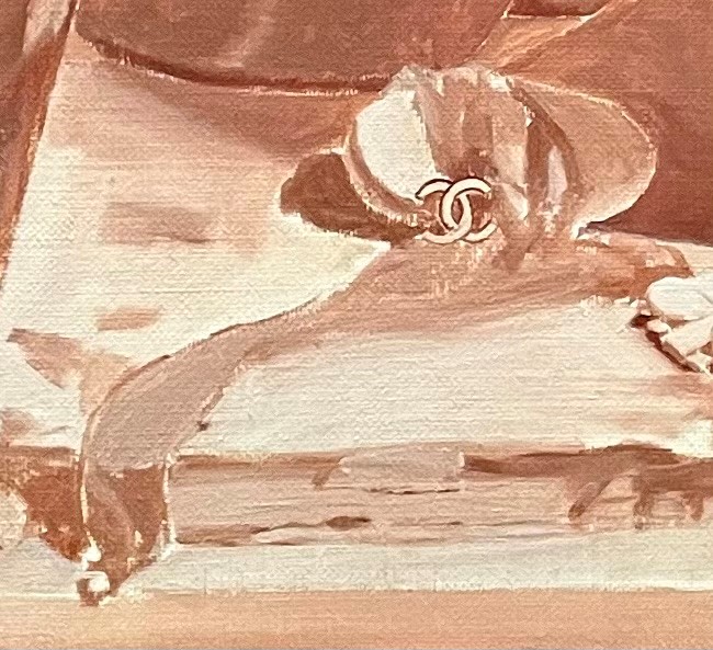 There are more refinements above. As I always find, the more that I’ve seen and painted, the easier it is to see more and paint more. I still need to work on the middle of the chain, under and to the left of the Chanel pendant. Also, I’ll be muting some details to suggest the idea of sparkling light.