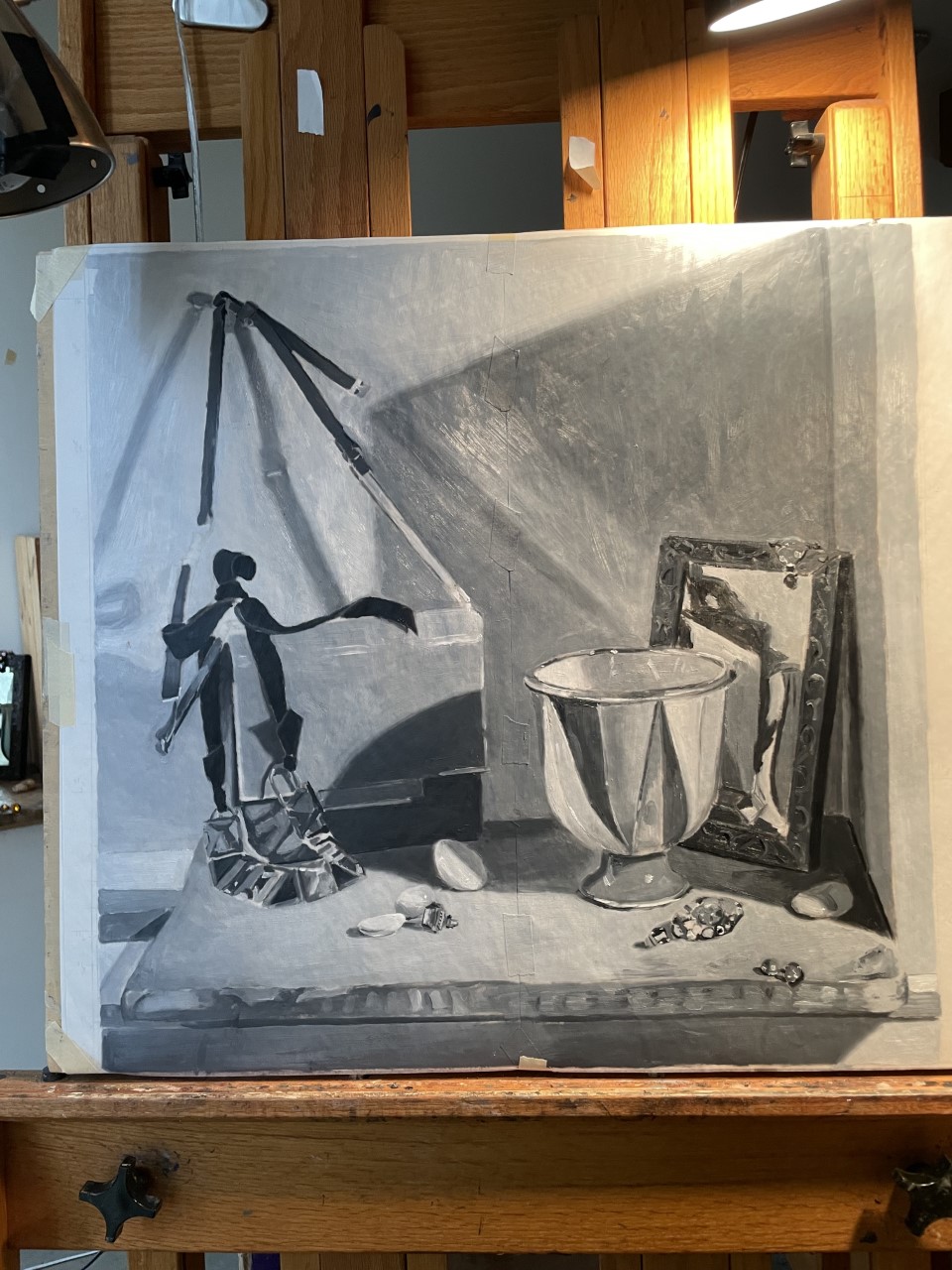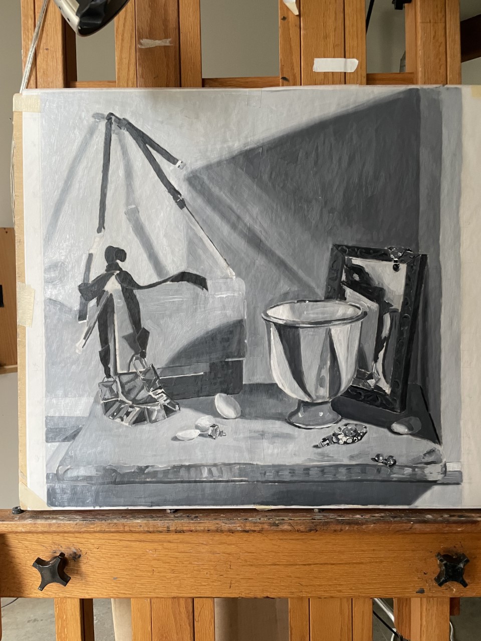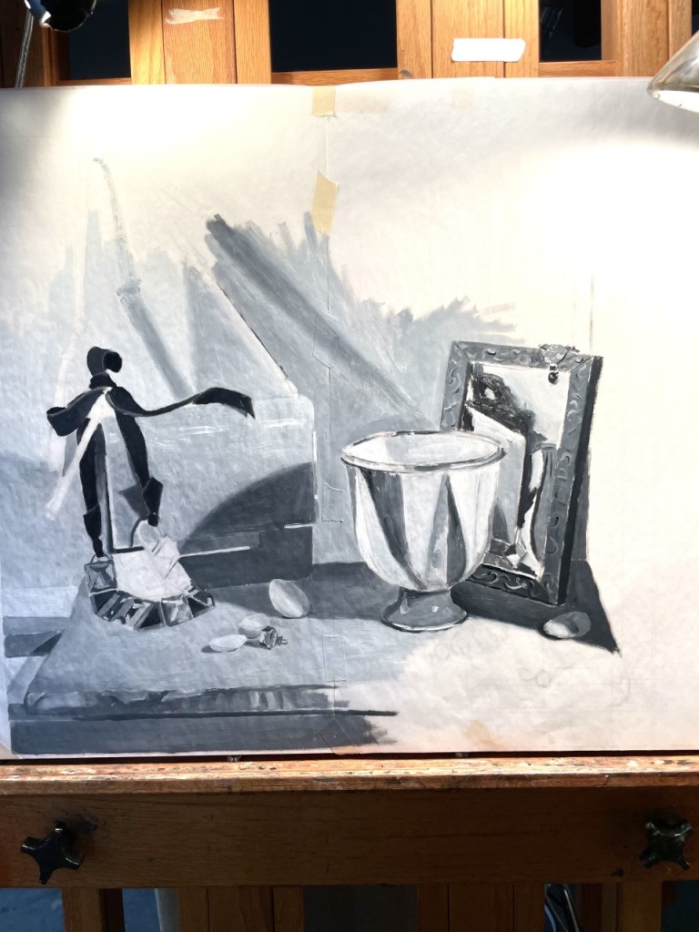 One challenge is that this set-up is near a south window, because I wanted to let in some cool daylight to contrast with my warm spotlight. It looks very different on a rainy day and on a sunny one! Once I get painting, I’ll decide which look I prefer, and do subtle value and color observation on just one kind of day.