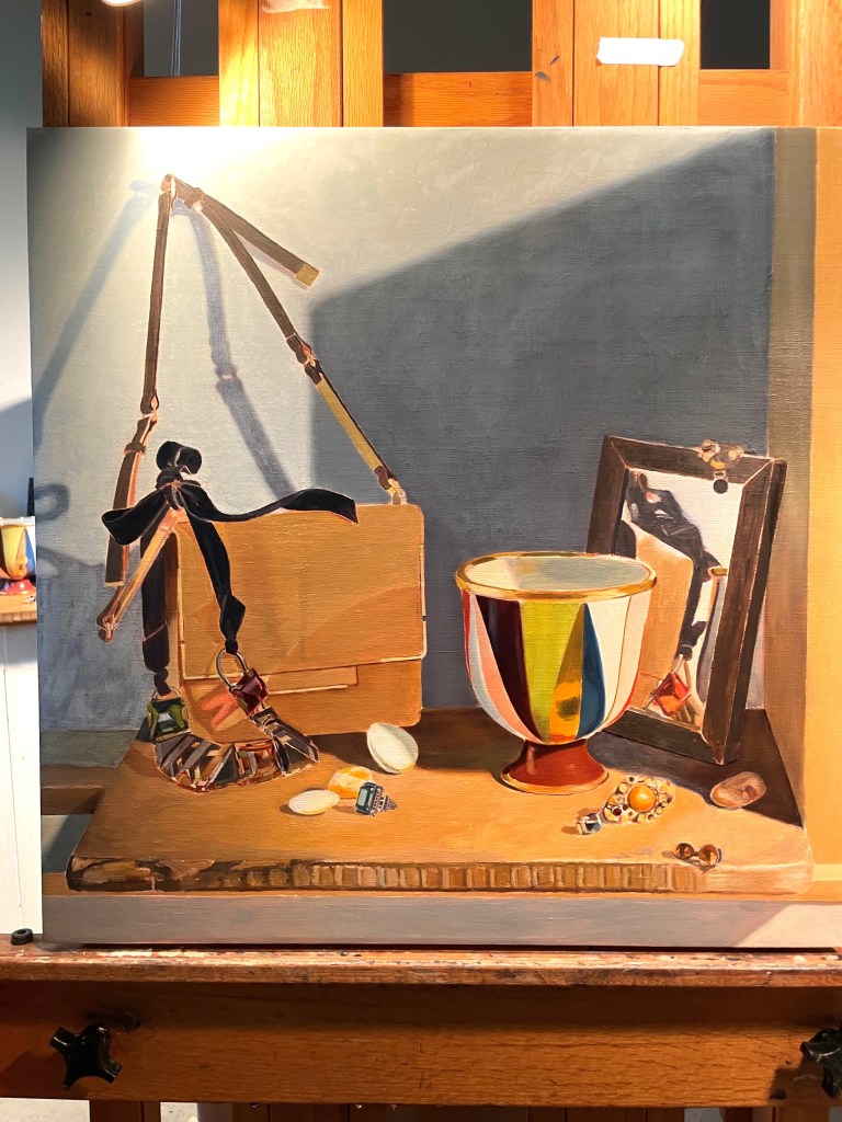 Below, I’ve worked on the vase. I corrected some shapes, glazed the purpley/brown area darker, and corrected the value on on the left side. I glazed in the shadow cast on the foot from the body of the vase.