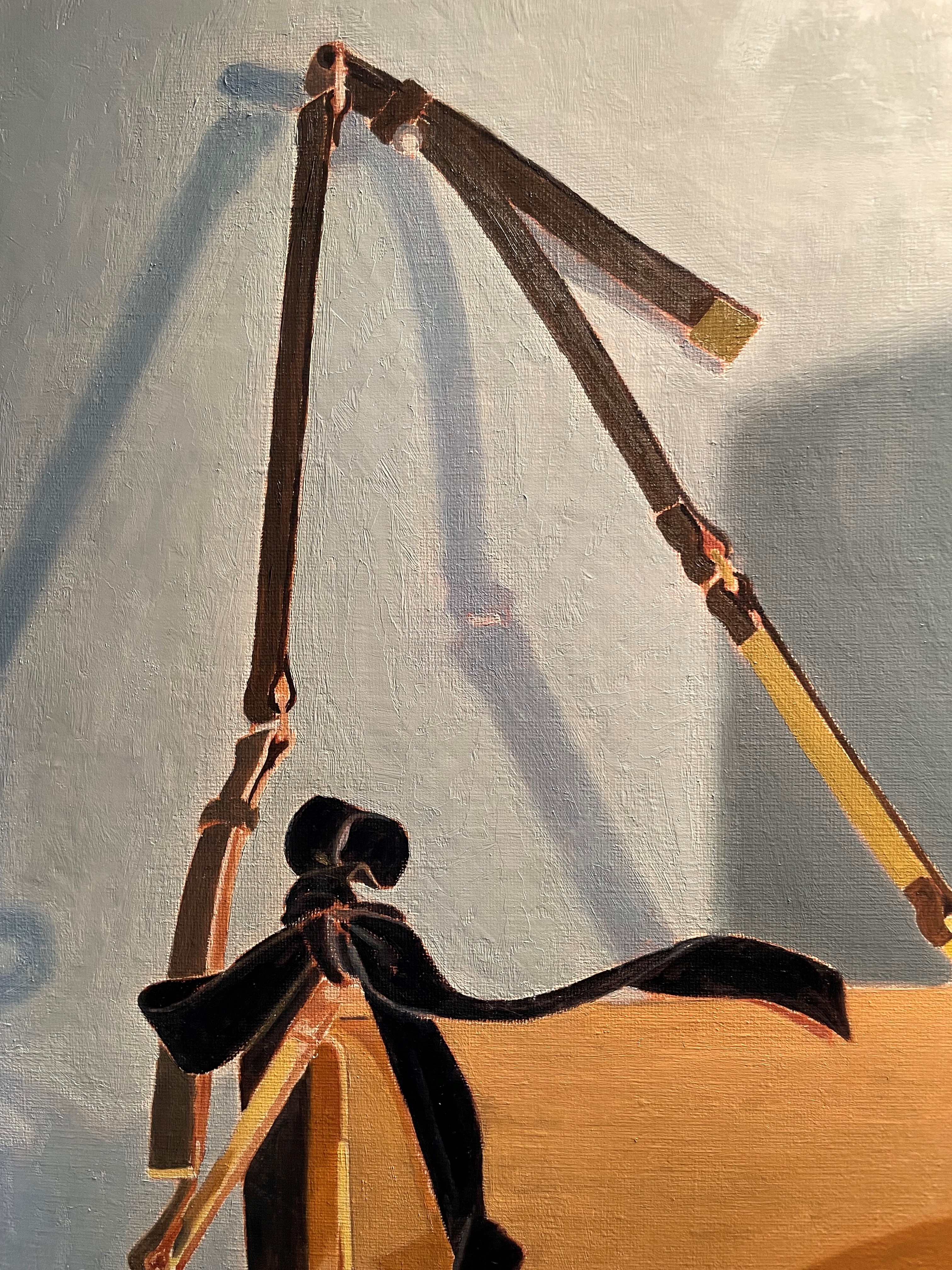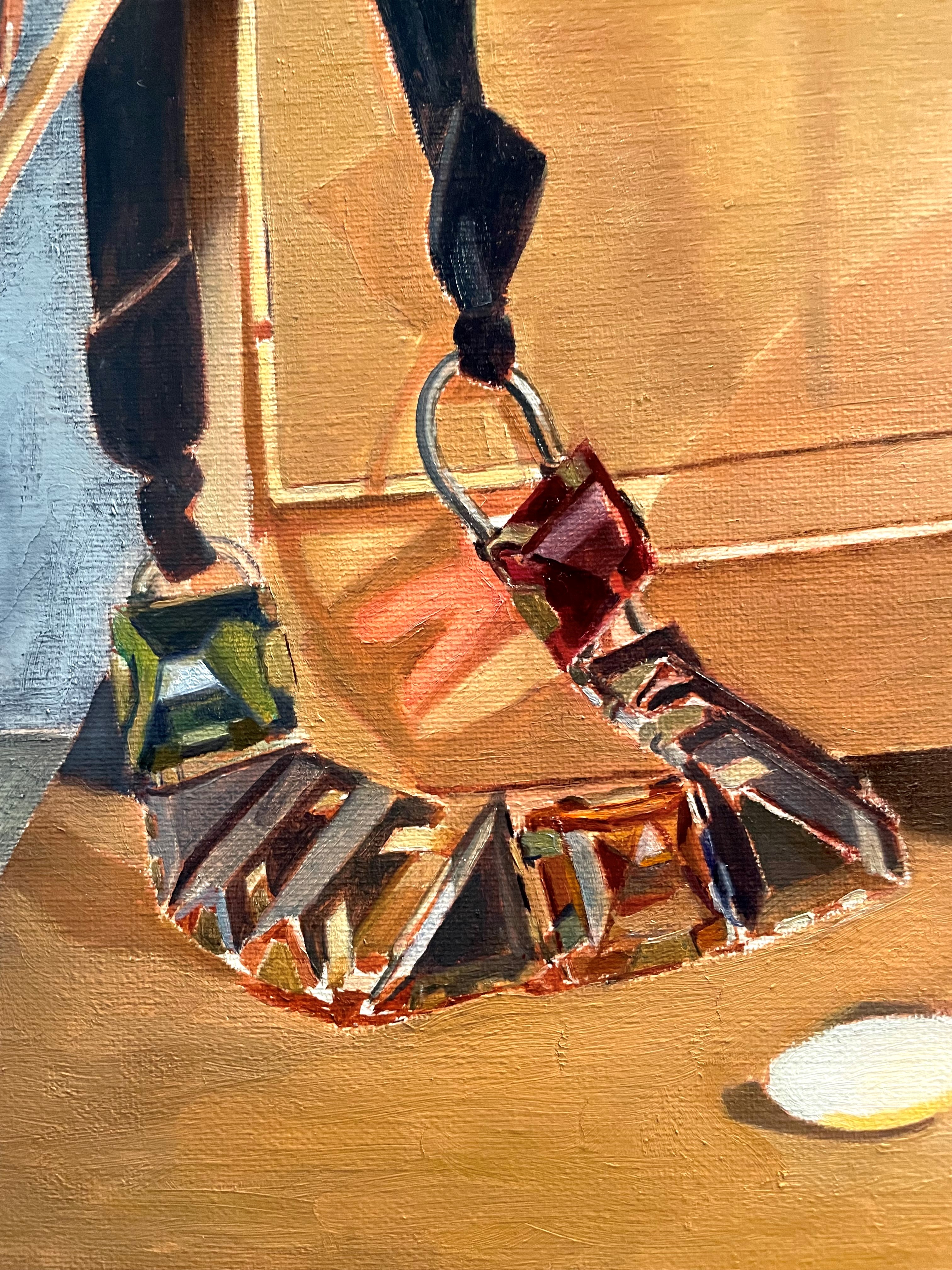 This canvas is large and it takes a lot of time and paint to cover it! Below, I’ve finished the first layer on the rest of the strap, again painting it darker than it will be to allow me to scumble over it later. I refined the shadow on the wall a bit. In this shot, you can see the texture of the wall. I tried applying the paint in a different way from my usual approach. I decided to try using a palette knife, since I wasn’t liking the look of brushstrokes. After, I went in with a brush to get more control of borders, and to smooth out some rough areas. Overall, I like the effect. It looks more like a plaster wall this way.