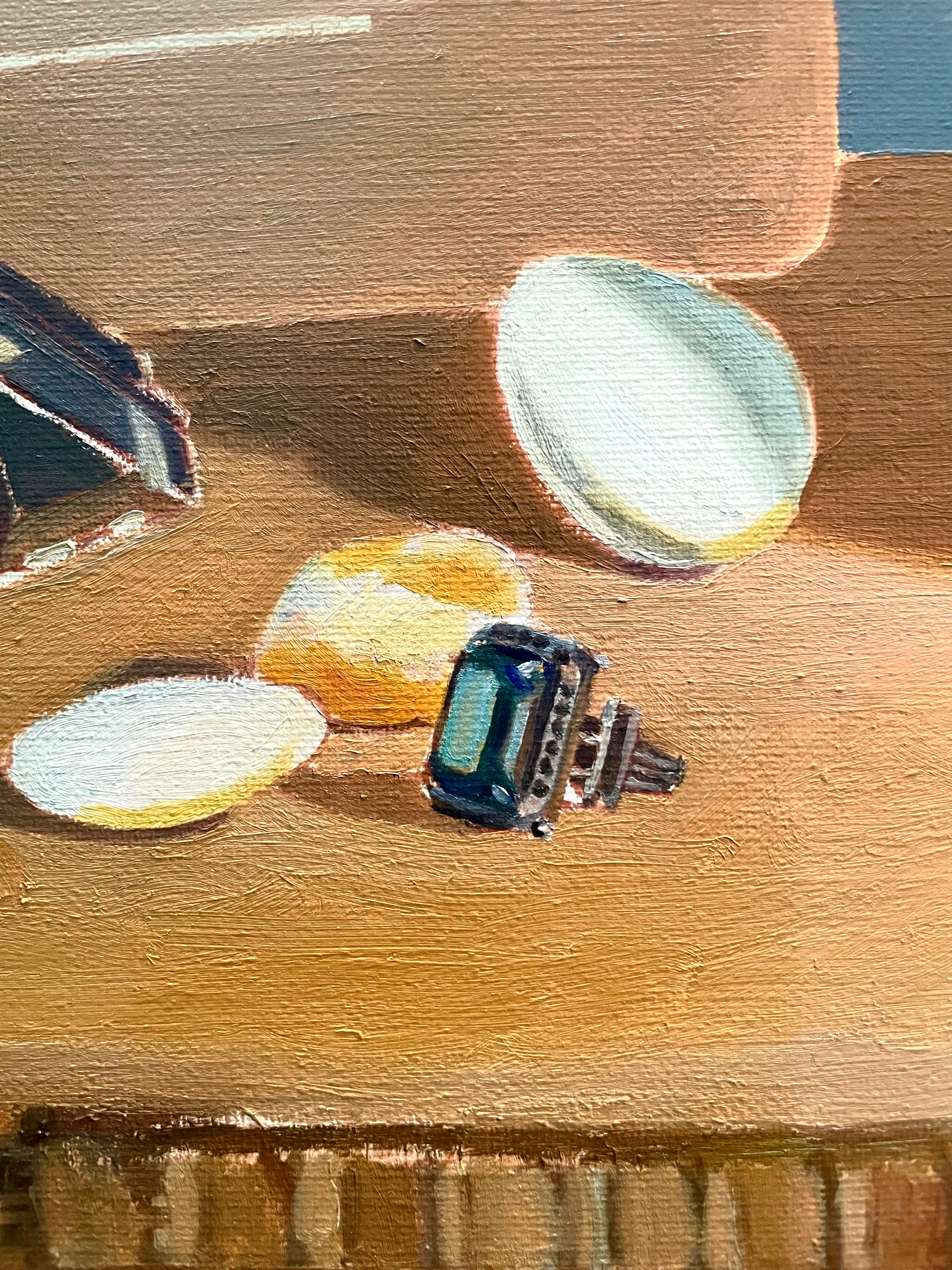Below, I tackled the ring. This was so hard to see that I went up to the set-up and shot a photo for me to look at, so I could understand the structure. Though I never want to paint more than I can see from my easel, knowing the structure actually makes seeing easier. The brain informs the eye. I look at the photo to understand, and then go back to paint from looking at the set-up. I’m not sure yet how I’m going to get the bright green highlight on the ring to glow. Pigments are limited when you compare them to what the eye can see in reality. No paint is as bright as real light! I’ll have to resort to tricks to make that area seem to glow. More on that later in the painting process.