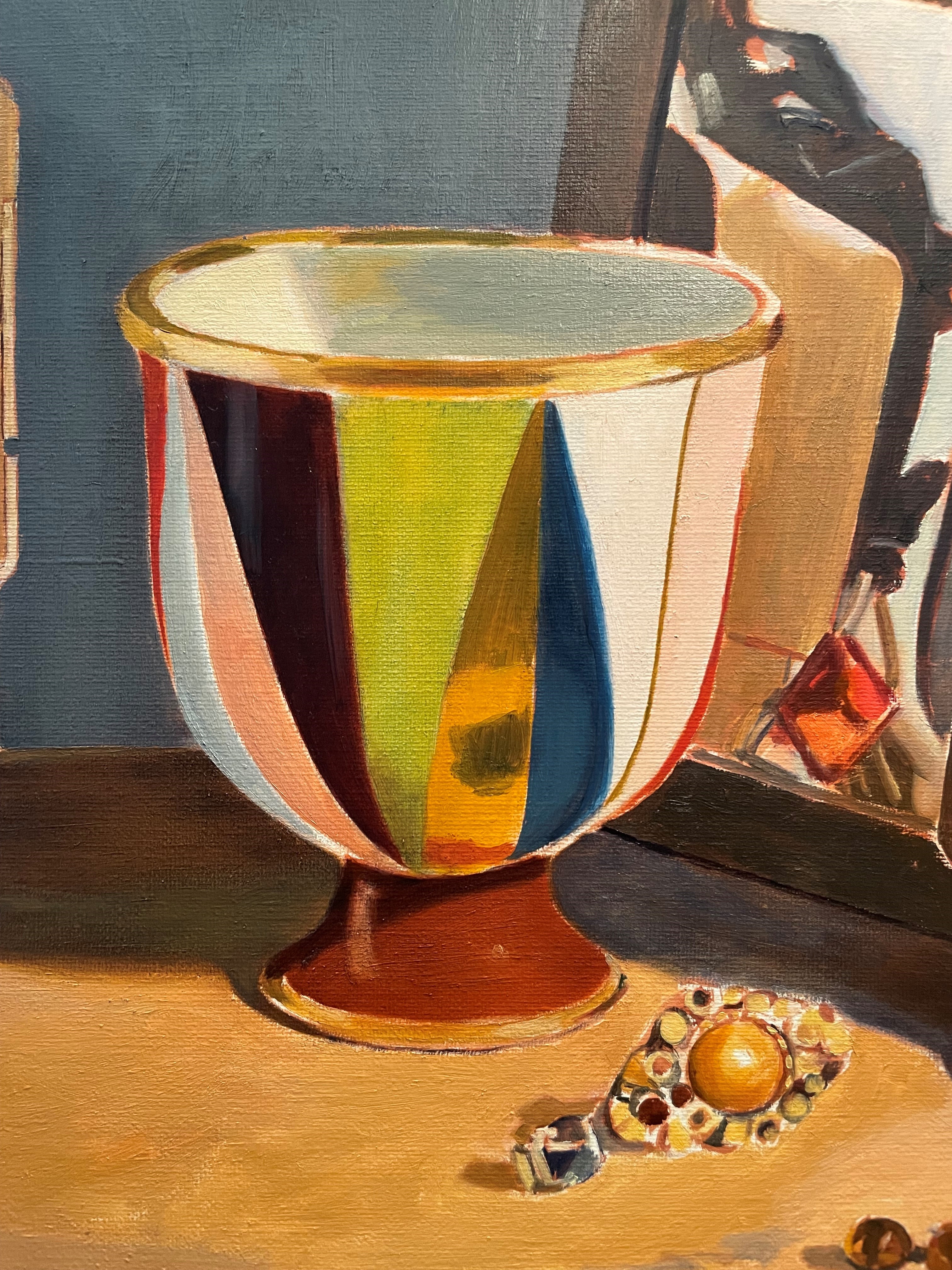 Below, I’ve worked on the vase. I corrected some shapes, glazed the purpley/brown area darker, and corrected the value on on the left side. I glazed in the shadow cast on the foot from the body of the vase.