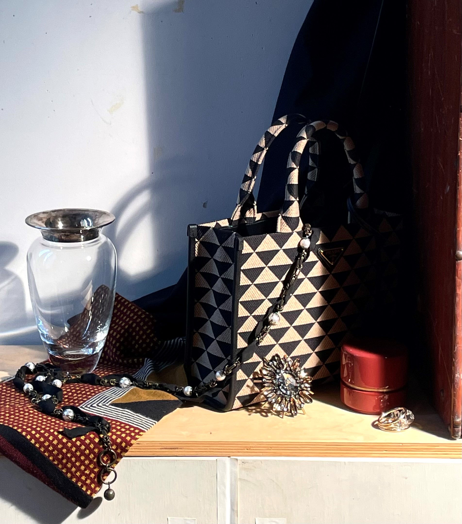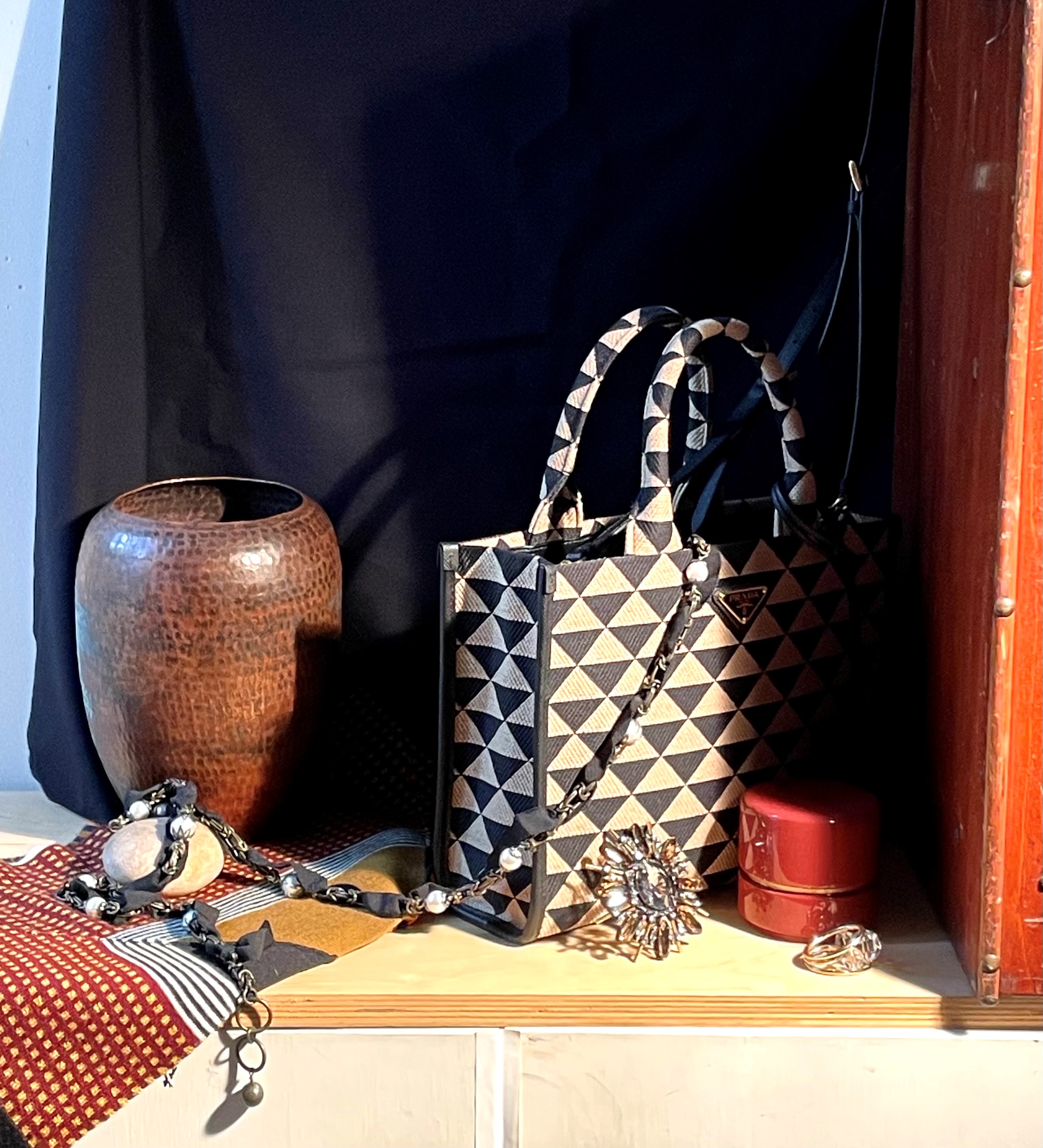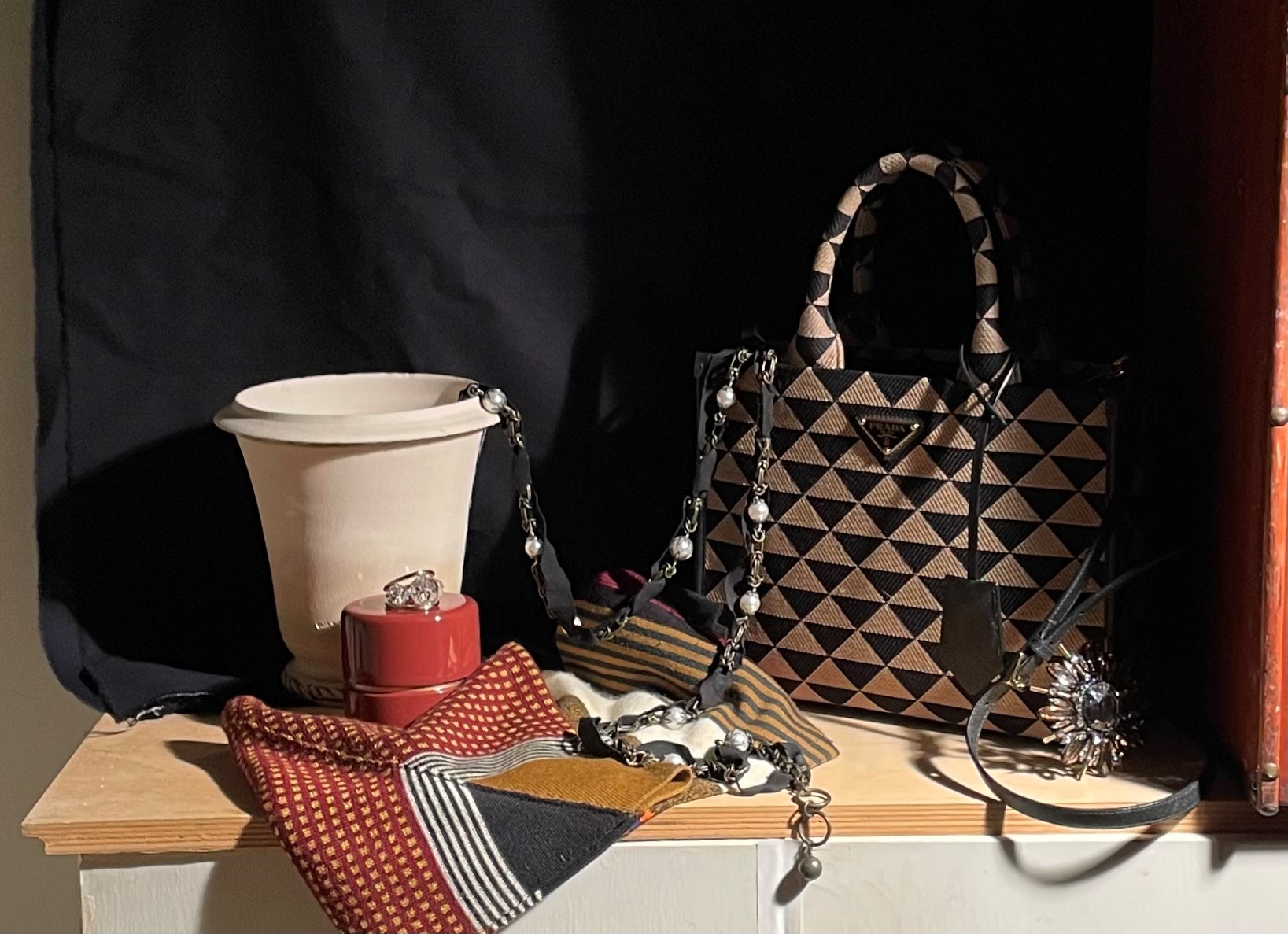 This still life will be the latest addition to my recent series featuring costume jewelry, handbags, and scarves. My starting points were the bag, scarf, and necklace. I liked the way the black triangle on the scarf echoed the black triangles on the bag. I also liked the colors. As a first shot, I simply placed everything on my table with this copper vase, put a drape behind them, and turned on the spotlight. It was promising, but I thought that maybe I needed something in a lighter value to add contrast.