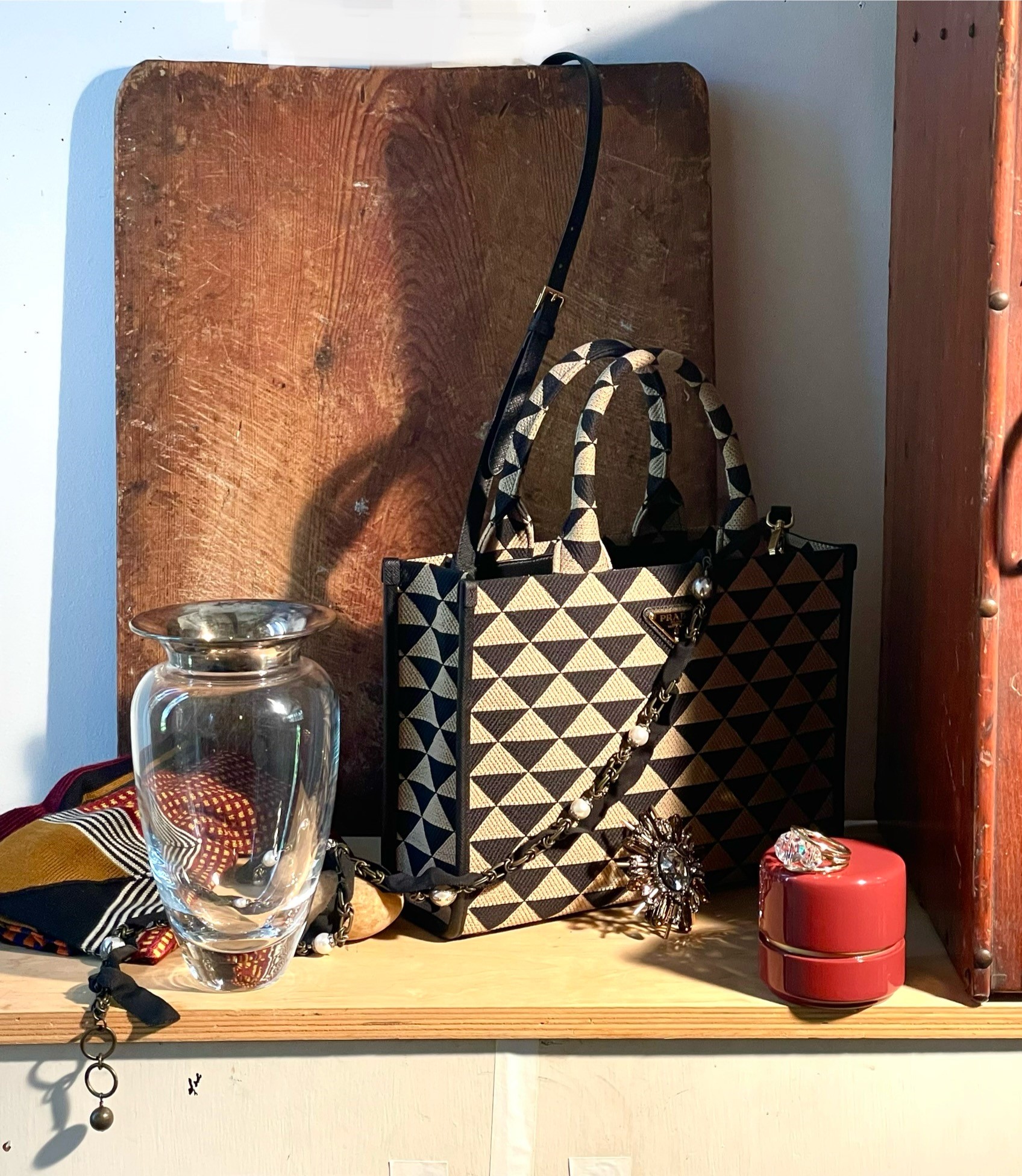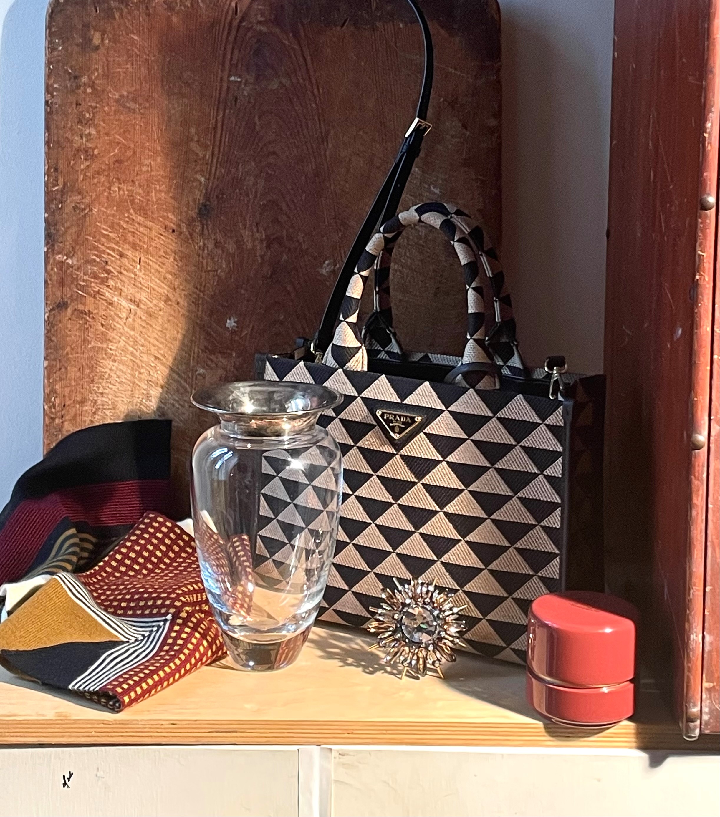 I thought that I liked the set-up with the cutting board more. I put it back, leaving the glass vase over to the left, not in front of the bag, as it was in the last iteration with the board.