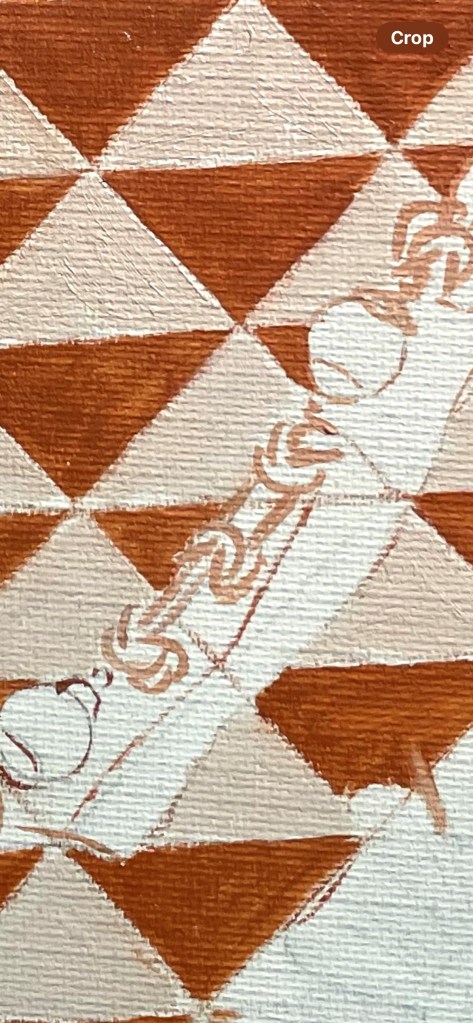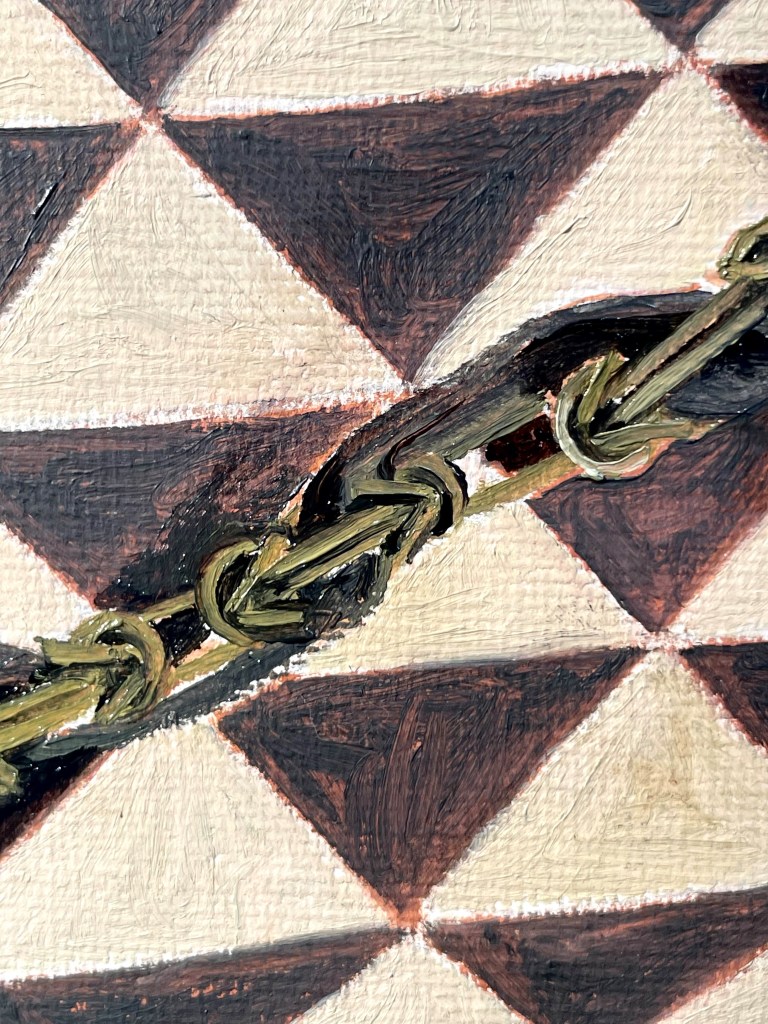 Then I mixed up a few colors: a dark for the shadows, a basic link color, and a highlight. Getting the color right on this was difficult. I wanted it to be a dark muted yellow, but not too green. This is always tricky! Below, the color was too green. I corrected this later. This mix was naples yellow, cobalt blue, and raw sienna. I painted the basic shapes of the links with a #2 sable brush, filling in the dark spaces between and adding just a few highlights. I’ll go back over this many times, so there was no need to work it to a finished state. Working slowly gives me time to check my colors and shapes. If I had worked to completion, and found out that the color was too green, I’d have to do it all over again! This would not be a good use of time.