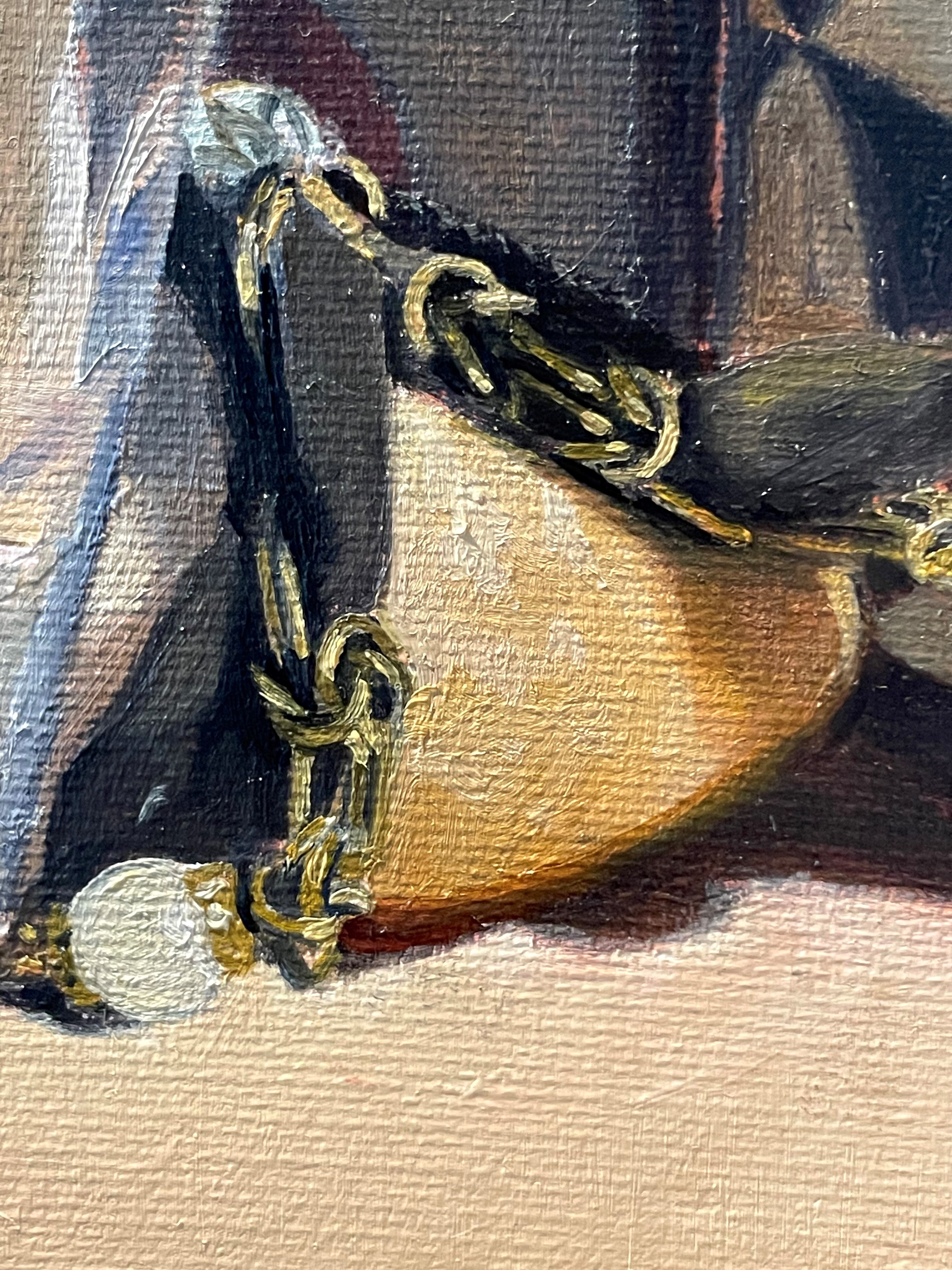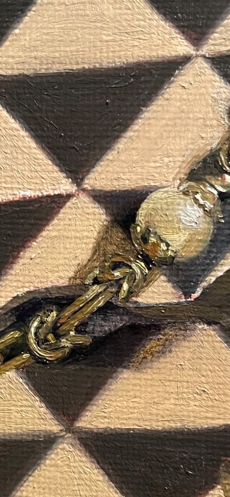 For something as complex as this chain, I didn’t bother to paint it too specifically in the underpainting. Otherwise, I would have to paint the details twice! I just indicated the position of the important links.