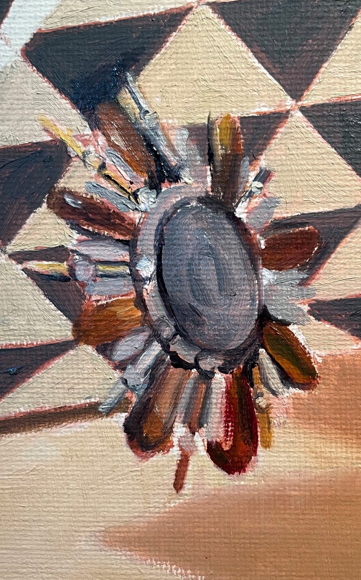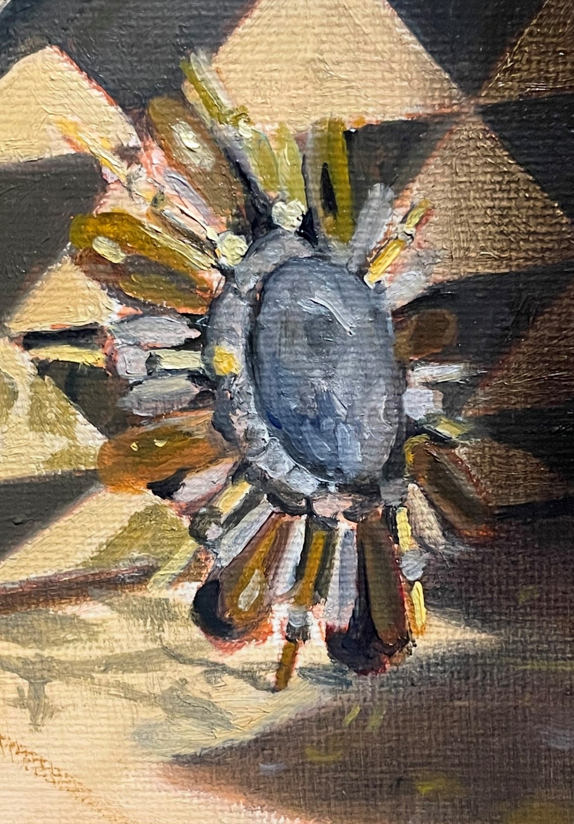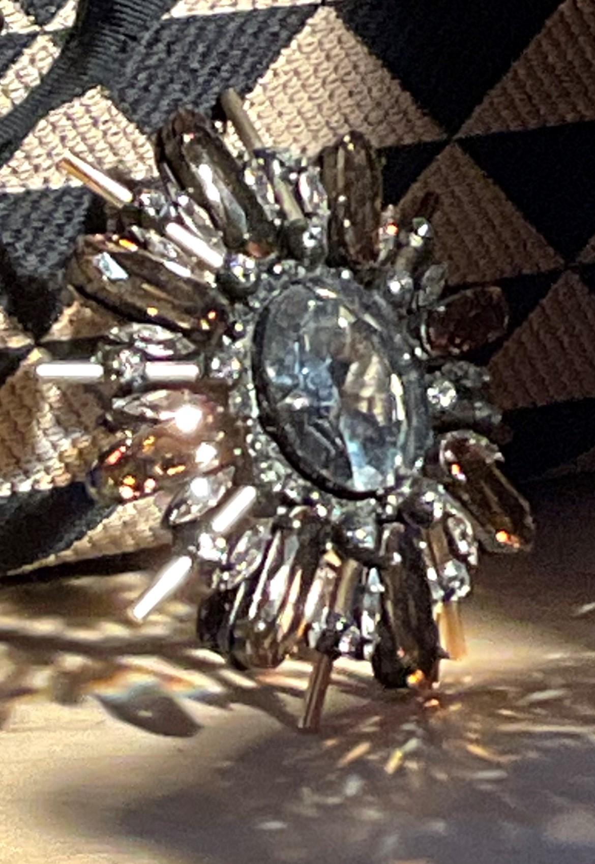 One of the hardest things to paint is a highly reflective surface, such as this crystal brooch in my latest painting. There is a photo of it below. The first difficulty is actually seeing the forms. The reflecting light is so bright that it obscures the forms. Sometimes I take a photo with my phone so that I can see the shapes more clearly. A photo, however, distorts the colors, reflections, and even shapes, so it’s not reliable to paint from. It can be helpful, though, just to make sense of what you’re seeing, especially in complex objects like this.