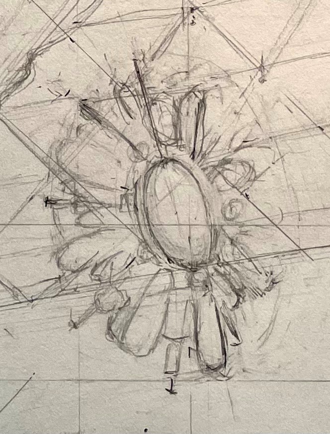 First, I do a very rough pencil drawing to locate the various shapes. I don’t go into a lot of detail, though. Most of it would be lost after the underpainting and first layers of paint, so I save myself the trouble of getting it all down now.