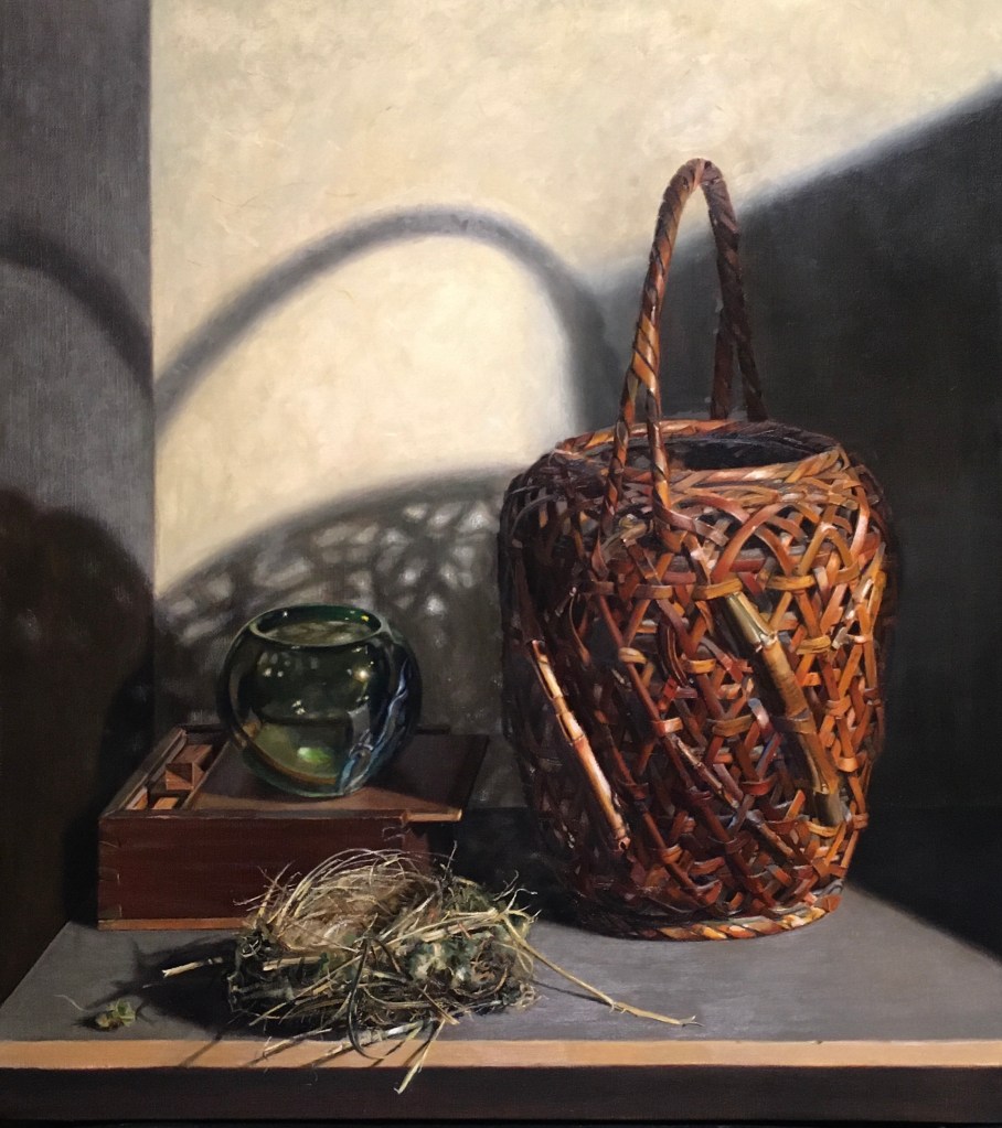 Looking at the painting now, I think that it works fairly well. I might want to darken the shadow on the lower left-side wall and add even more highlights to the light side of the basket and the nest. Perhaps the dark side of the basket needs to be a bit darker. I haven’t decided yet. I’ll live with it for a while.